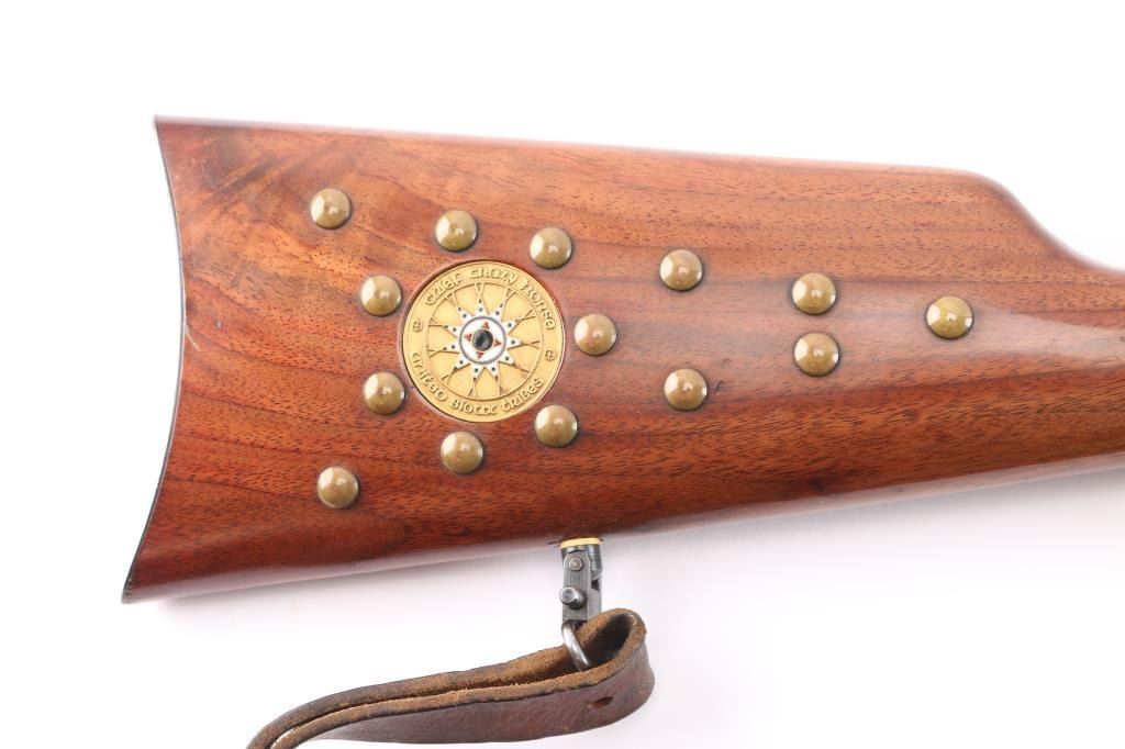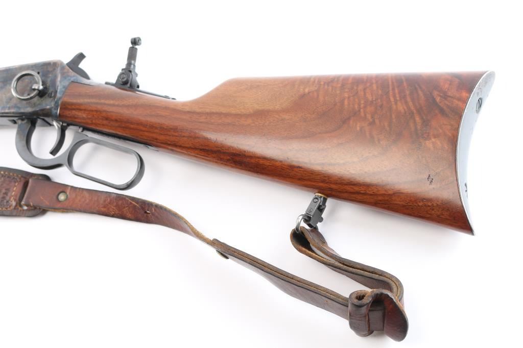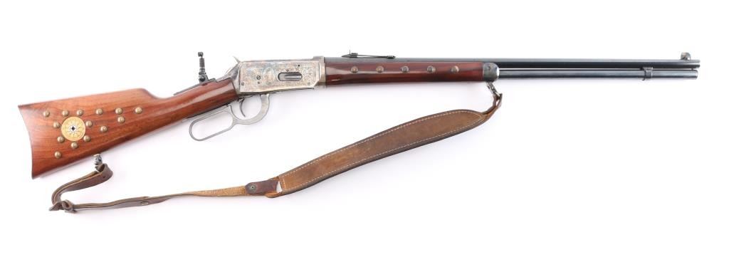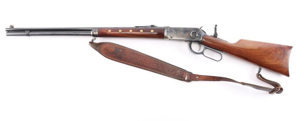 SN: CCH18638. Limited edition commemorative lever action repeating rifle celebrating Lakota warrior Chief Crazy Horse. Chambered in .38-55 Winchester and manufactured circa 1983 with only 19,999 reported to have been produced. Chief Crazy Horse is one of the most notable Native American warriors, he fought in several important battles of the Black Hills War including the Battle of the Little Bighorn where he led his party to victory. Configuration: blued 24" round barrel, full-length magazine tube, dovetailed blade front sight with bead top, elevation adjustable rear sporting sight and adjustable peep sight installed on tang. Saddle ring, smooth trigger with beveled edges, serrated hammer spur, saddle ring, gold filled roll stamp engraved "Chief Crazy Horse" on right barrel, images of Crazy horse. Buffalo hunt, battle names, etc. on the case hardened receiver, brass tacked smooth deluxe walnut semi-beavertail forend with satin finish, metal forend cap with integral sling lug, and straight grip shoulder stock with brass tack decor, curved metal buttplate & inlayed commemorative medallion on the right side. Rifle exhibits approximately 99% original finish showing very little wear. Action is crisp, the bore is excellent/bright and the wood stocks are fine. very nice tooled brown leather sling with embossed image of stag attached.