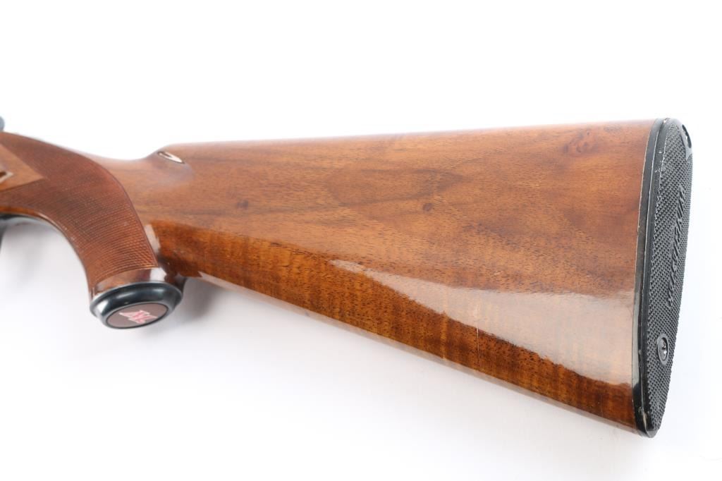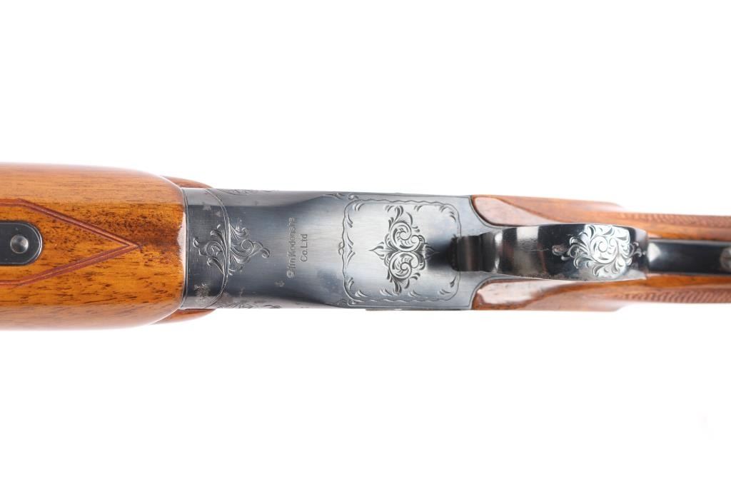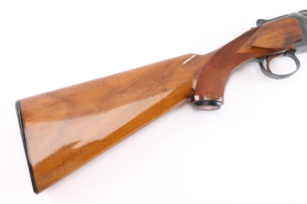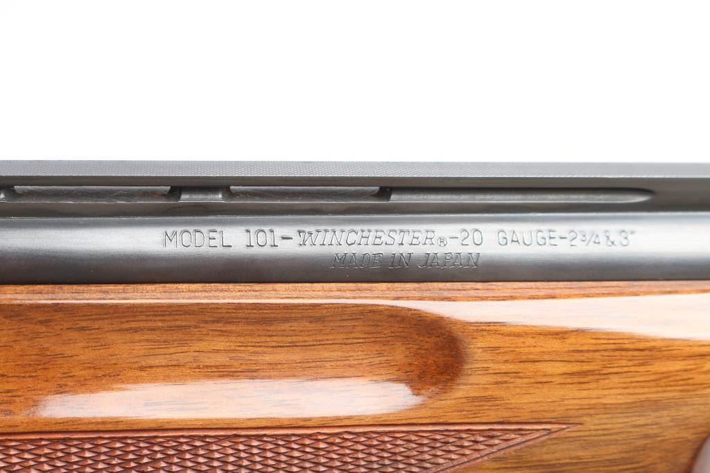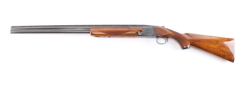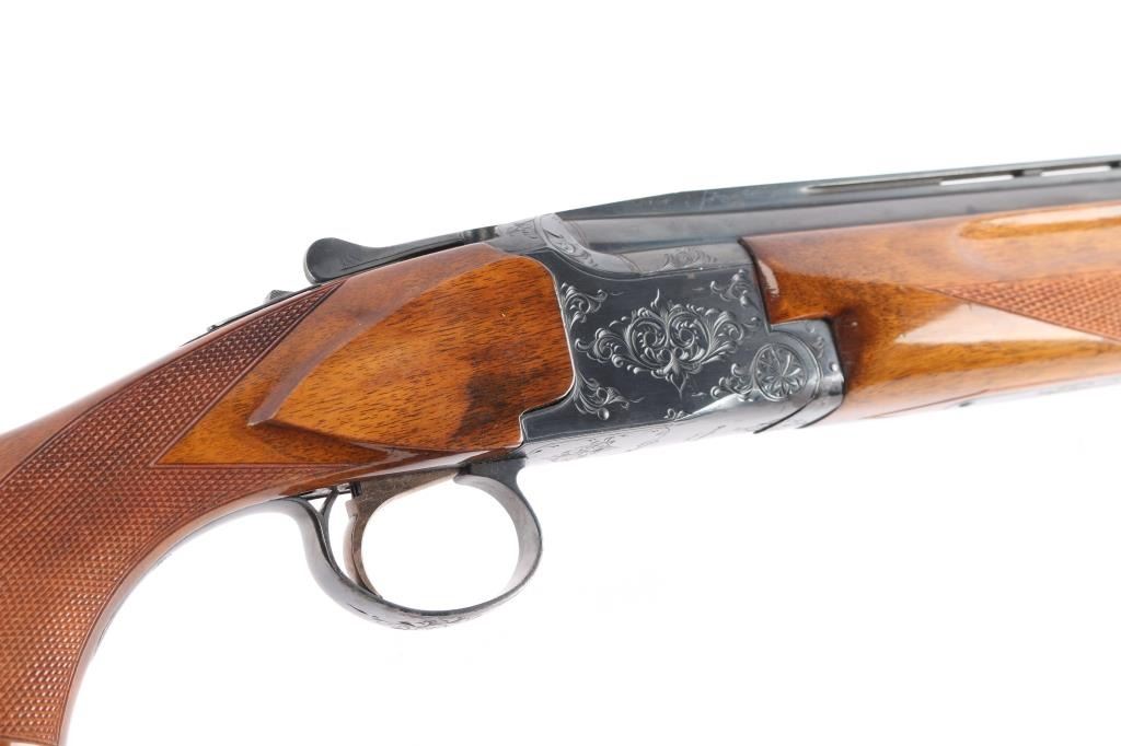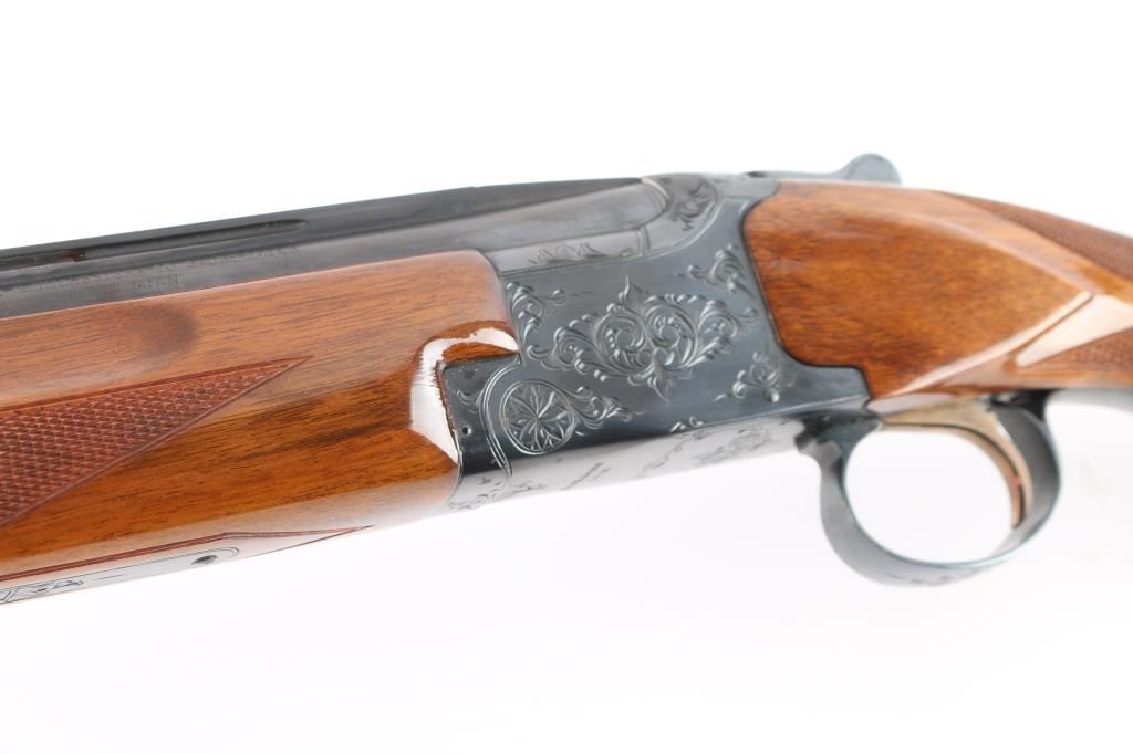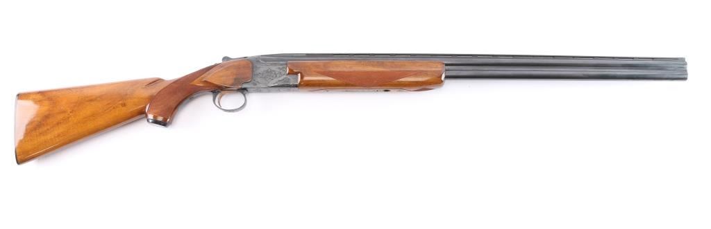 Field grade O/U. Break-top action, boxlock. Made by Olin Kodensha Co. Ltd. in Japan for Winchester. 28" barrels with ventilated, checkered, full length sighting rib with Trius clear fiber-optic sighting bead. 2 3/4" chambers. Choked Full over Modified. Floral/scroll engraved receiver. Blued finish. Combination thumb safety/barrel selector on tang. Auto ejectors. Checkered high gloss walnut, pistol-grip stock/forend. factory black plastic buttplate, steel grip cap. Bores are excellent, bright. Barrels lock-up tight. Blued finish is about 98% . Wood is excellent. This shotgun has become a classic over the years. Produced 1966. LOP-14".