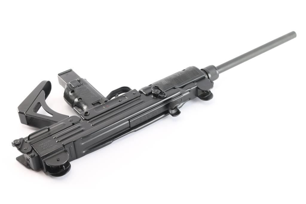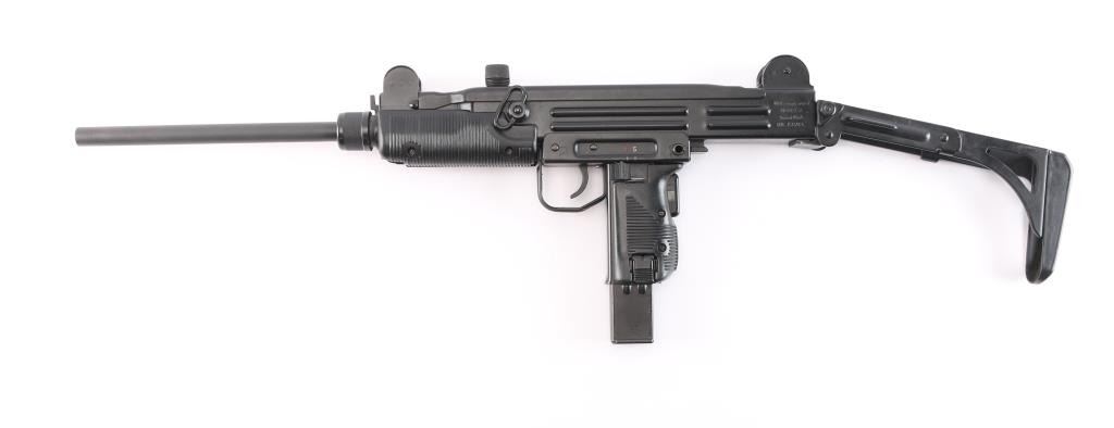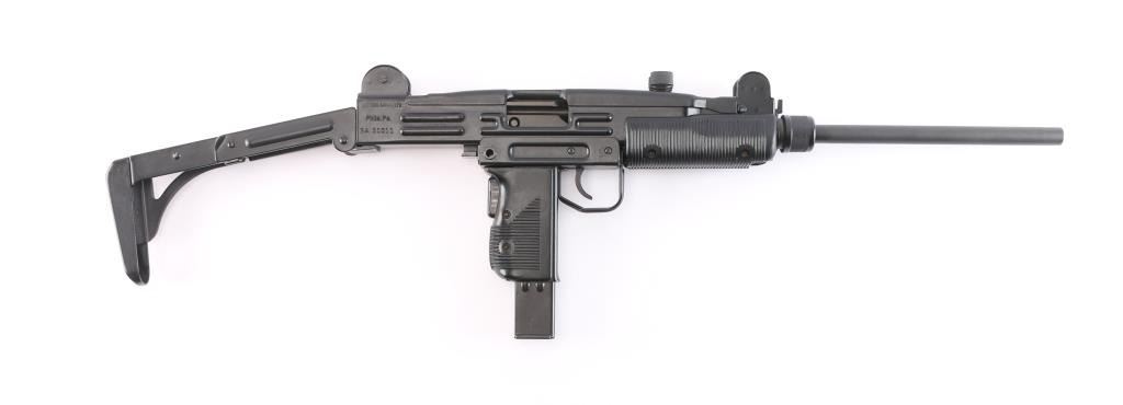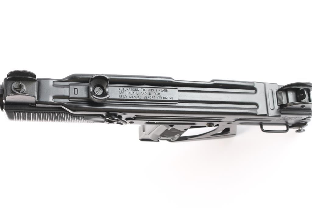 Semi-Automatic version of the Uzi sub-machinegun. Made is Israel by IMI, and imported by Action Arms Phila. Pa. (Left receiver) Imported 1980-1983. 16" removable barrel with protected adjustable front post, and flip rear sights Top charging handle, collapsible stock. Safety selector on left grip, with grip safety. Black enamel flat black finish with black plastic ribbed furniture. Bore is pristine, metal finish is excellent. Furniture is very good. Comes with one 25-rd steel magazine.
