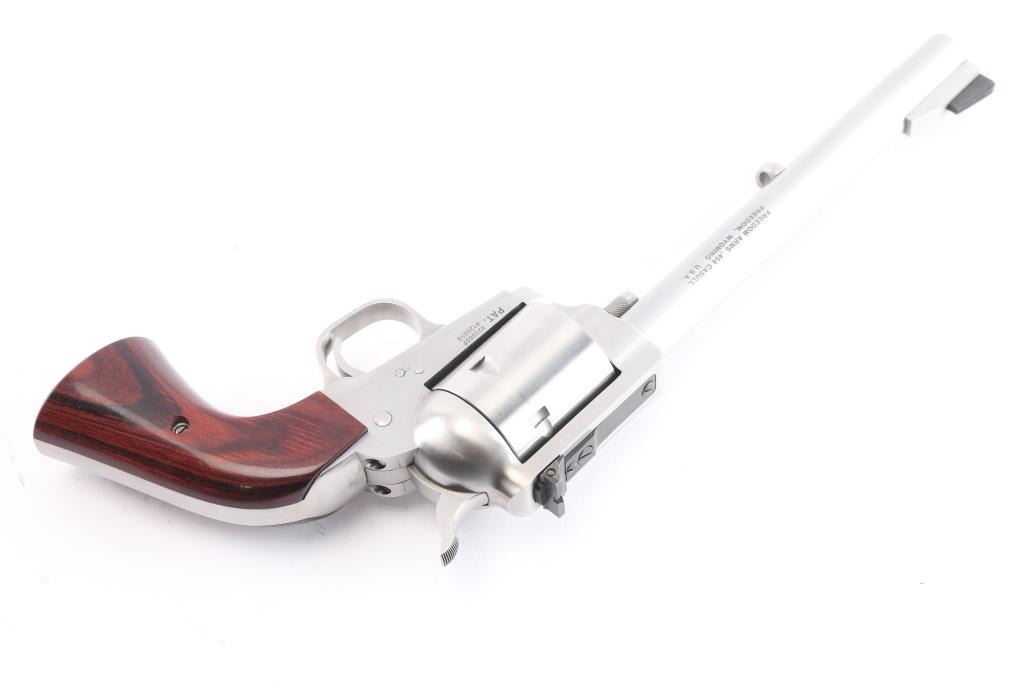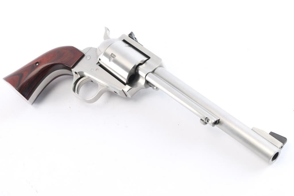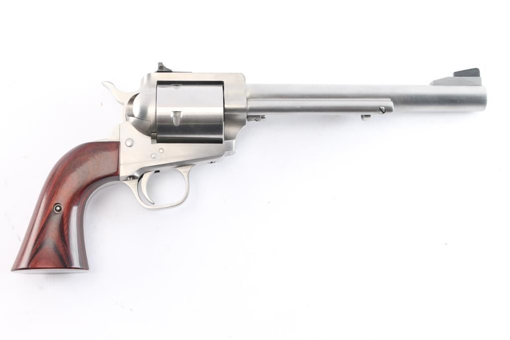 The Premier Grade has a bright, brushed finish with more attention to cosmetic details, rear sights are screw adjustable for elevation and windage, grips are laminated hardwood with resin bonding. Single action 5 shot heavy duty revolver. Stainless steel construction, unfluted cylinder, stainless 7 1/2" barrel with serrated ramped front blade, & adjustable square notch rear sights. Consignor had the safety factory upgraded with receipt for the work included. Some very minor rubs otherwise revolver is in like new condition. Comes with form fitted factory box with matching label in cardboard box, factory reloading and ballistics paperwork.