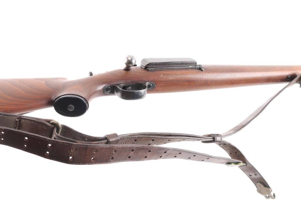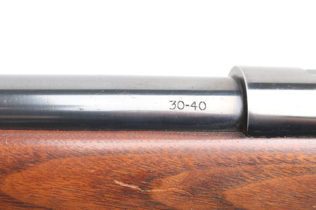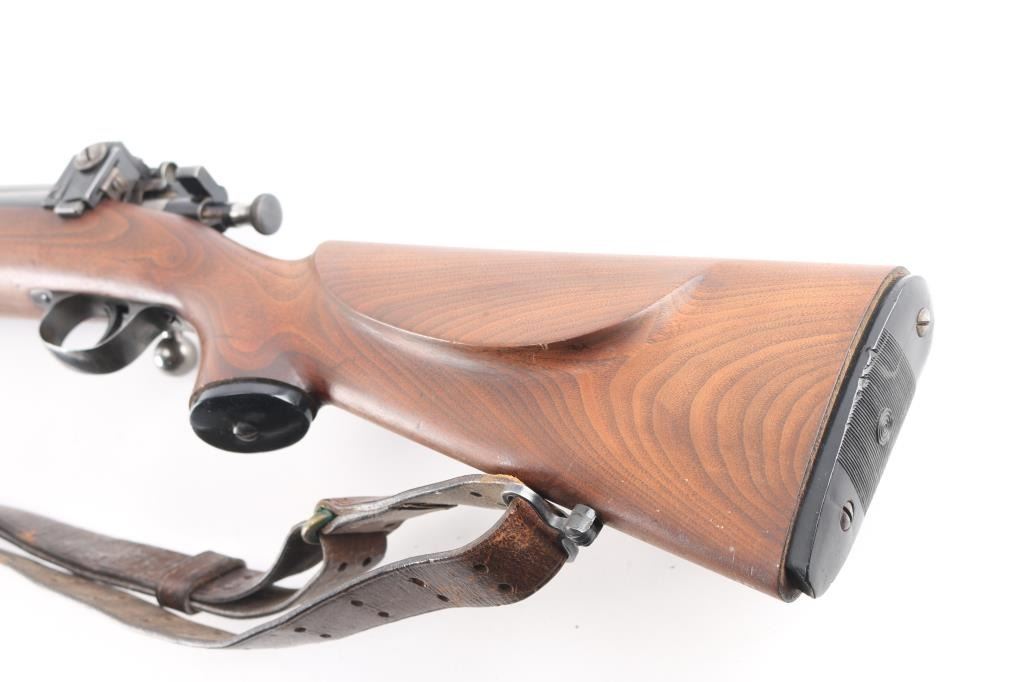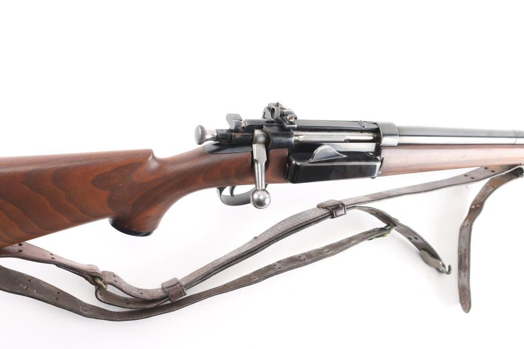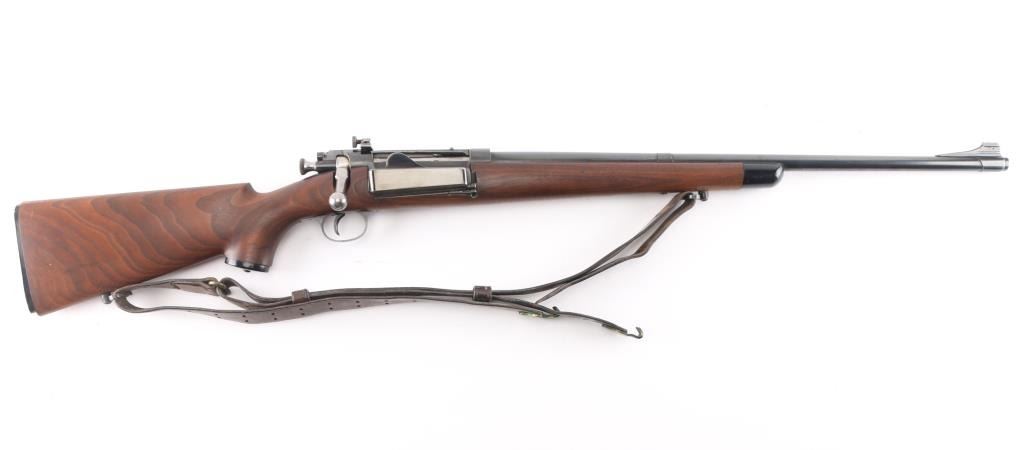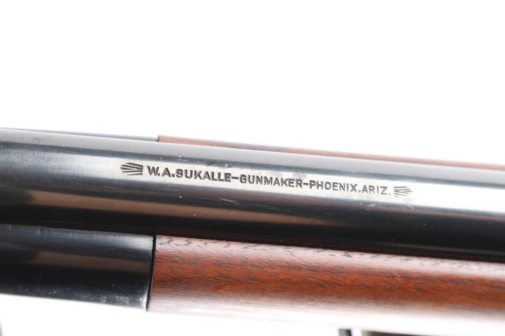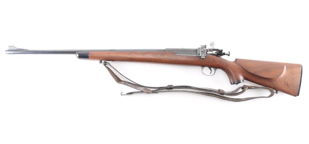 “W.A.SUKALLE-GUNMAKER-PHOENIX,ARIZ.” marked custom rifle made from a Spanish-American war era, U.S. military rifle. William Sukalle, a renowned machinist, barrel maker & gunsmith. Jack O’Conner accounts his experience with a Sukalle rifle barrel in the article “Forty Years with the Little 7mm”. Barrel has been cut down to 23 1/2". Redfield banded front sight base added w/ brass bead top blade. Rear sight removed, and Redfield peep sight mounted to the side of receiver. Bore is excellent/bright. Action is smooth, and locks up tight. Reblued finish is excellent with minor edge wear. Stock is figured walnut with right handed cheek, black synthetic grip cap, forend tip & buttplate (chip @ toe). Wood is proud of the synthetic components. Vintage M1907 issue sling attached.