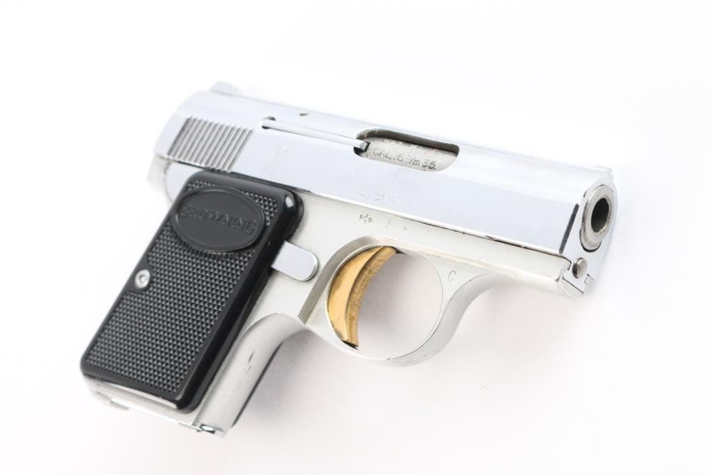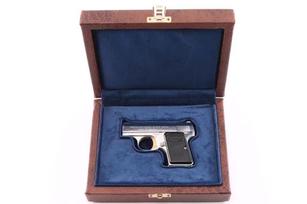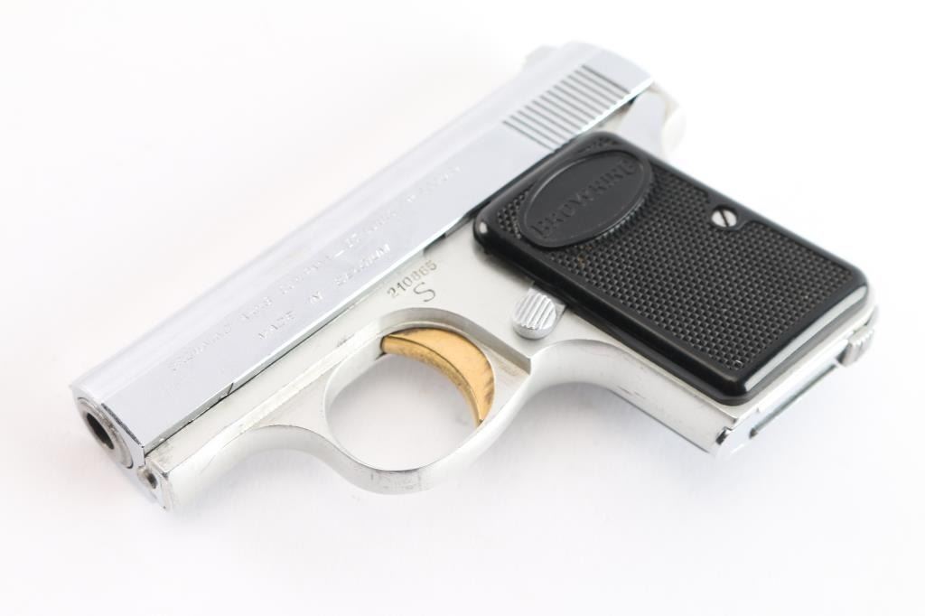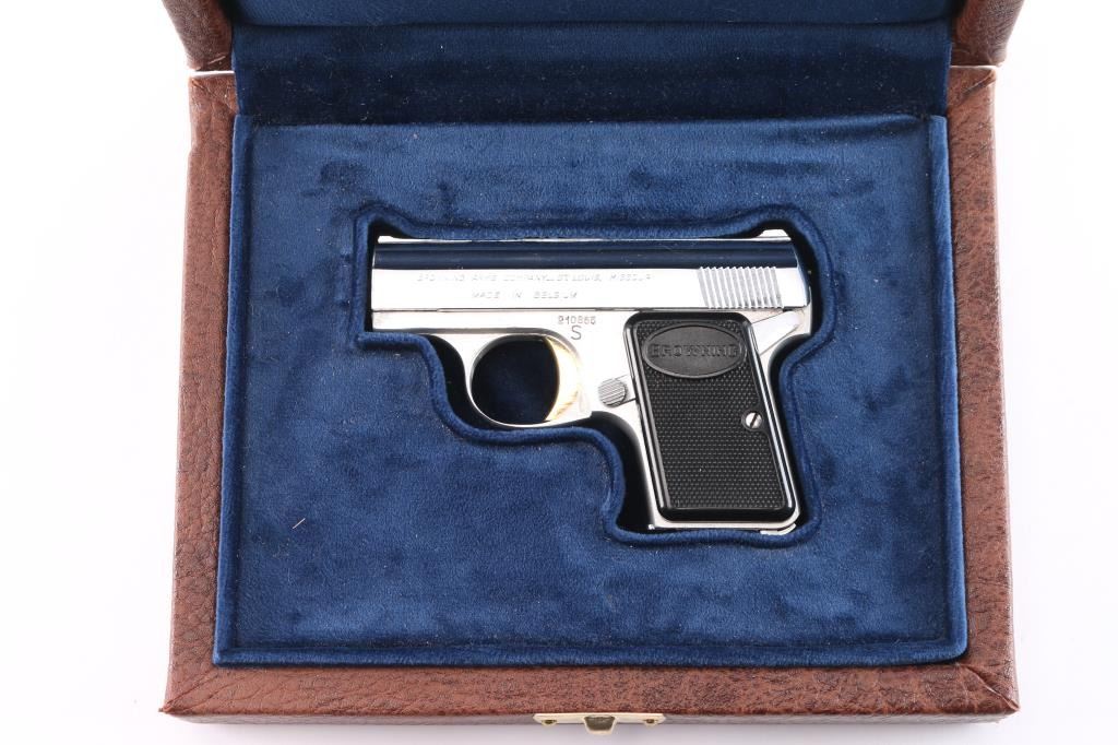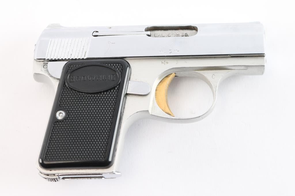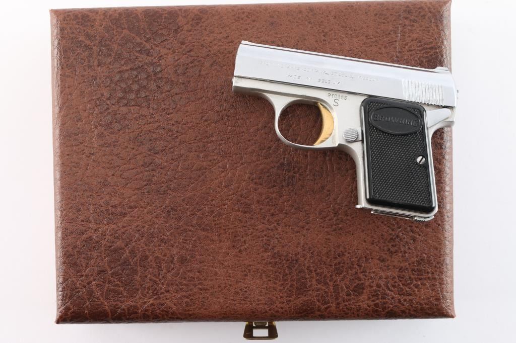 ‘Lightweight’ Striker fired semi-automatic pocket pistol chambered in 25 Auto. Manufactured in Belgium by Fabrique Nationale circa 1960 and imported/marketed by Browning Arms Company of St. Louis, MO. Features a nickel-chrome finished slide with integral matted rib & diminutive fixed sights, 2" barrel, gold smooth curved trigger, aluminum frame with thumb safety on the left side, heel magazine release, “FN” marked 6 round magazine and checkered black plastic grips with “BROWNING” on the tops. Includes a custom brown leatherette wrapped presentation case with blue velvet lined French fitted interior. Pistol retains approximately 97% of its original finish showing scattered handling marks / scratches, minor dings, and some flaking on the front of the slide around the barrel. The action is mechanically sound, the bore is excellent, and the plastic grips are excellent.