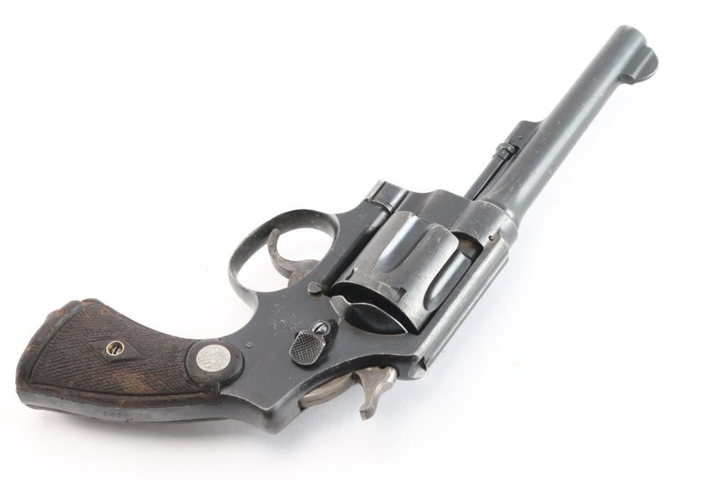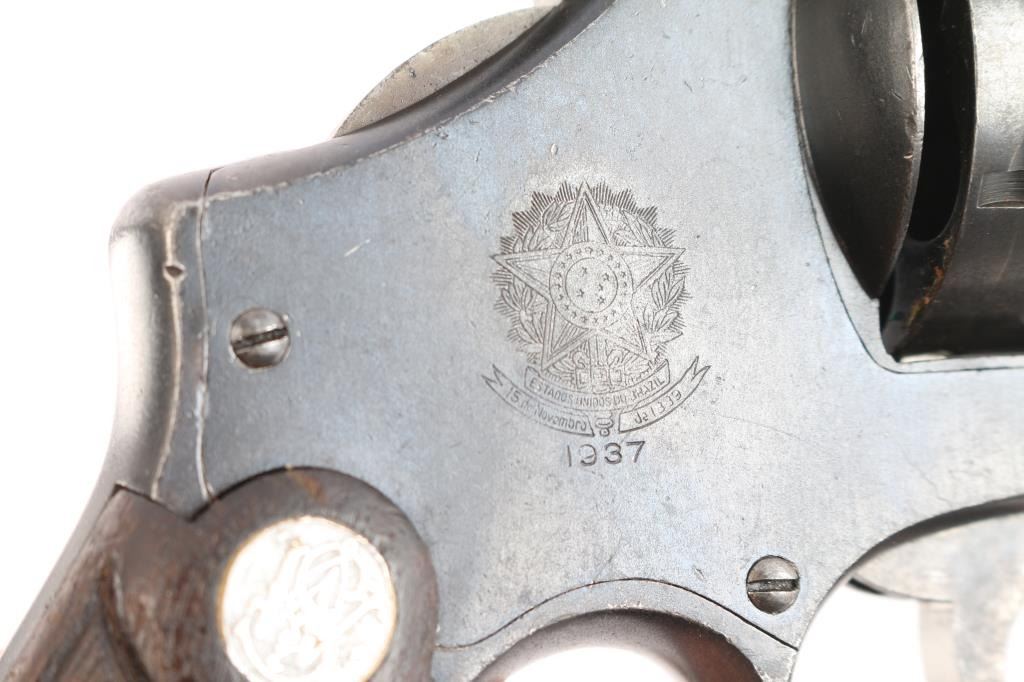 Brazilian contract large frame double action revolver, made in the USA. Re-imported with importer marks under barrel. Uses moon clips, or half moon, etc, or 45 Auto Rim cartridges. Features blued finish, 5.5" barrel, half moon front sight, fixed rear notch in top strap, "N" square butt service frame, lanyard ring at butt, checkered wood S&W medallion commercial style grips. Serrated narrow trigger and knurled narrow hammer. Brazilian crest on right side of frame. Refinished, with some small blemishes under the new finish. Shows edge losses, handling marks, losses at muzzle, slight loss of depth to S&W frame logo. Grips are fair to good showing much rubbing wear from handling and use. Includes replica full flap tan leather holster.