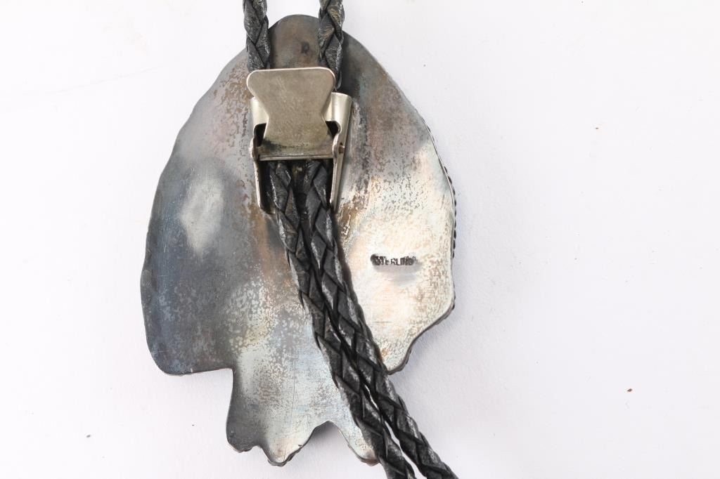 Set in sterling silver with sterling silver tips. On braided leather cord. The large piece of turquoise is carved into an Indian Chief's profile.