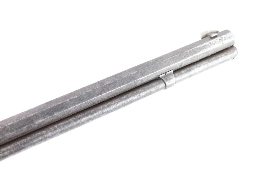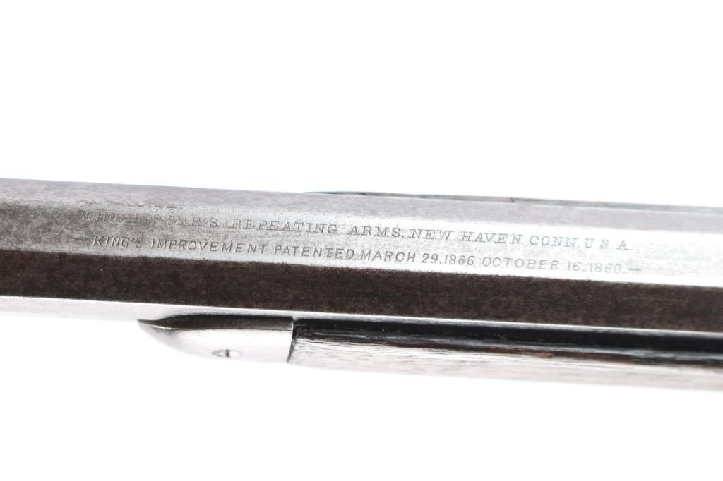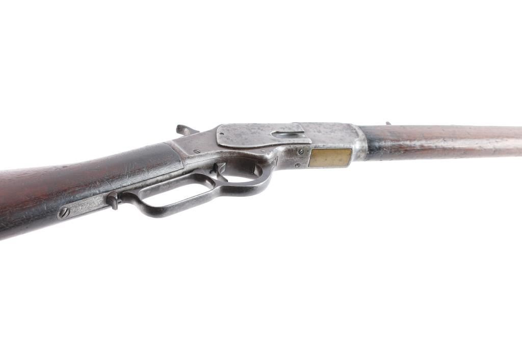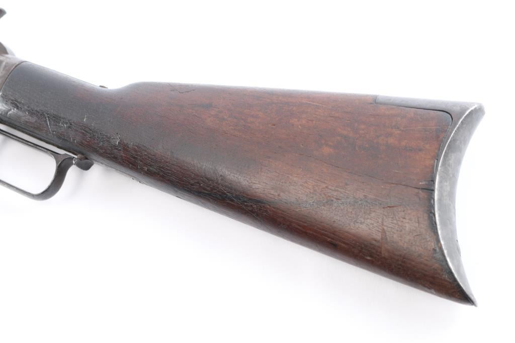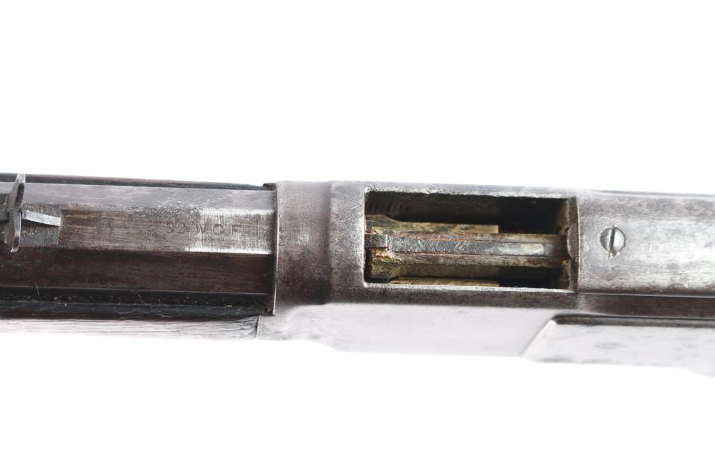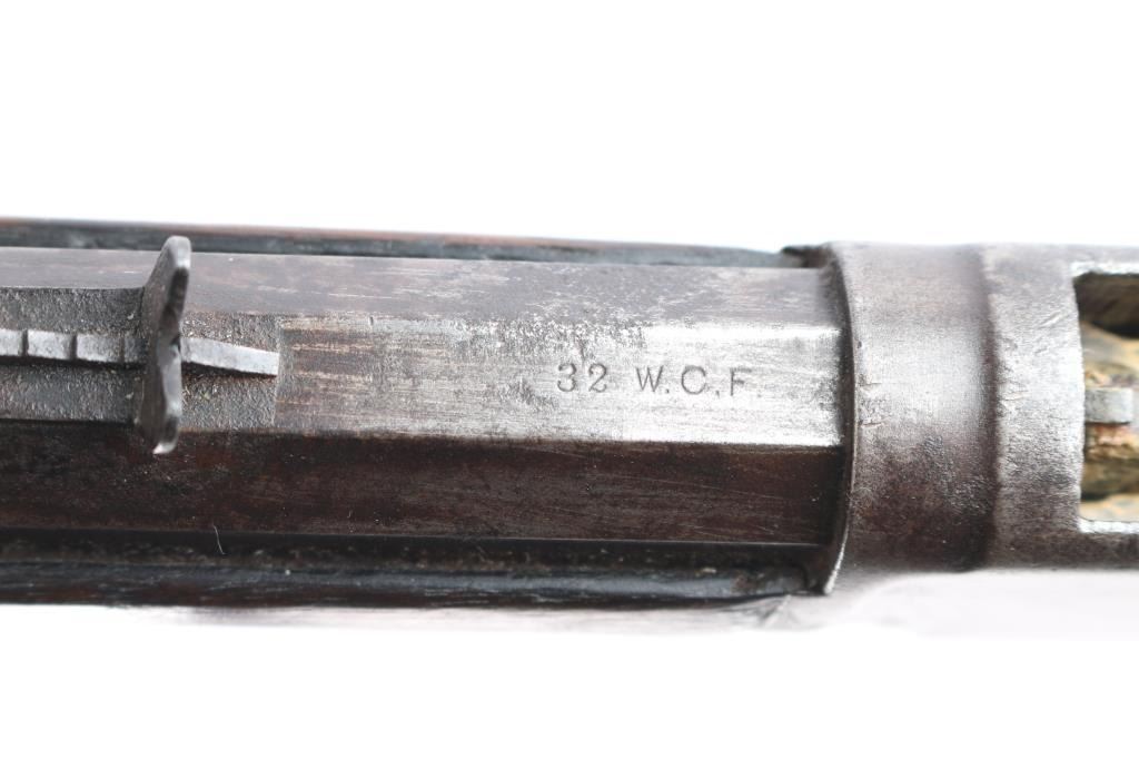 'Third Model' manufactured circa 1889. Features 24" octagon barrel, full length magazine tube, buckhorn sights, straight wrist, finger lever latch, smooth sliding dust cover with side rear serrations, steel crescent buttplate. Bore is poor to fair condition, pitted and eroded throughout, with visible rifling. Metal surfaces show a mostly mottled gray/brown color, mostly covered with patches of darker colored pitting . Screw slots are generally good with some slight marring. Wood is overall good/sound, with many minor dents and scratches throughout, a couple of minor chips on the forearm. Butt has good fit to tang. Action is smooth. Model marking on top tang is clear, readable. two line barrel address is clear, readable and serial number on bottom tang is feint but readable. Brass lifter is is marked ".32 Cal." Faint but readable.