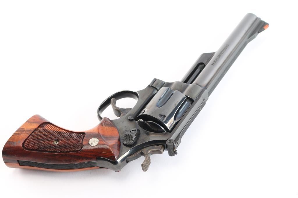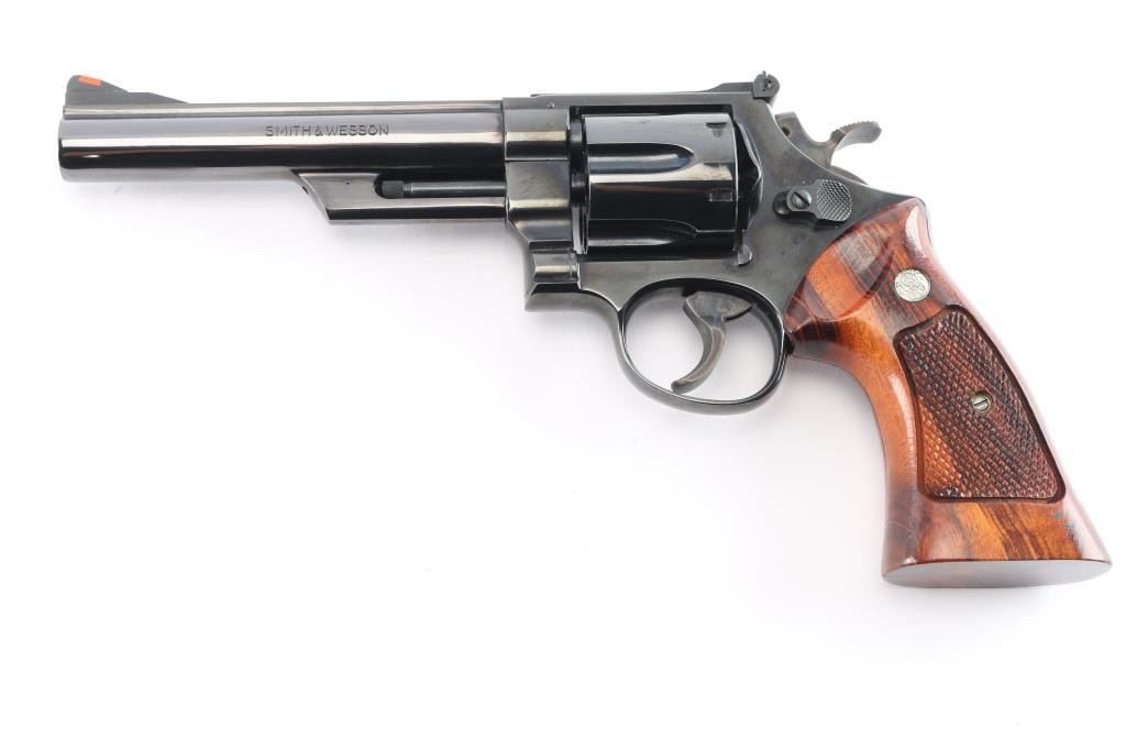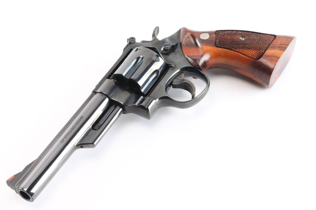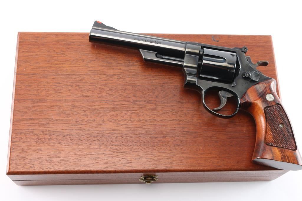The 1955 Model .45 Target Heavy Barrel Large frame double action six shot revolver chambered in .45 LC. Manufactured 1980. Features a blued finish, pinned 6 " heavy barrel with serrated wide sighting rib, raised ramp serrated blade front sight with red insert, adjustable square notch rear sight, fluted six-shot cylinder, shrouded ejector rod, case colored serrated .500" target trigger and .500" checkered target hammer, three screw square butt N target frame and 10 groove front and back straps, checkered walnut target grips with silver S&W medallions. Bore is excellent/bright. Retains approximately 98% finish with little to no scratches, edge wear or handling marks. A slight drag line on cylinder. Action is smooth with tight lockup, grips are excellent. Includes S&W form fitted wood case with cleaning gear and owners manual. The blue felt lining has deteriorated