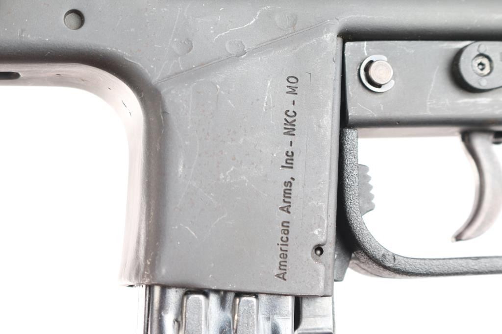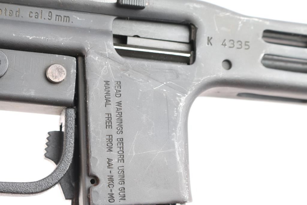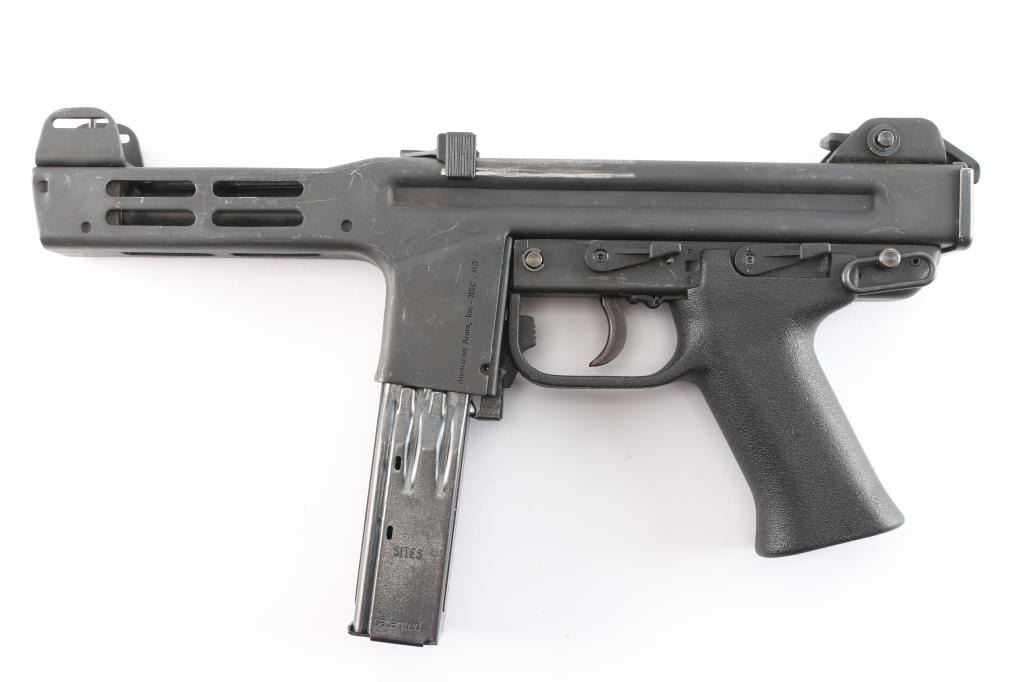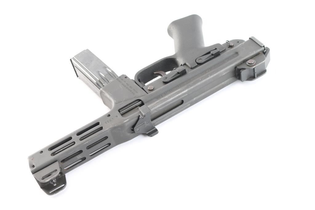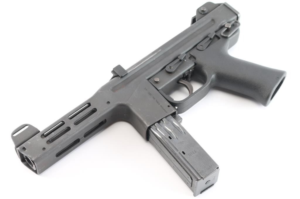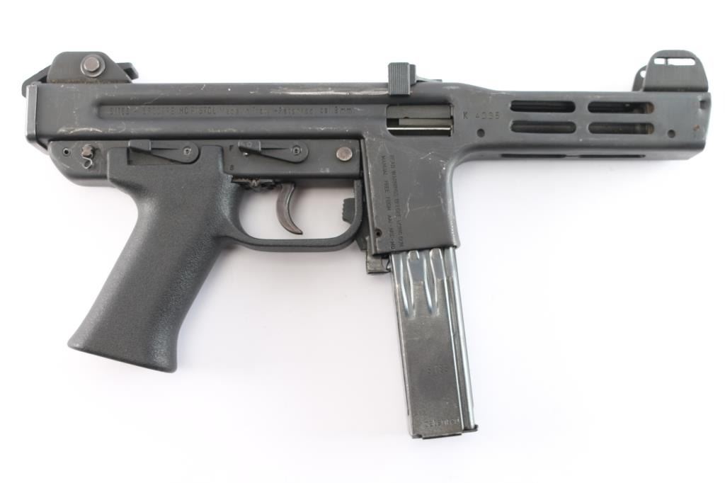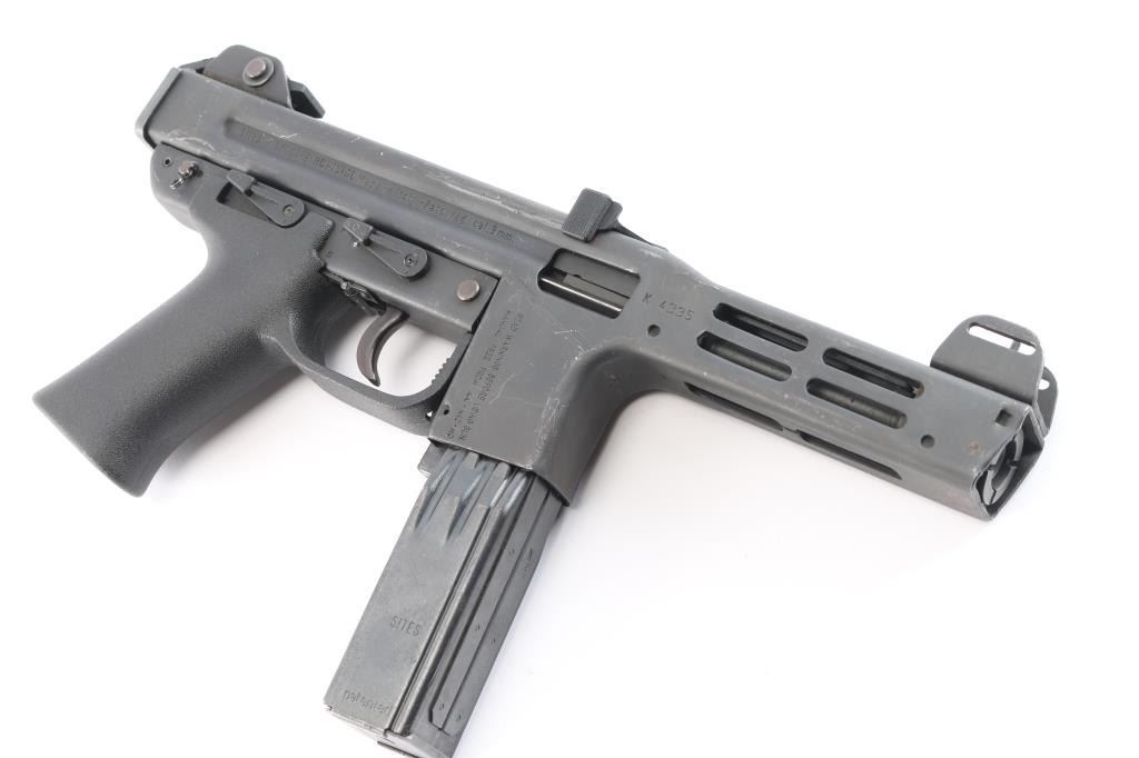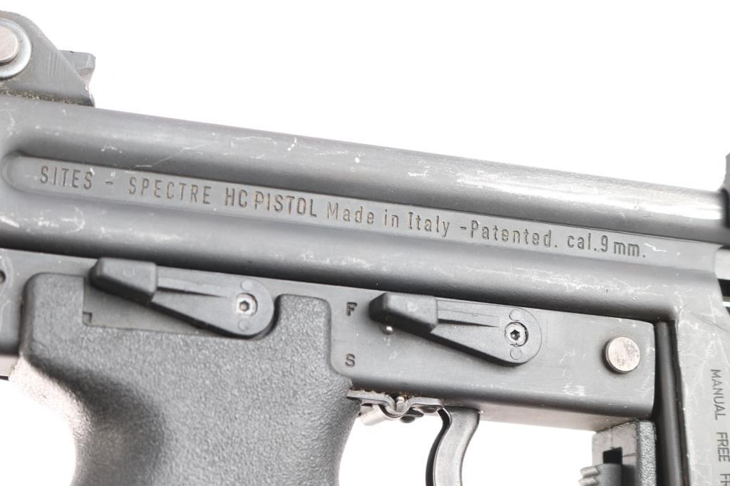 Desirable ‘pre-ban’ semi-automatic pistol variant of the SA/DA closed-bolt SITES M4 sub-machinegun chambered in 9x19mm and fed from a quad-stack magazine. Manufactured in Turin, Italy by Societa Italiana a Technologie Speciali SPA circa 1980s –1993 and imported by American Arms of North Kansas City, MO with import marks on both side of the magazine well. Approximately only 5,500 of the Spectre firearms were imported in total spanning 3 different calibers of the pistol and the carbine variant. Features a parkerized finish, 5.1” barrel, shrouded adjustable post front sight, shrouded square notch rear sight/end plate catch, stamped steel receiver with integral ventilated barrel shroud, ambidextrous top cocking non-reciprocating polymer charging handle with serrated knobs, smooth curved trigger, ambidextrous polymer safety selector, ambidextrous polymer decocking lever, OEM 30 round quad-stack magazine, magazine release lever inside the triggerguard, and textured black polymer pistol grip with integral triggerguard. Pistol retains approximately 90% of its original finish showing contact wear on the receiver from the charging handle, scratches and scattered oxidation/light surface rust. The action appears to perform well in single action but is missing a trigger spring making it uncapable of double action firing & unsafe to decock. The bore is excellent with ‘sinusoidal’ rifling and the polymer furniture is excellent.