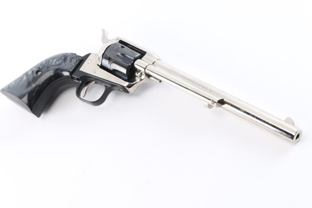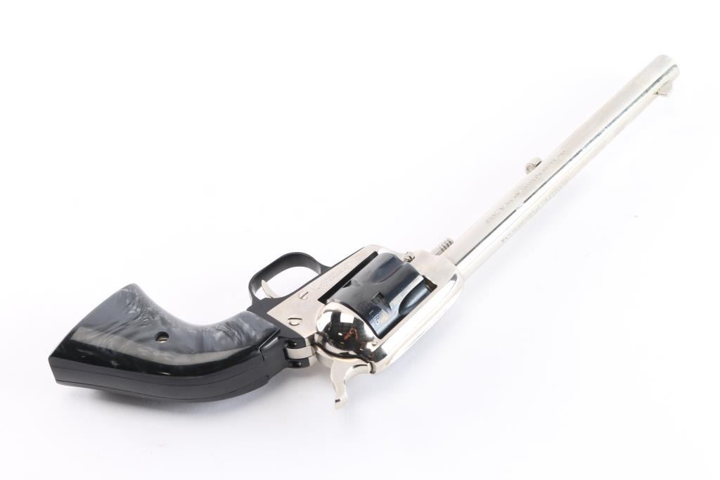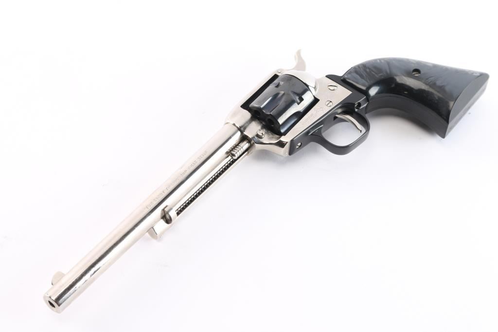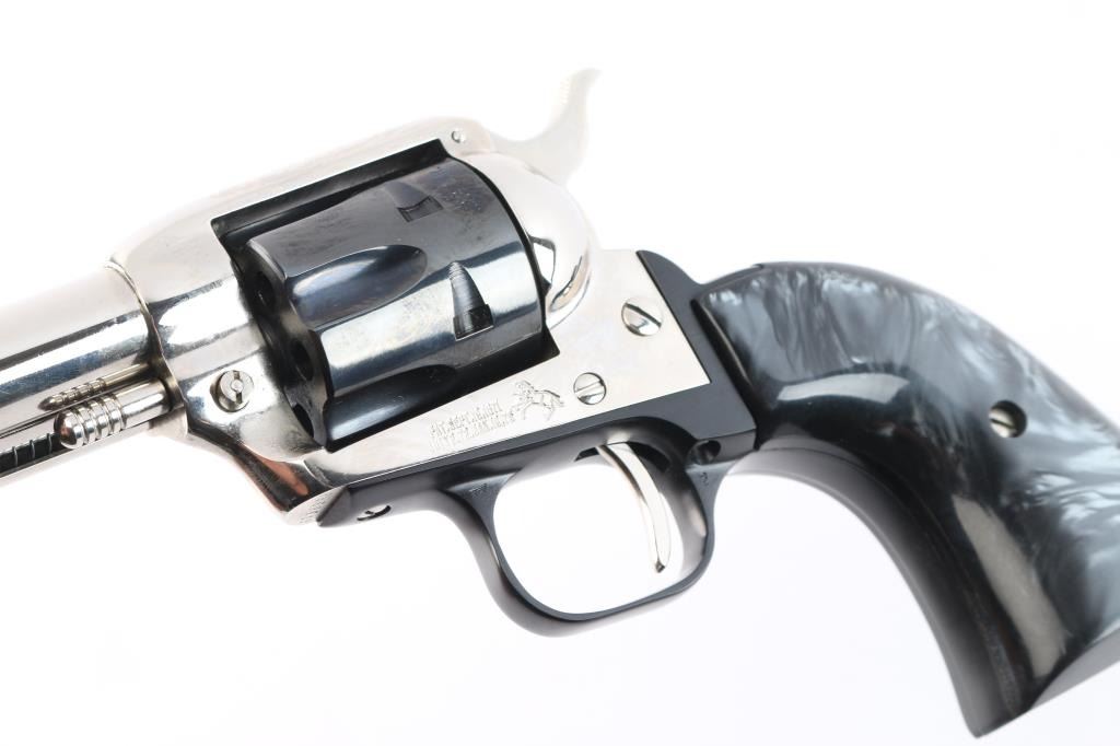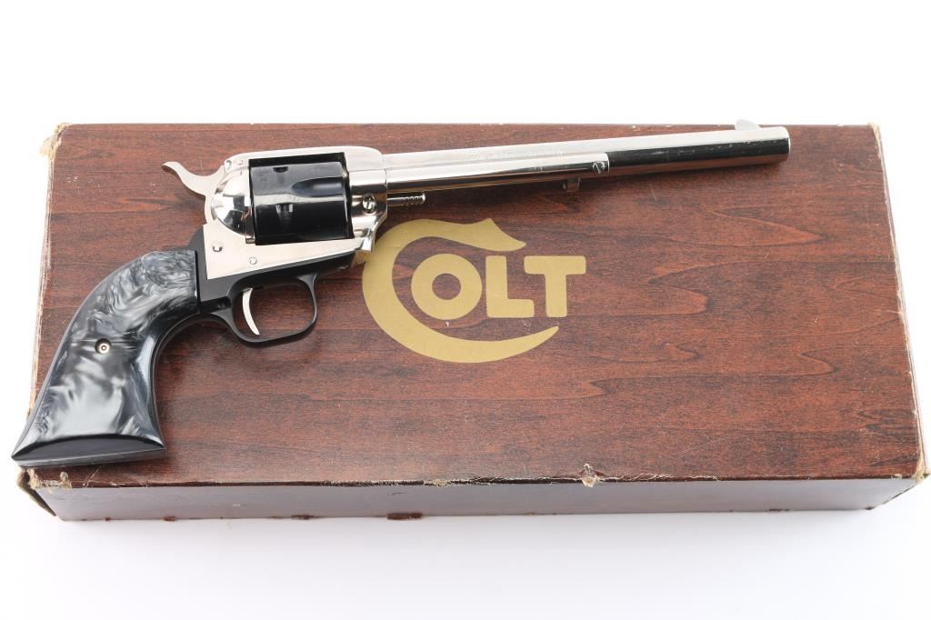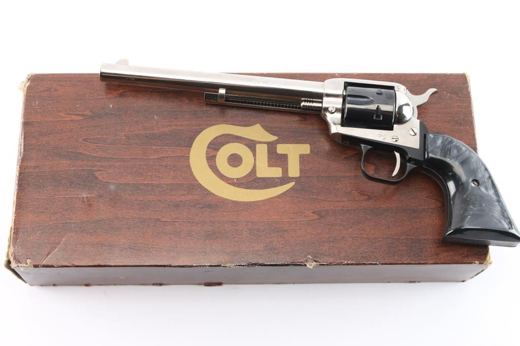 SN: G1363RB. Colt, “The Right to Keep and Bear Arms” 1977 commemorative, cal. .22, Peacemaker Buntline, single action revolver having the barrel with the inscription, “The Right to Keep and Bear Arms” inscribed on the barrel. these had their own serial number range. .22 LR cylinder installed. 7 1/2” barrel with fixed blade front and square notch rear in the top strap. The cylinder is blue, the barrel, frame, trigger and hammer are nickel with a black anodized grip frame. The grips are two-piece black and silver swirl plastic panels. The action is crisp with tight lock-up, the bore is excellent/bright, grips are excellent and the finishes are about 99%. Comes in the original colt factory wood grain box with the .22 Magnum cylinder.