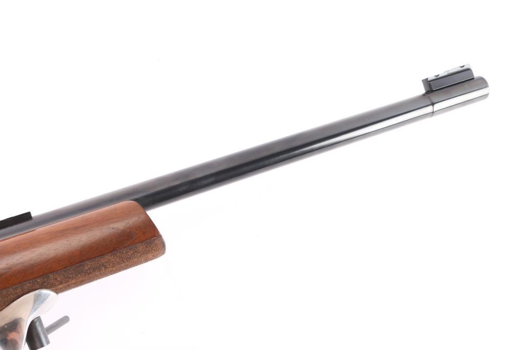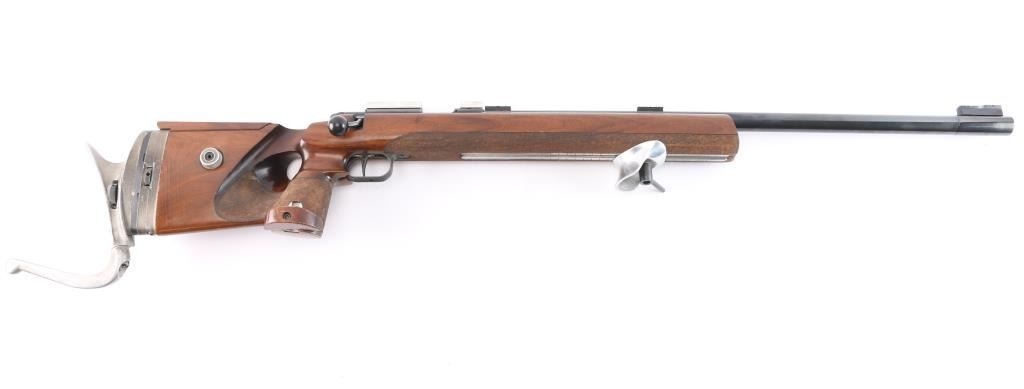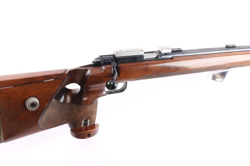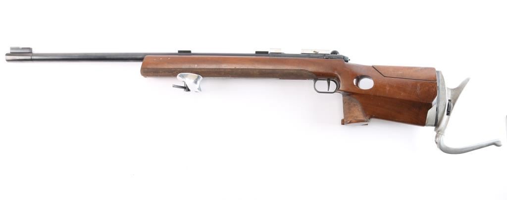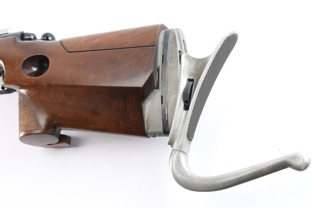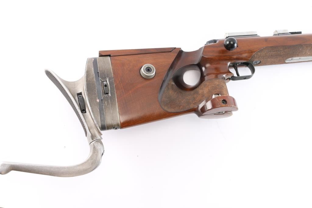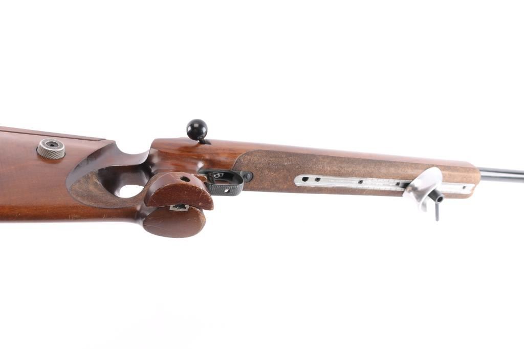 Top of the line German made bolt-action single-shot match rifle chambered in .22 Long Rifle. 1400 series, The "X" in the serial number is linked to the earlier 1400 series rifles, which were produced between 1977 and 1979. Barrel code "HI"-1978. Features a blued finish, heavy 27" barrel with recessed crown, front & rear riser sight blocks installed, swept back bolt handle, manual safety on left receiver, serrated adjustable trigger, adjustable hand stop, adjustable right-handed pistol grip walnut target stock, textured grip has adjustable hand rest, height adjustable comb, textured underside of fore stock, Adjustable Butt Plate, Hook-Type Butt Plate & Standard Butt The rifle exhibits an additional set of sight blocks on the barrel and retains approximately 98% of it's original blued finish with very little wear observed. Action is smooth, bore is excellent and walnut stock is near fine with few few blemishes. Comes with original manual/test target.