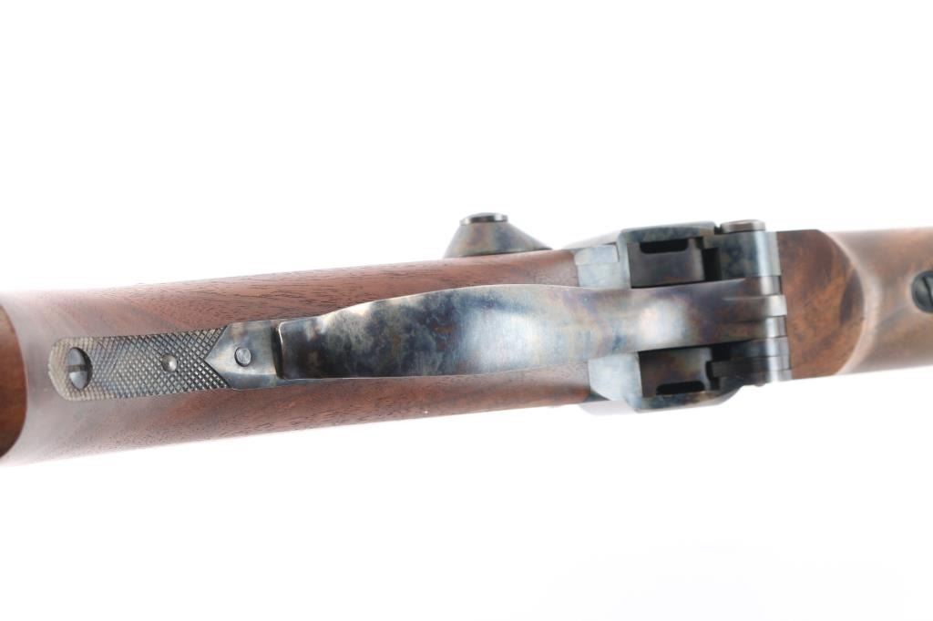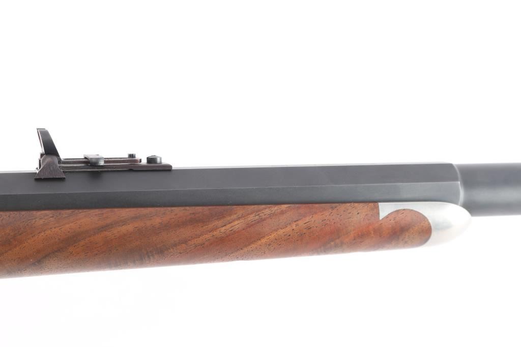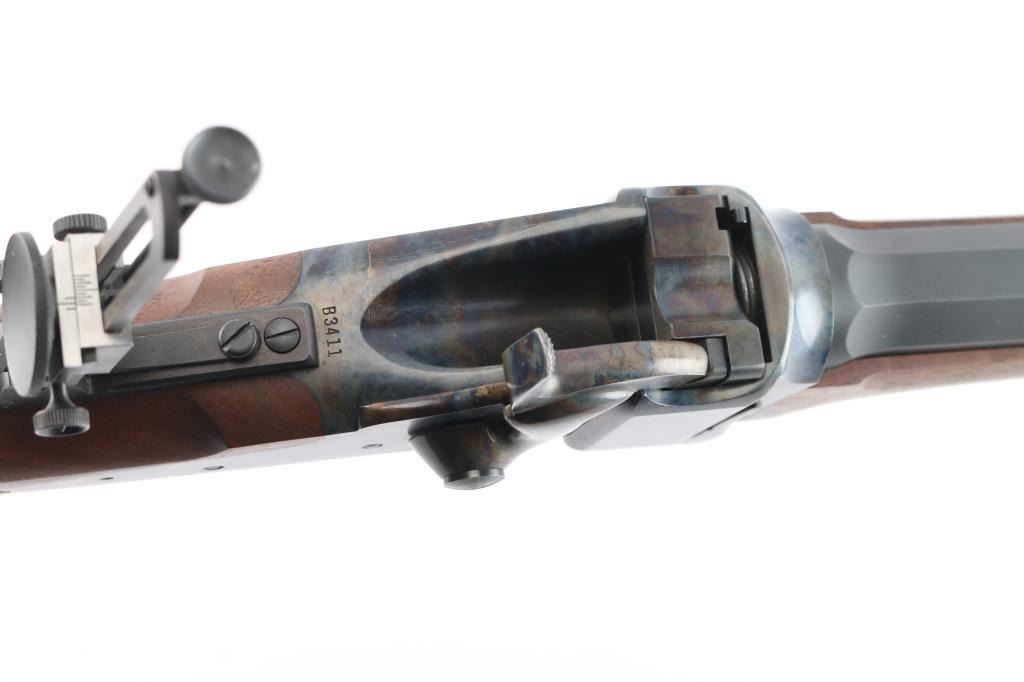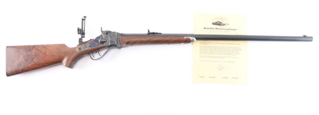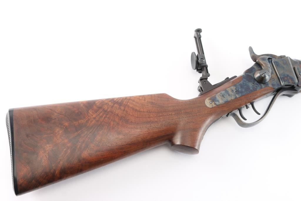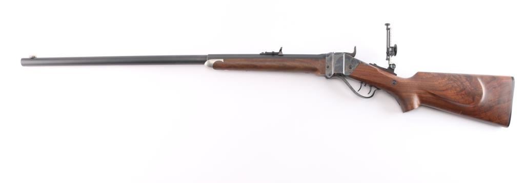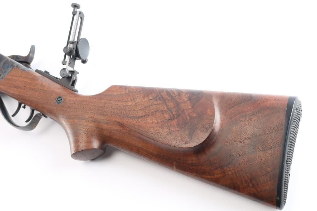 Features a matte blued 30" half round half octagon barrel, dovetailed German blade front sight, buckhorn rear sight with flip-up ladder marked 2-8, fully-adjustable mid-range tang sight, case hardened receiver, double set triggers, knurled hammer spur, smooth semi-fancy American black walnut forend with satin finish & pewter tip, and pistol grip shoulder stock with right handed cheek piece, checkered hard rubber buttplate & 14 3/8” LOP. Includes a factory letter.