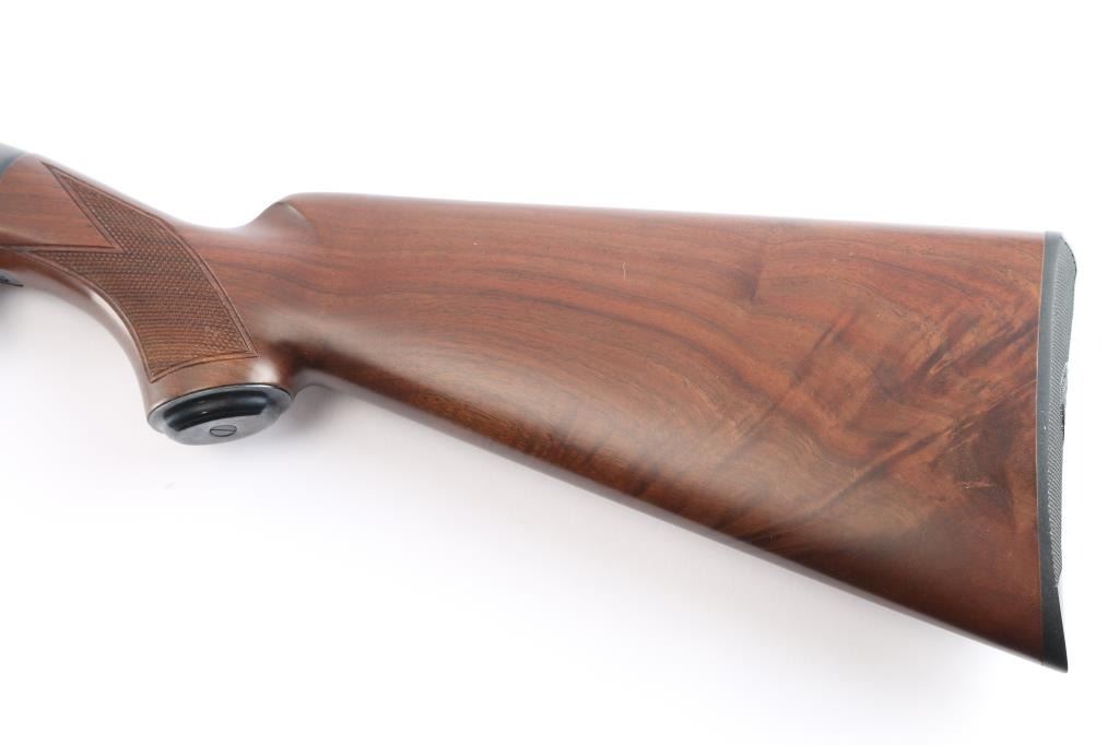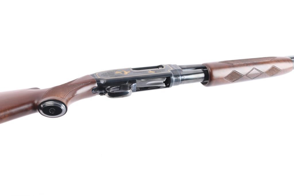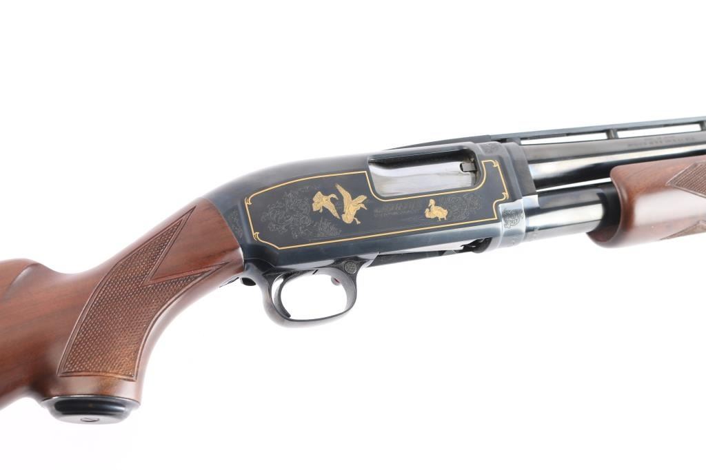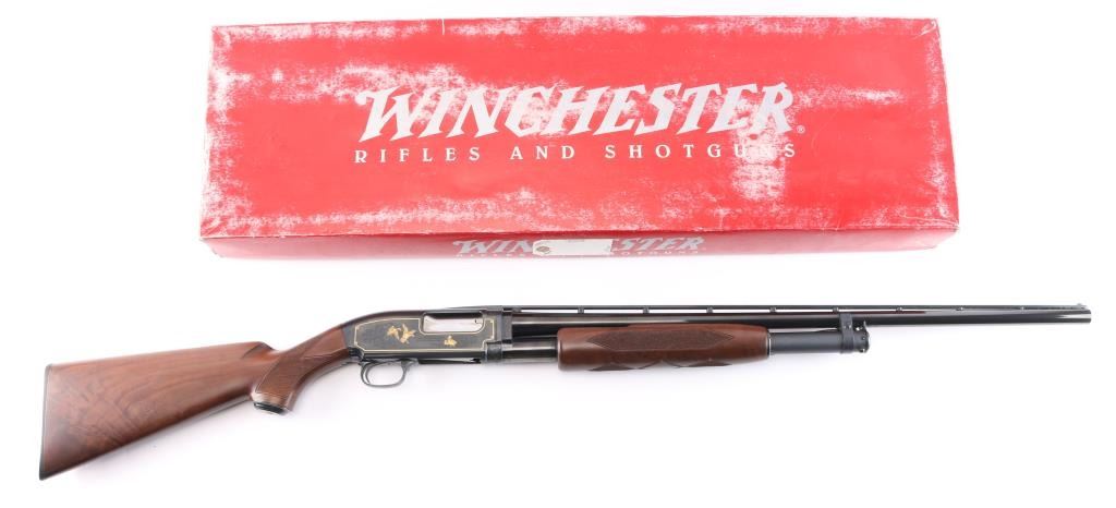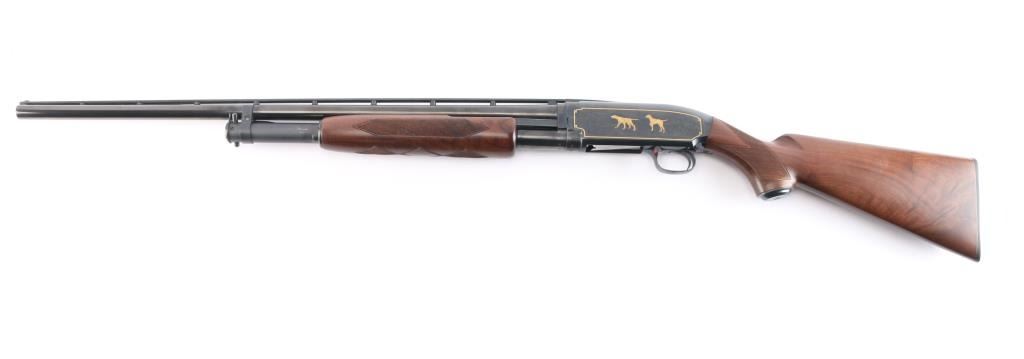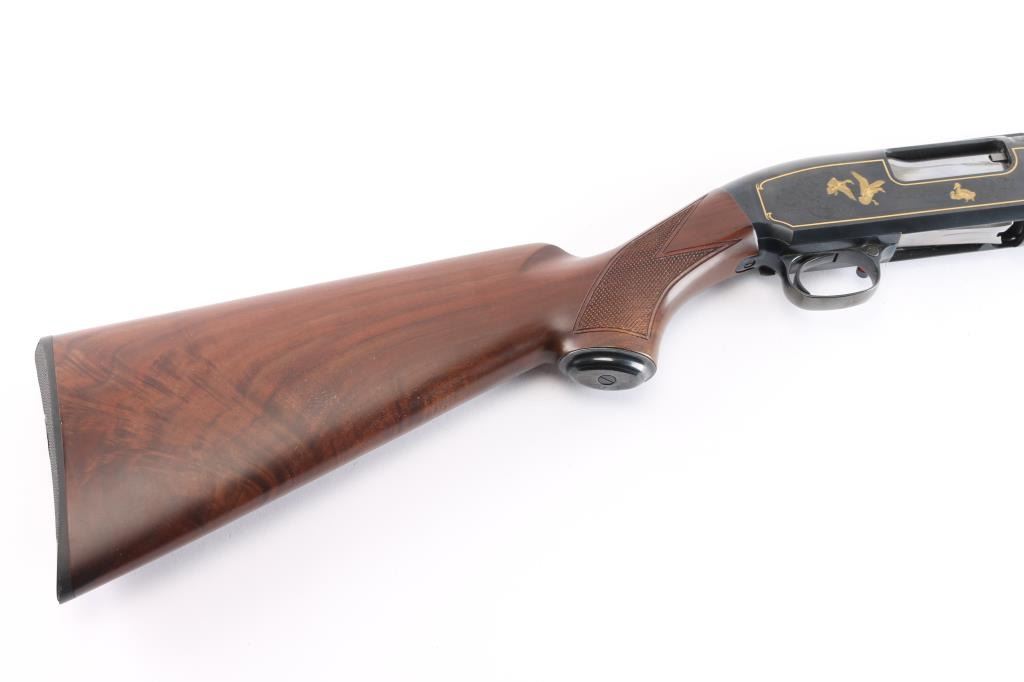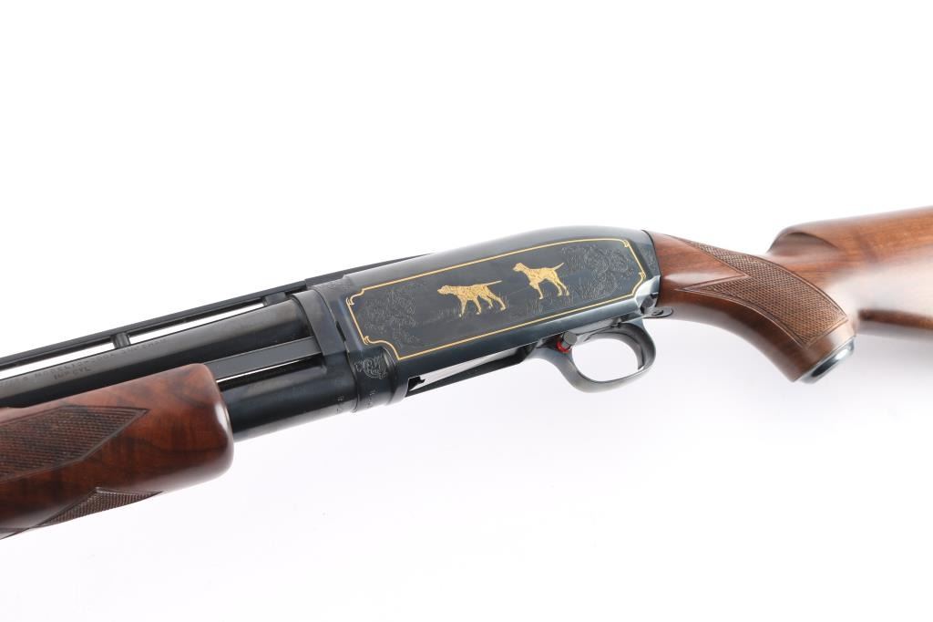 20 ga., 26” ventilated rib barrel with white sighting bead, fixed IC choke, 2 3/4" chamber. Manufactured in Japan by Miroku. Blue finish, polished bolt and lifter. The receiver features scroll/floral engraving gold-filled borders and game scenes with gold inlay of two dogs on point on the left and ducks taking flight on the right. Checkered select walnut pistol grip stock, and forearm, steel grip cap, checkered black factory buttplate, shoulder stock displays particularly attractive grain figure. Only 1000 of these fine shotguns were produced between 1993-1995. Mechanically excellent, bore is pristine. The shotgun is in like new condition, appears unfired. Come in the original factory box with matching label, owners manual.