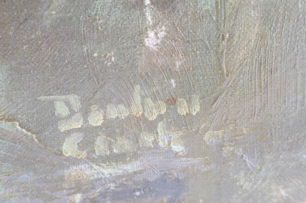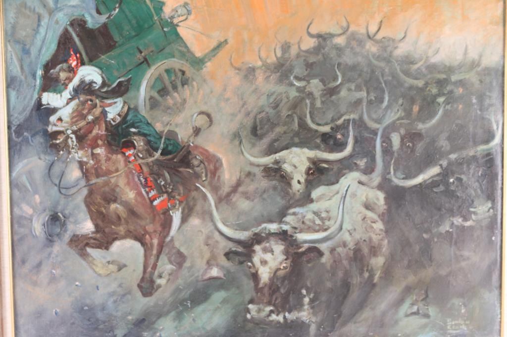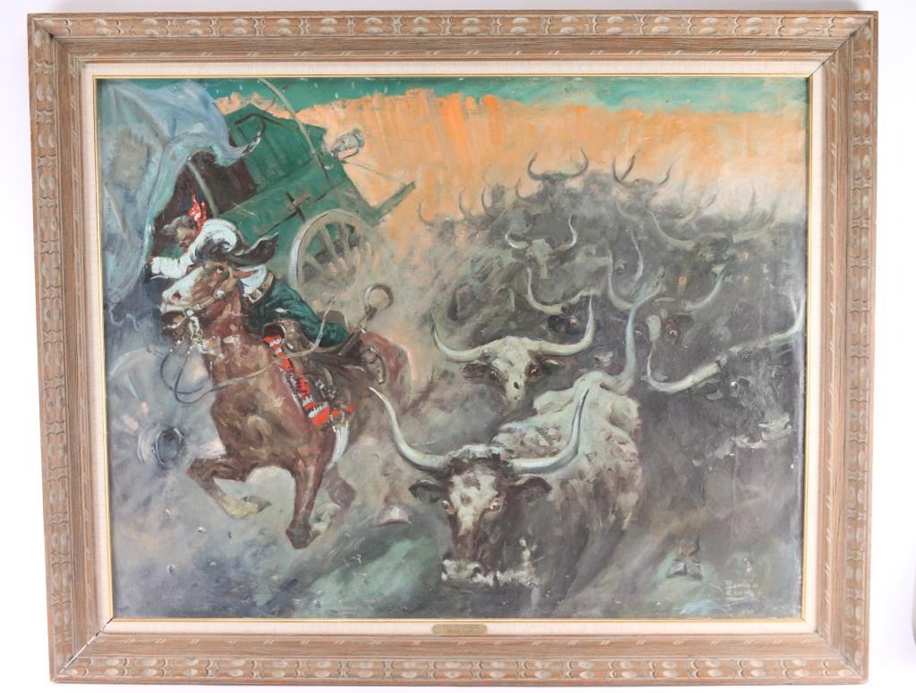 By Benton Henderson Clark ( 1895-1964), entitled "The Stampede." Born in Coshocton, Ohio, Benton Clark became an eastern illustrator of the West in the dramatic tradition of Frederic Remington and especially loved painting horses. Major influences on him were Harvey Dunn, Frank Hoffman, and Frederic Remington, and in 1932, he became a member of the Society of Illustrators. In 1932, he returned to New York City and did western illustrations for leading magazines such as "Saturday Evening Post," "Mc Call's" and "Good Housekeeping,", a job that took him West for subject matter. Measures 35 1/2" x 44" in carved wood frame. Painting measures 29" x 37 1/4". Signed lower right corner. De-accessioned from the permanent collection at Phippen Museum, Prescott, AZ.