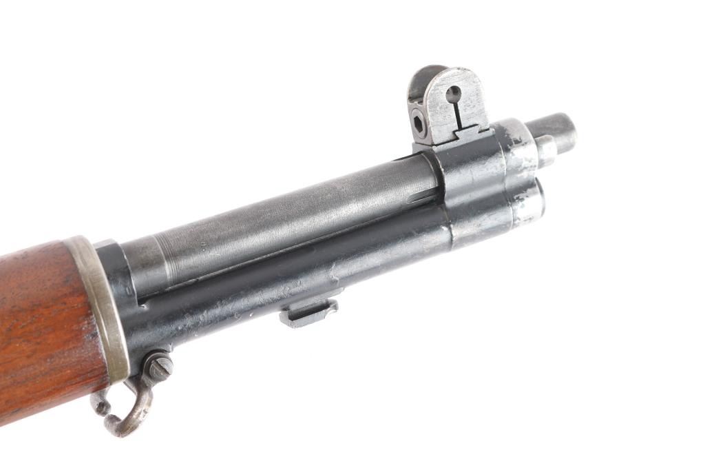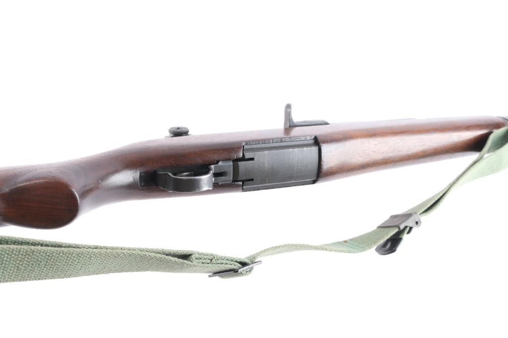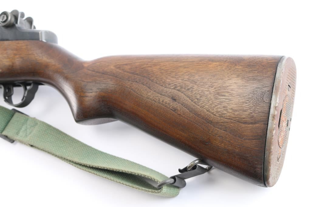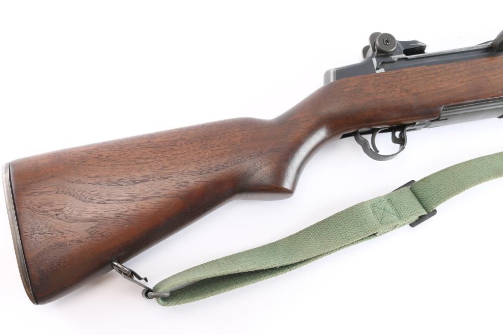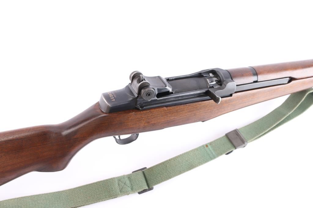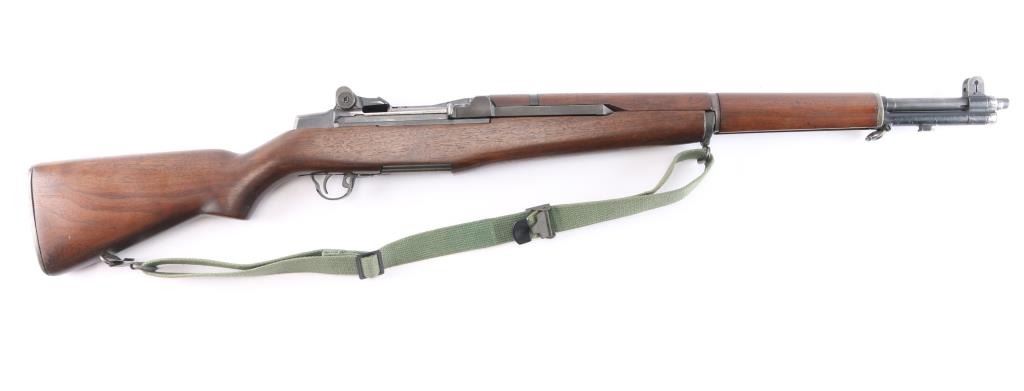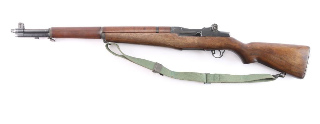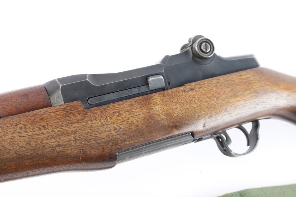 US military semiautomatic rifle. Arsenal reworked. Features blued finish, wood stock & hand guards, 24" barrel, adjustable sights with protected front blade & protected rear peep, fixed magazine for en-bloc clip, manual safety. Serial number dates the receiver to February 1942, bolt marked "D28287-17SA -B4C", barrel marked "S-A 4-49", trigger housing marked "90-HRA N65282, hammer marked "HRA 5546008. safety marked "HRA' , Op rod marked "D36382 3 SA", receiver marked "REP 25 C T over "D 28291-17". Rear sight marked "DRC". Bore is excellent/bright strong rifling. Metal parts retain 90% blue finish. Shows edge losses & handling marks. Wood is very good, color match among the stock and handguards. Some surface rust on the buttplate. Stock cartouches not observed. USGI green web sling attached.