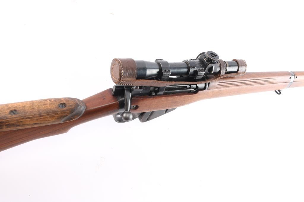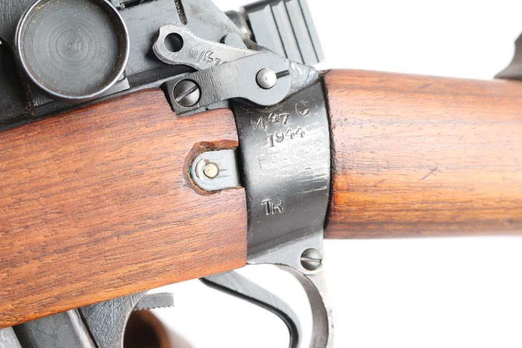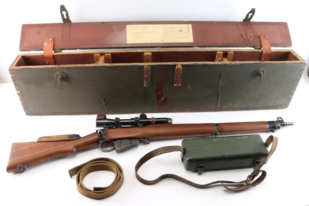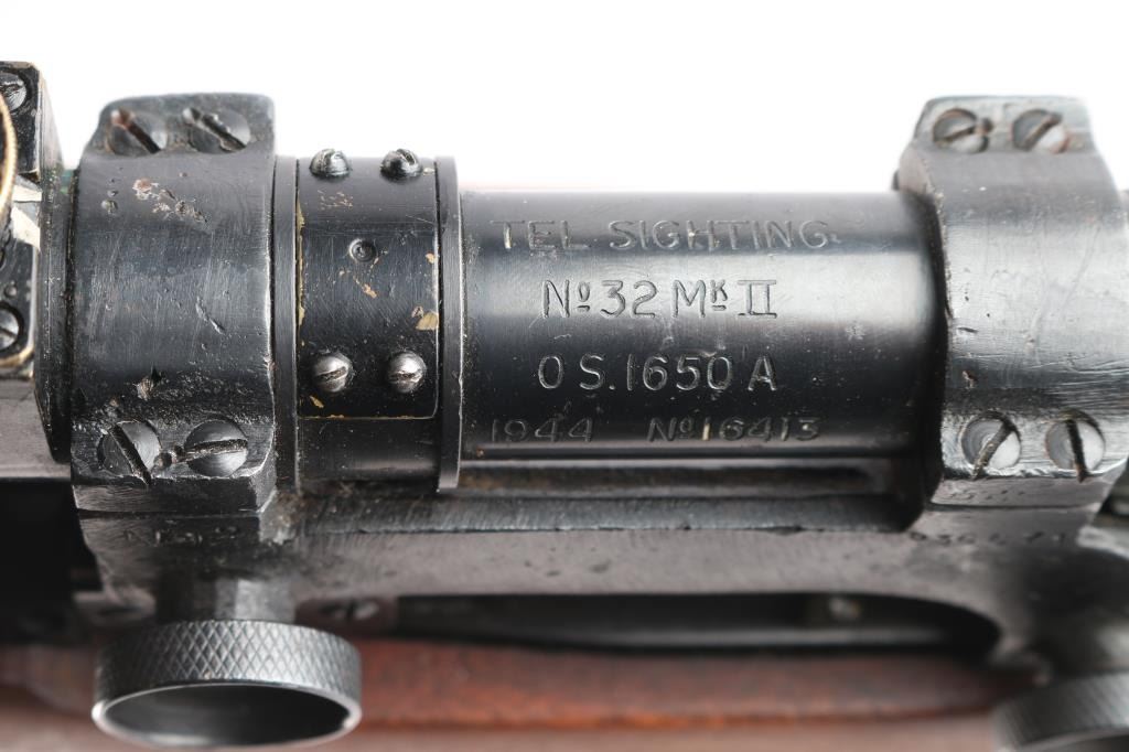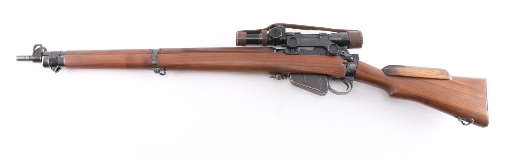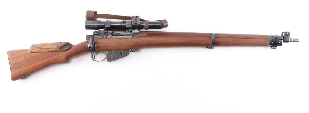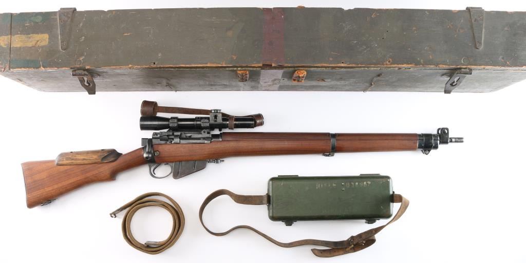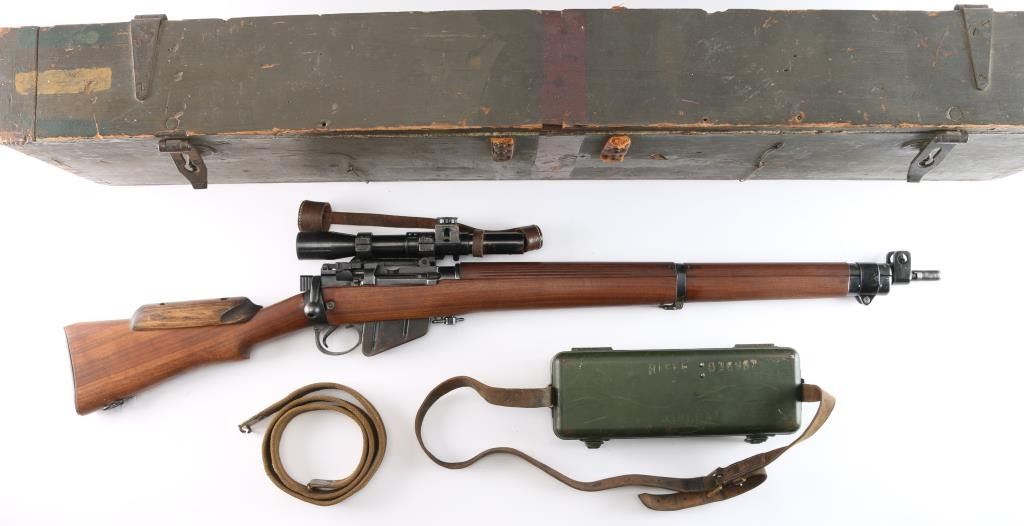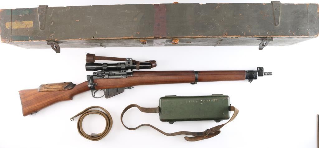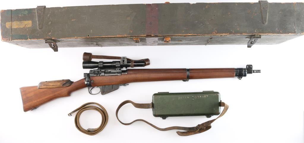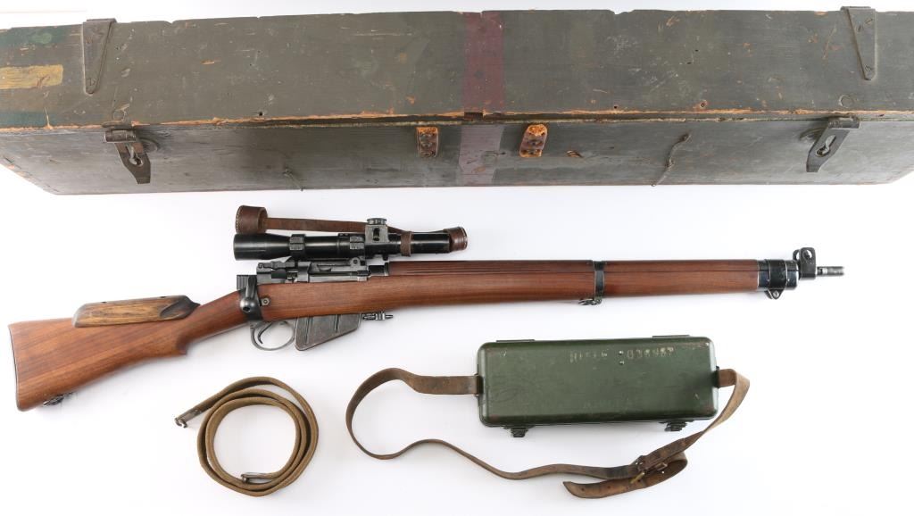 British military bolt action rifle dated 1944, with No 32 Mk II scope and mount. Used from WW2 into the early 1960's until they were replaced by the L42 series sniper rifles. Features 25" barrel with bayonet lug, protected blade front sight, folding ladder rear peep sight, manual safety, detachable magazine, sling swivels including the third triangular swivel forward of magazine, black finished metal, wood stock and handguard, wood cheek riser on butt, aluminum buttplate with trap door. Markings include "M47C / 1944 / TR" on left side of butt socket, "No. 4 Mk I" and "T" on left side of receiver, "D36671" on scope mount, "P227" on top and bottom rings at rear, "P228" on top and bottom rings at front. Scope marked "TEL SIGHTING / No 32 Mk II / OS.1650A / 1944 No. 16413". Bore is bright and shiny. Metal retains 85% finish with edge losses, scuffs, brown patina on magazine. Wood is overall near excellent with some staining on cheek piece. Scope is very good condition, clear view, post and cross hair reticle. Includes overall good condition (leather carry straps damaged) Transit Chest with metal scope case (has leather carry strap), British type cotton web sling, spare follower and spring for mag, leather caps for scope.