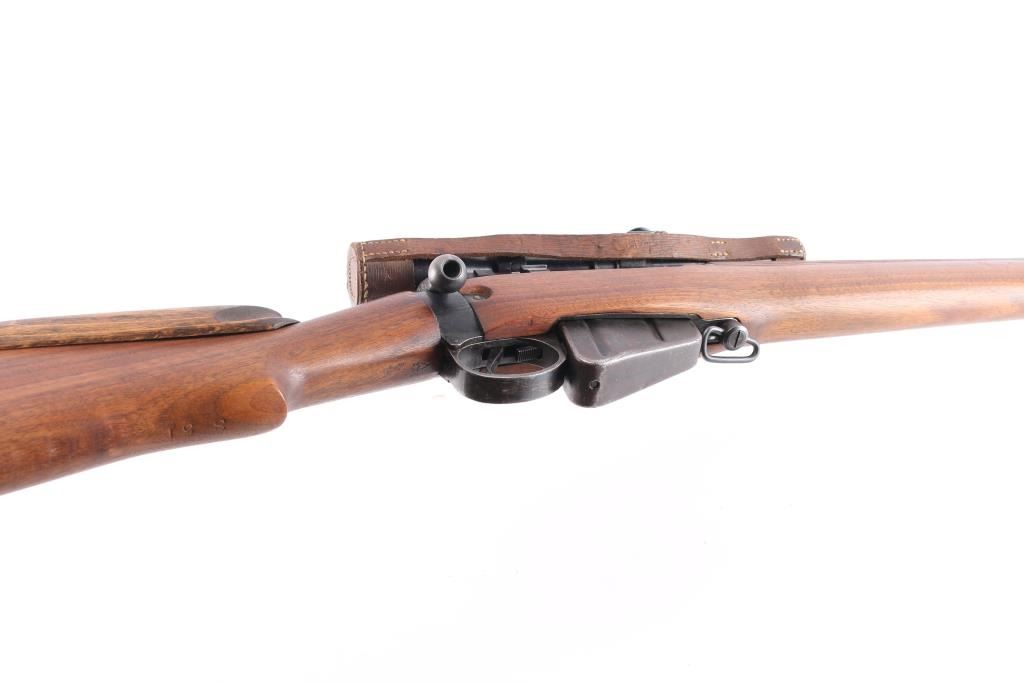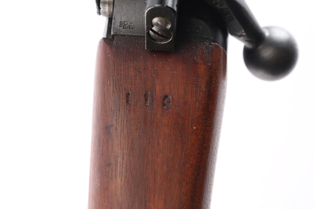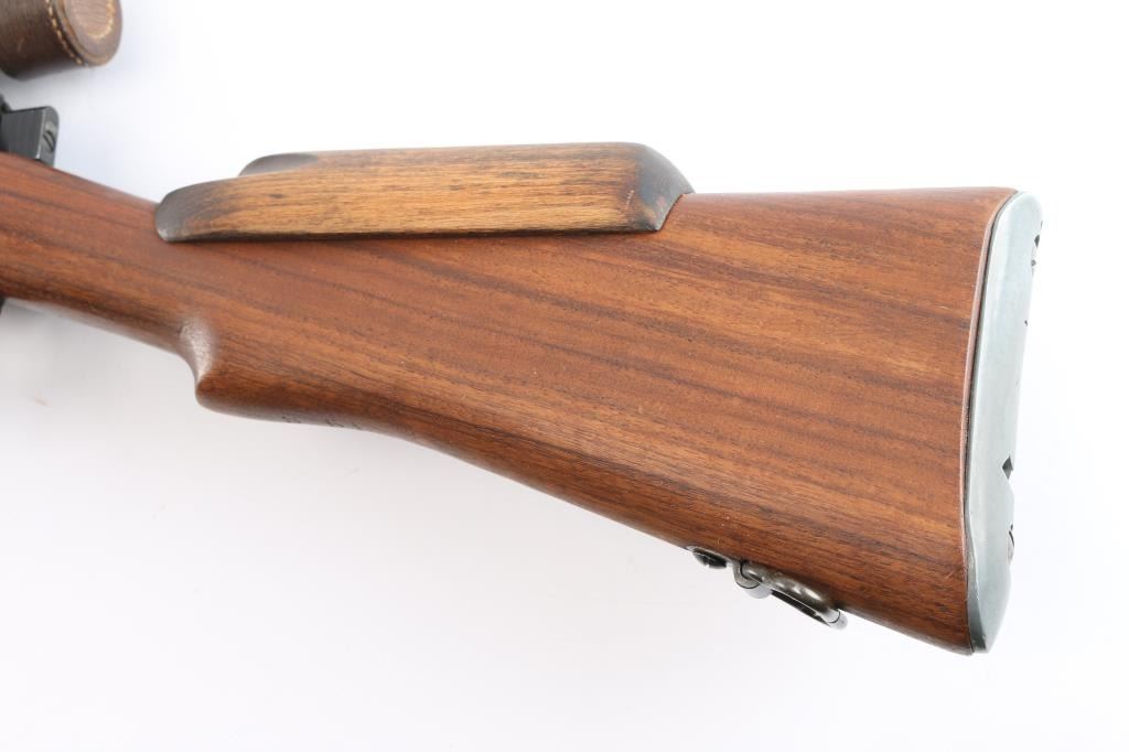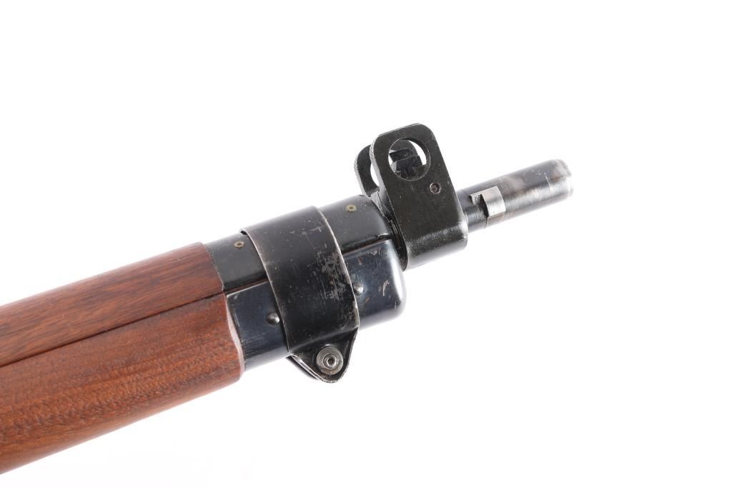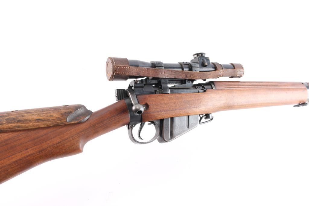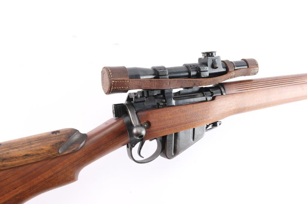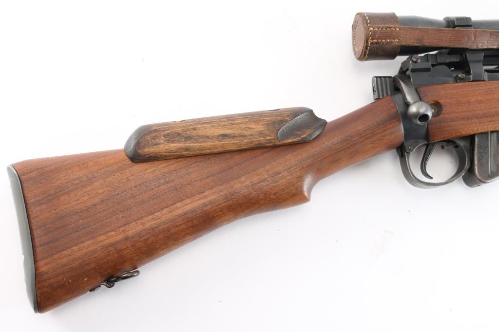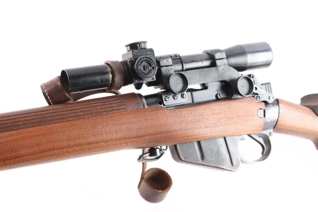 British military bolt action rifle dated 1944, with No 32 Mk II scope and mount. Used from WW2 into the early 1960's until they were replaced by the L42 series sniper rifles. Features 25" barrel with bayonet lug, protected blade front sight, folding ladder rear peep sight, manual safety, detachable magazine, sling swivels including the third triangular swivel forward of magazine, black finished metal, wood stock and handguard, wood cheek riser on butt, aluminum buttplate with trap door. Markings include "M47C / 1944 / TR" on left side of butt socket, "No. 4 Mk I" and "T" on left side of receiver, "D36671" on scope mount, "P227" on top and bottom rings at rear, "P228" on top and bottom rings at front. Scope marked "TEL SIGHTING / No 32 Mk II / OS.1650A / 1944 No. 16413". Bore is bright and shiny. Metal retains 85% finish with edge losses, scuffs, brown patina on magazine. Wood is overall near excellent with some staining on cheek piece. Scope is very good condition, clear view, post and cross hair reticle. Includes overall good condition (leather carry straps damaged) Transit Chest with metal scope case (has leather carry strap), British type cotton web sling, spare follower and spring for mag, leather caps for scope.