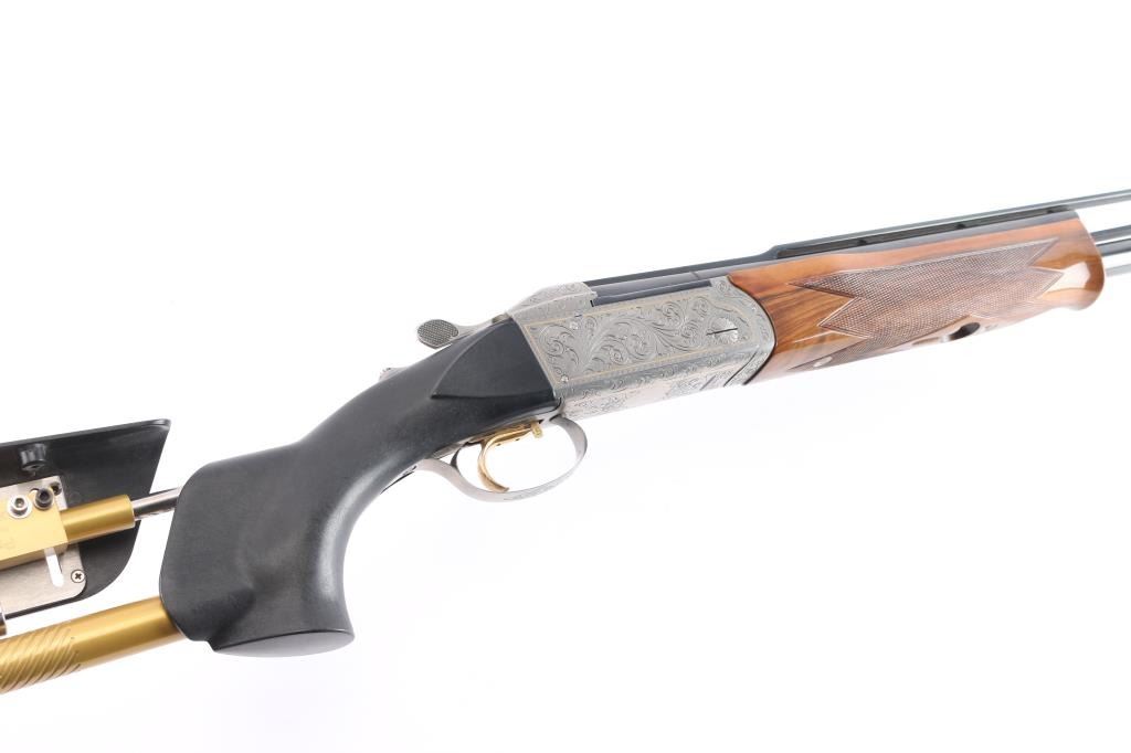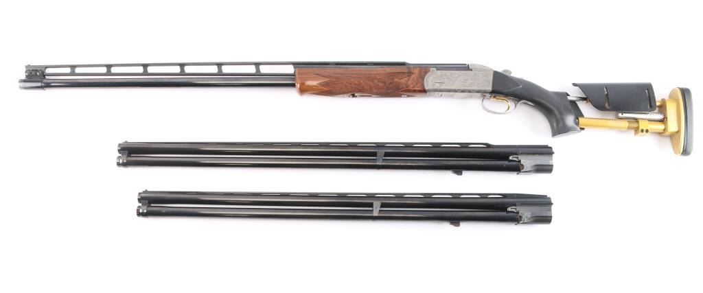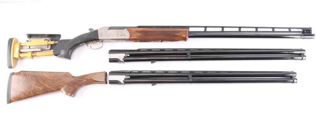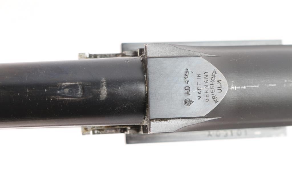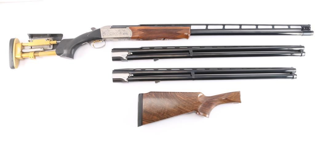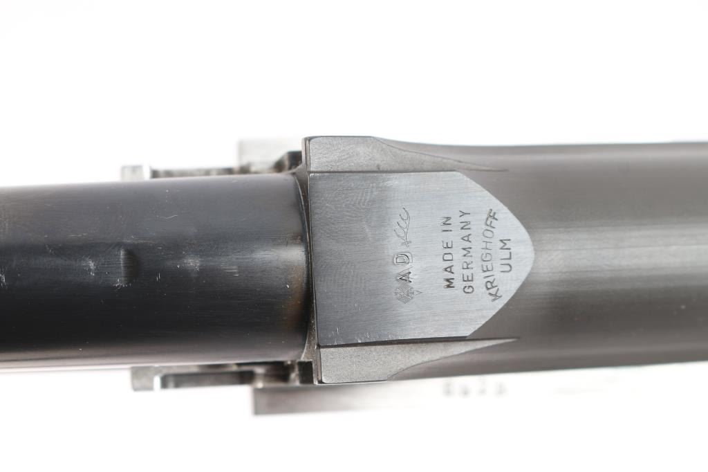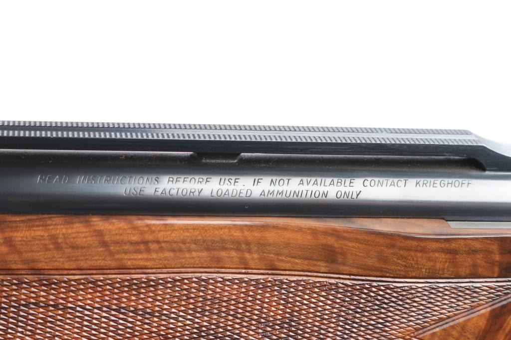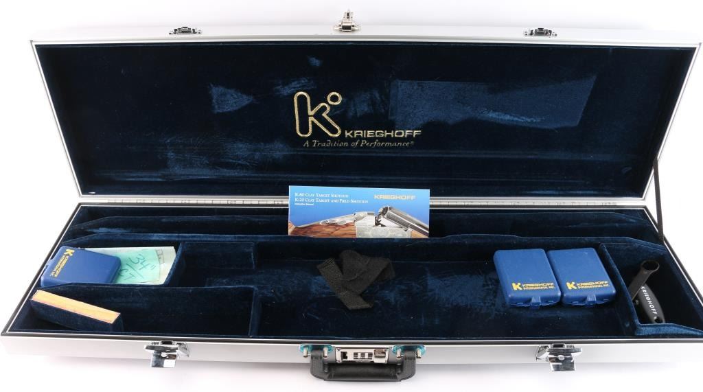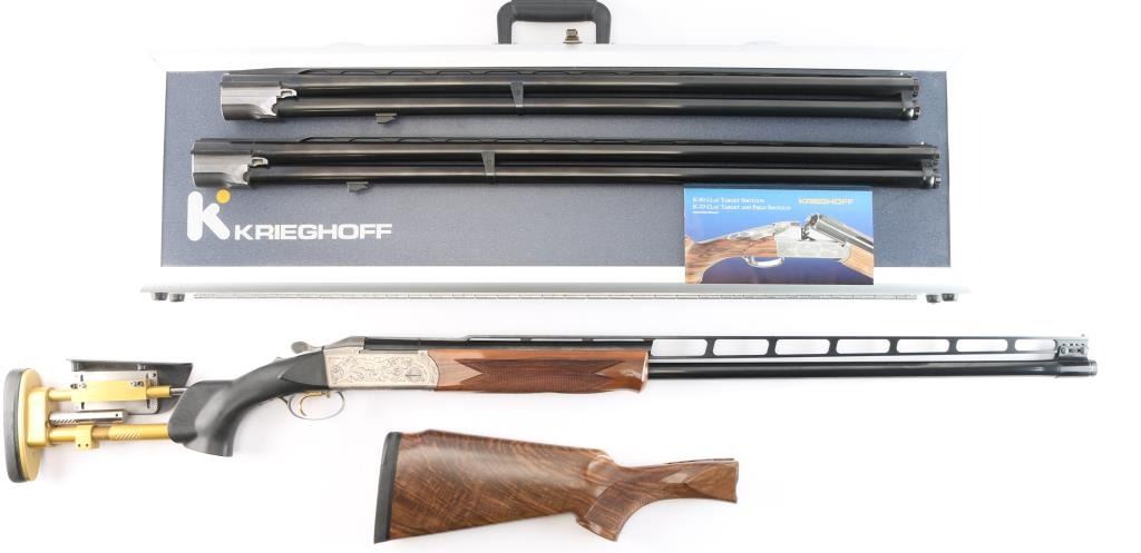 Very high quality German manufactured two barrel set. (3 Barrels with the Trap barrel) This shotgun is set-up in trap configuration with Krieghoff factory 34" single high polish blue trap barrel with high adjustable vent rib , 2 3/4" chamber, ,white pearl sighting bead and steel mid bead installed. Screw-in choke marked "3" (IM) installed. Fitted with a 'Gold Edition" Precision Fit Stock. Model to fit Krieghoff K80 Trap Gun. Right Handed. Recoil reducing Stock assembly completely adjustable. Kick-eez 1" inch thick Trap pad, straight. Nickel plated receiver & trigger with a satin grey finish, full coverage floral/scroll designs with 24k borders, Top Latch with 24K Gold Broken Target inlay, bottom of receiver has a 24K gold shield outline with "K-80 Krieghoff Germany", gold single-selective trigger, adjustable for finger length, approximately 3-3/4 lbs, sliding push button tang safety, can be locked in "Off". Fine-checkered select Turkish walnut forearm with schnabel style forend. Krieghoff shotgun aluminum travel case with combination lock, blue felt lining. Contains the original Turkish number 3 shoulder stock with black rubber recoil pad, 32" 12 gauge O/U vent rib barrels, 2 3/4" chambers, IM over IC choke tubes installed, 30" 12 gauge O/U vent rib barrels, 3" chambers, IC over Skeet choke tubes installed, cleaning rod, 12 Ga. choke wrench, owners manual, paperwork, 3-M choke tubes, 2-IC,1-IM,1-Full and 1-Super full. Shotgun, case and accessories are in excellent/like new condition. Bores are pristine.