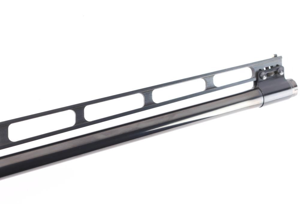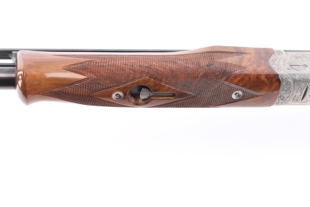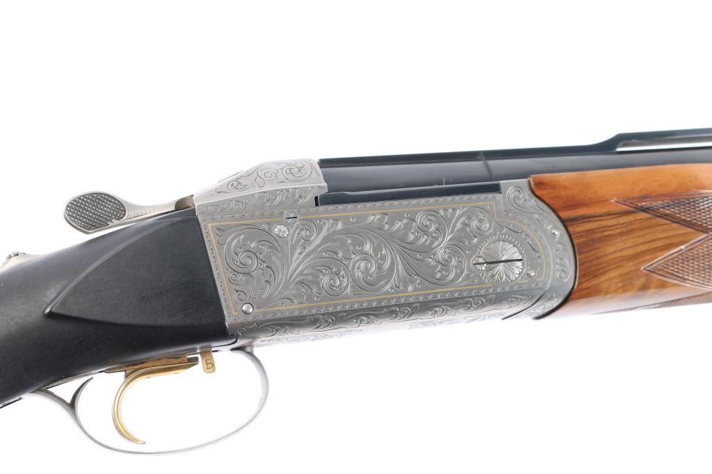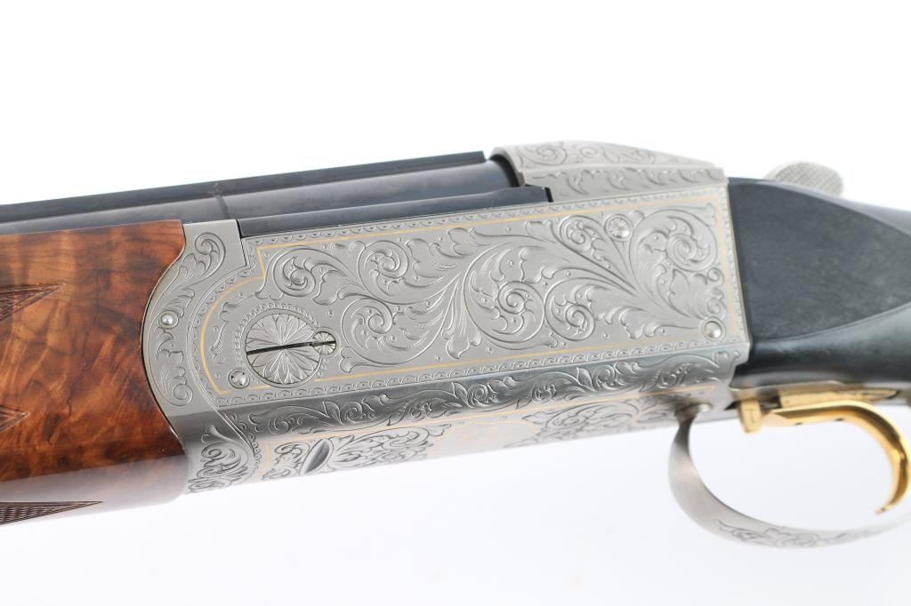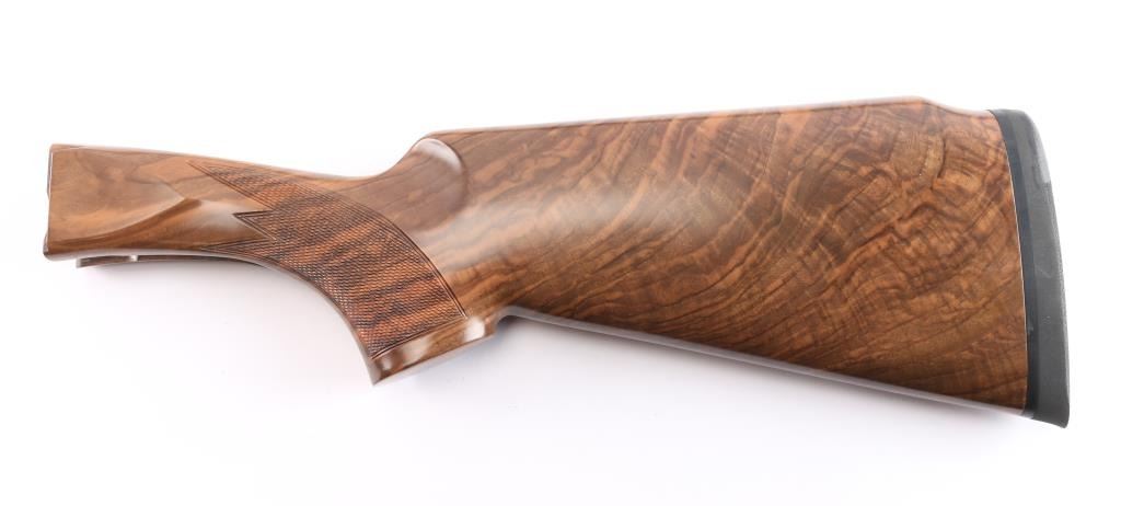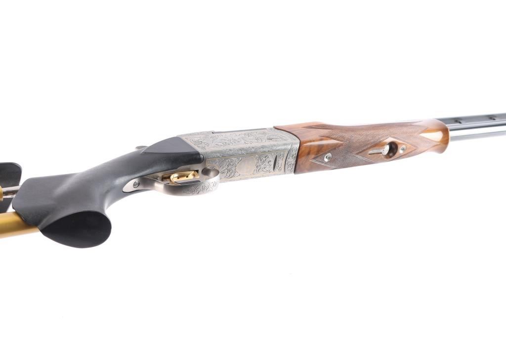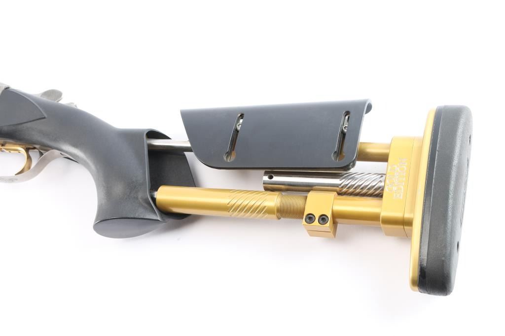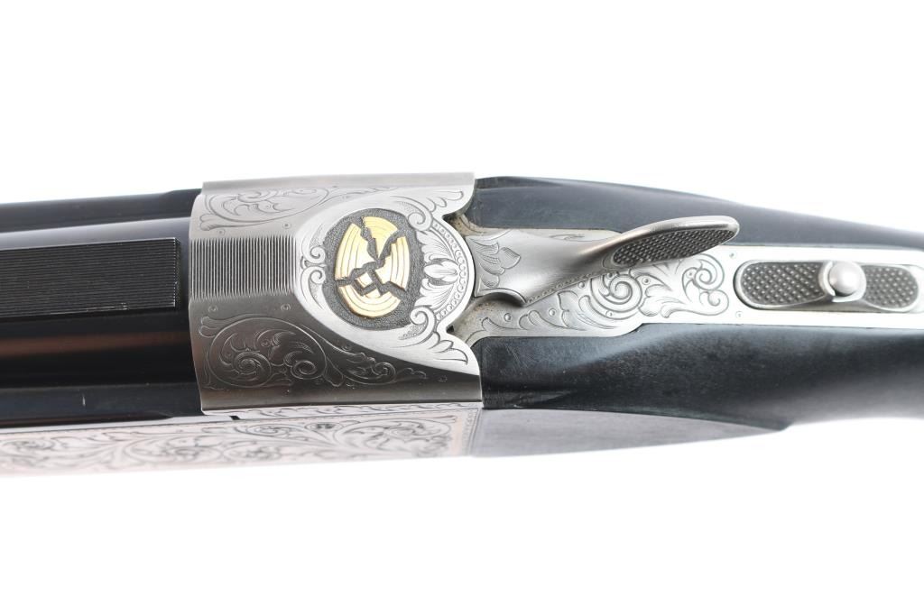 Very high quality German manufactured two barrel set. (3 Barrels with the Trap barrel) This shotgun is set-up in trap configuration with Krieghoff factory 34" single high polish blue trap barrel with high adjustable vent rib , 2 3/4" chamber, ,white pearl sighting bead and steel mid bead installed. Screw-in choke marked "3" (IM) installed. Fitted with a 'Gold Edition" Precision Fit Stock. Model to fit Krieghoff K80 Trap Gun. Right Handed. Recoil reducing Stock assembly completely adjustable. Kick-eez 1" inch thick Trap pad, straight. Nickel plated receiver & trigger with a satin grey finish, full coverage floral/scroll designs with 24k borders, Top Latch with 24K Gold Broken Target inlay, bottom of receiver has a 24K gold shield outline with "K-80 Krieghoff Germany", gold single-selective trigger, adjustable for finger length, approximately 3-3/4 lbs, sliding push button tang safety, can be locked in "Off". Fine-checkered select Turkish walnut forearm with schnabel style forend. Krieghoff shotgun aluminum travel case with combination lock, blue felt lining. Contains the original Turkish number 3 shoulder stock with black rubber recoil pad, 32" 12 gauge O/U vent rib barrels, 2 3/4" chambers, IM over IC choke tubes installed, 30" 12 gauge O/U vent rib barrels, 3" chambers, IC over Skeet choke tubes installed, cleaning rod, 12 Ga. choke wrench, owners manual, paperwork, 3-M choke tubes, 2-IC,1-IM,1-Full and 1-Super full. Shotgun, case and accessories are in excellent/like new condition. Bores are pristine.