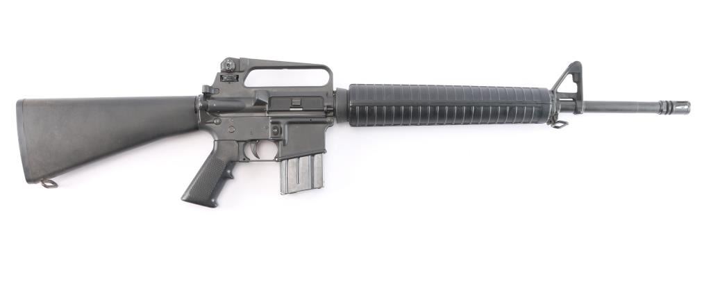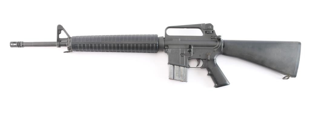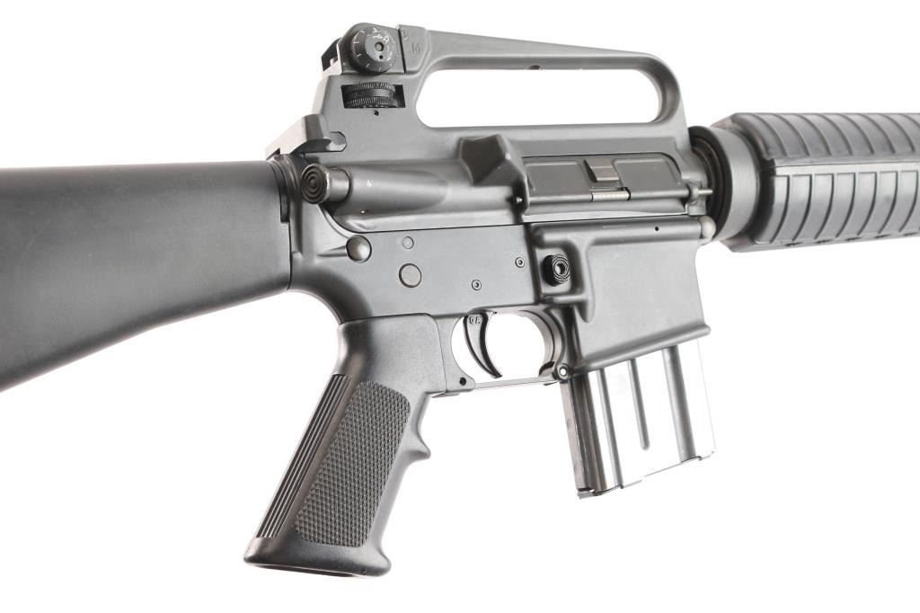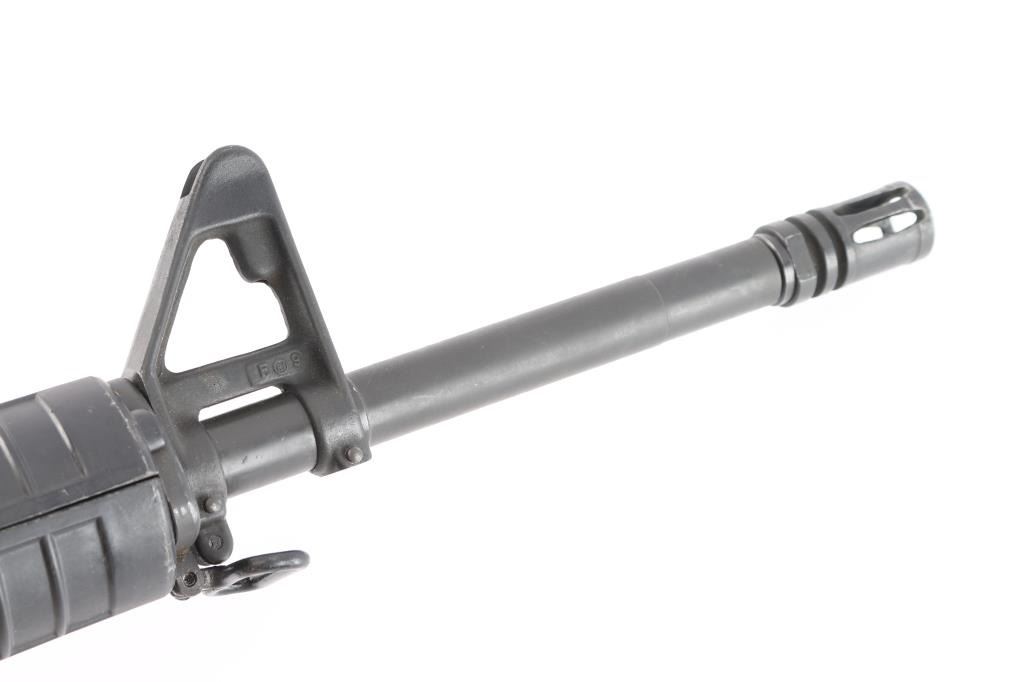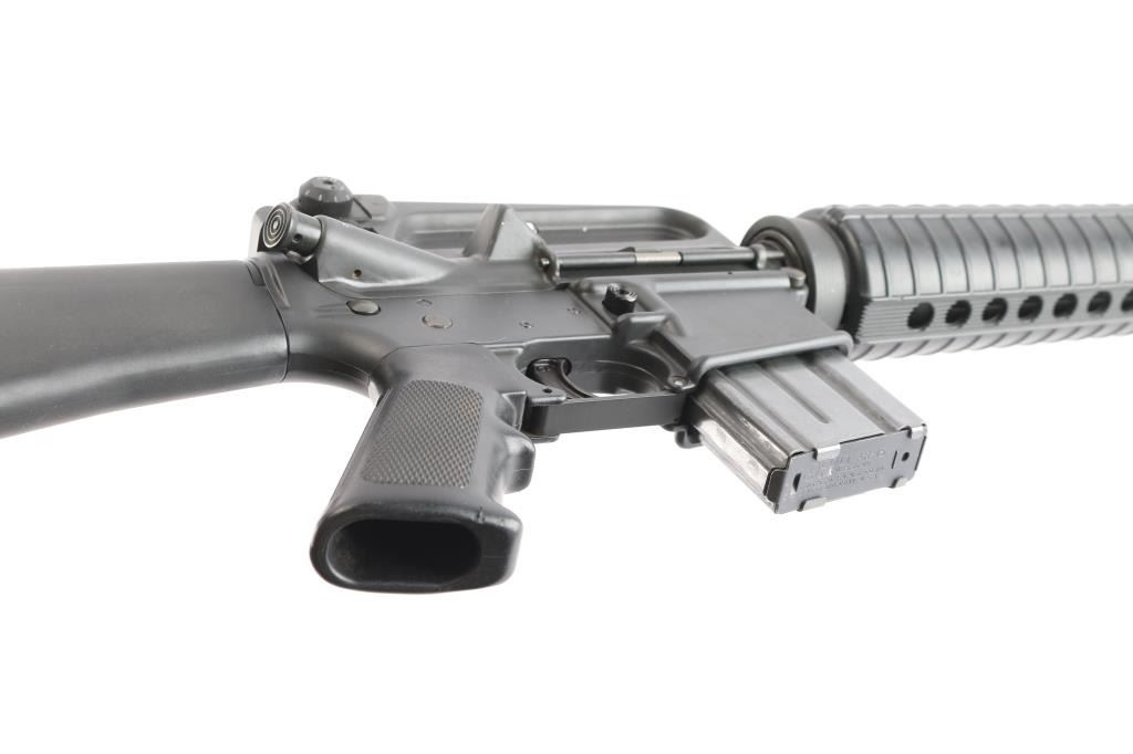 Heavy duty, light recoiling semiautomatic rifle features parkerized finish, black plastic furniture, "A2" length stock with butt storage compartment & fixed rear sling swivel, round rifle length hand guards, 20" heavy barrel, 5 flute flash suppressor, no bayonet lug, adjustable sights (front post sight with protector ears, A2 style rear L-flip peep with range adjustment wheel), shell deflector built into upper receiver, forward assist, spring loaded ejection port cover, lower receiver with fence around magazine release, manual safety, front sling swivel, later checkered pistol grip with finger shelf, serrated back strap. Barrel marked "C MP 5.56 NATO 1/7 HBAR". Upgraded with a Geissele competition 3 lb trigger. Bore is excellent/bright. Overall external appearance is very good or better, retains 98% finish, some very minor scratches & rub marks. Plastic furniture is very good condition with minor blemishes. Includes (1) 20 rd Colt magazine.