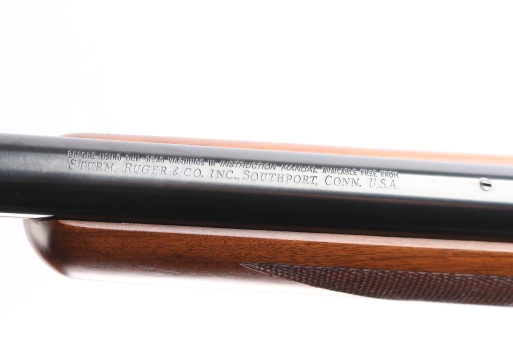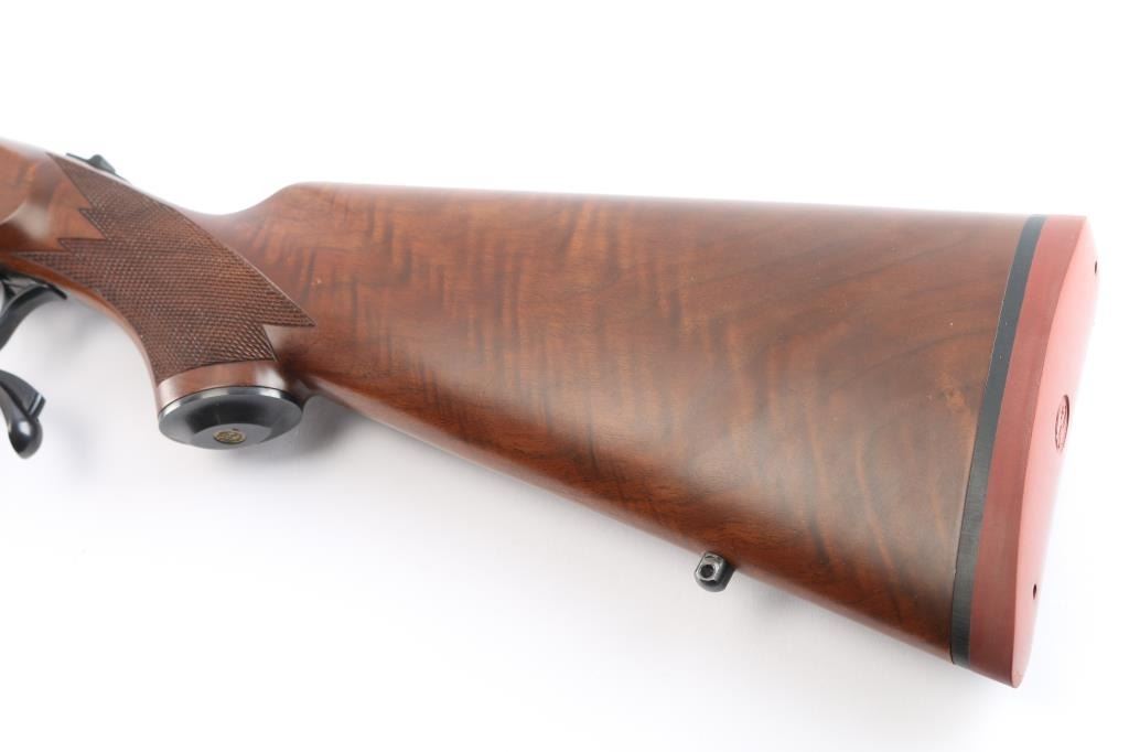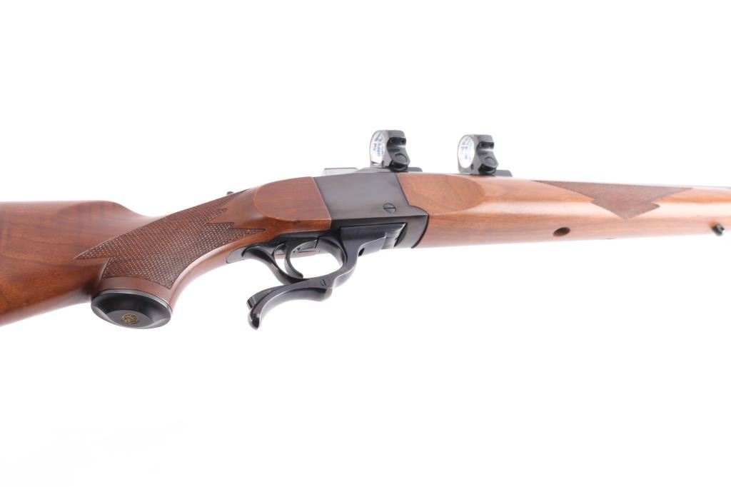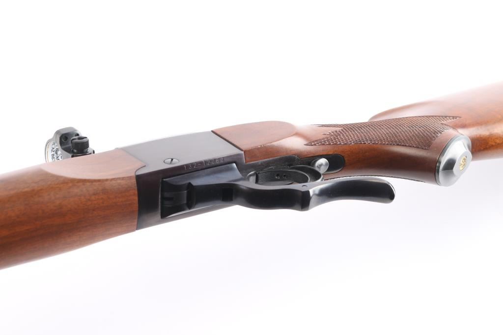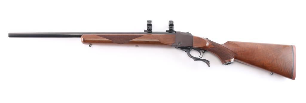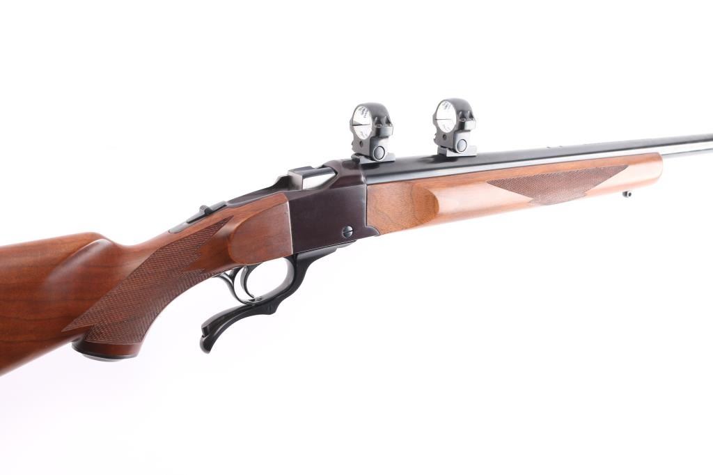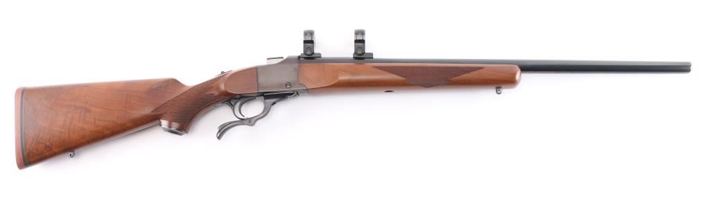 '1V' Desirable single-shot falling block sporting rifle chambered in .22-250 Remington. Manufactured in Southport, CT circa 1981. Features a blued finish, 24" round tapered medium contour barrel without provisions for sights, installed scope blocks with 1” factory rings, serrated curved trigger, sliding tang safety, two-piece finger lever, sling swivel studs, point checkered select American Walnut semi-beavertail forend, and semi-pistol grip shoulder stock with metal grip cap, red factory recoil pad & 13 5/8” LOP. Rifle exhibits approximately 98% of its original blued finish showing minor wear on the lever & upper tang and the receiver turned slightly plum. The action is mechanically sound, the bore is excellent and the walnut stocks are excellent with a minor blemishes.