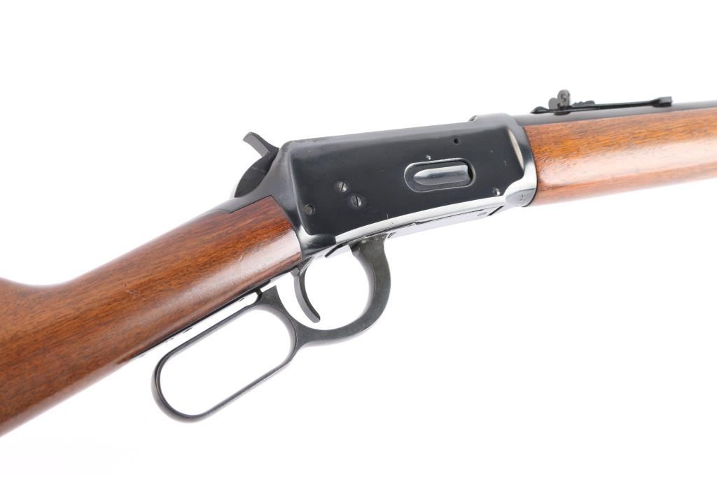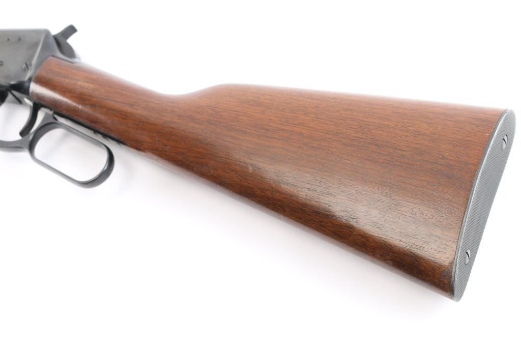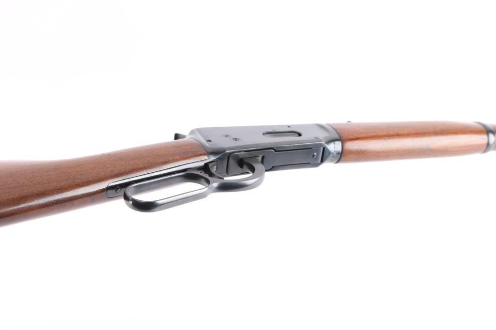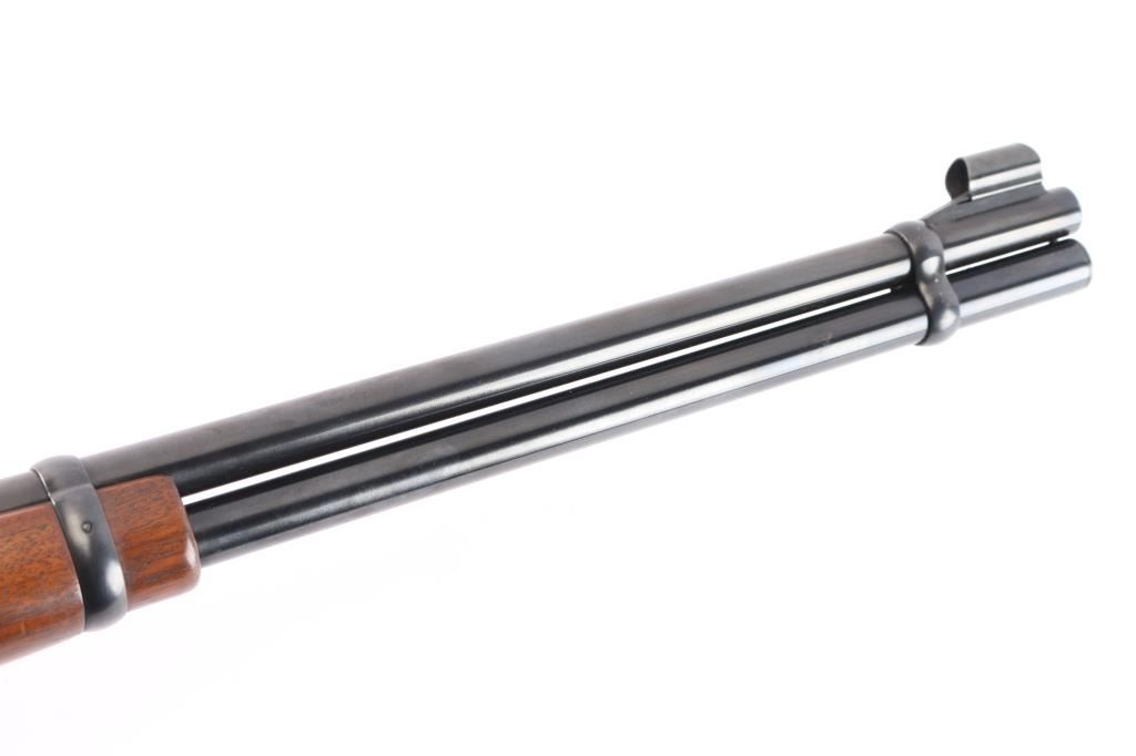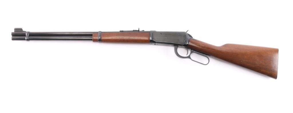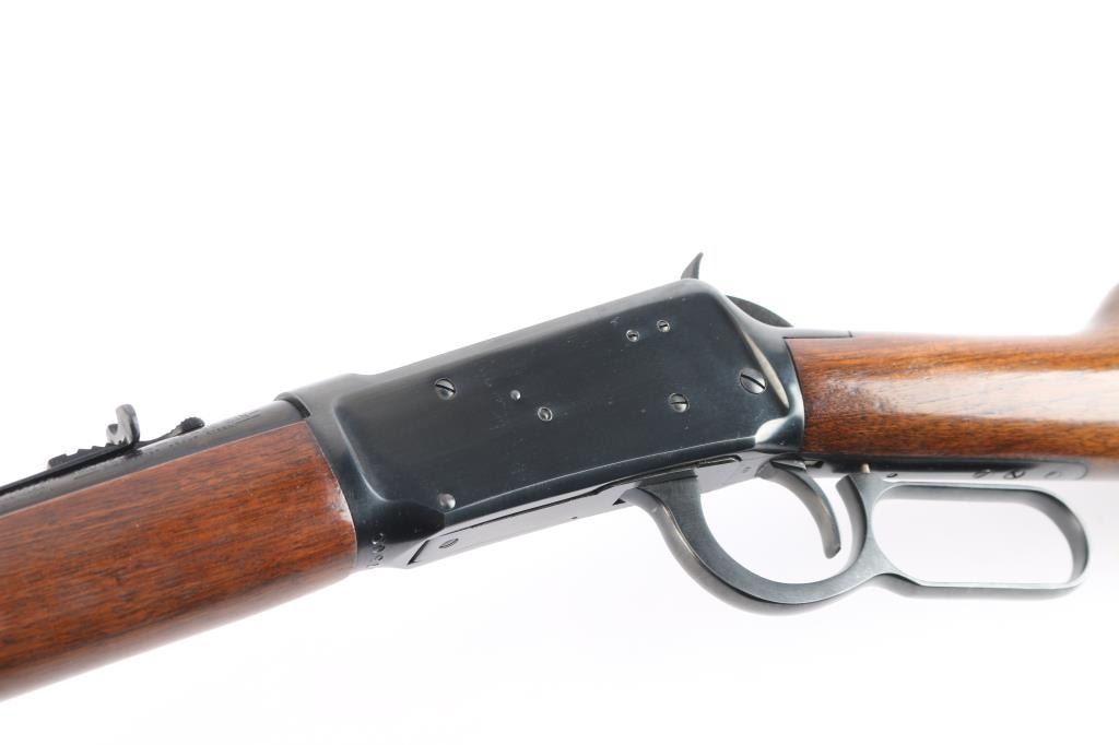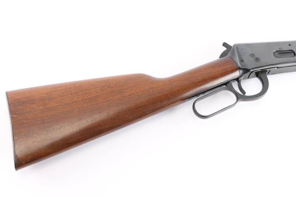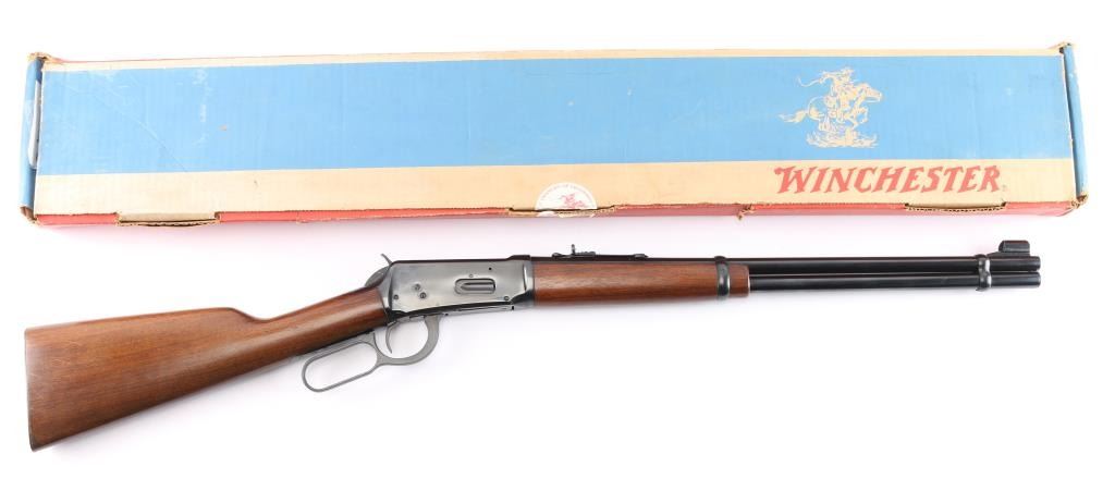 Pre-64 Eastern Carbine' Vintage lever action repeating rifle chambered in .30-30 Winchester, manufactured in New Haven, CT circa 1955. Features a blued finish, 20" tapered barrel, full-length tube magazine, hooded ramped blade/bead front sight, 22G adjustable sporting rear sight, smooth trigger, serrated hammer spur, steel receiver, two barrel bands, smooth walnut forend and straight grip shoulder stock with knurled steel buttplate. Bore is excellent/bright. Retains 97% original blue finish with minor scratches. Wood is very good with some light scratches. Action is smooth. Winchester markings are crisp/clear. Comes in the original red & blue factory box with matching label, paperwork.