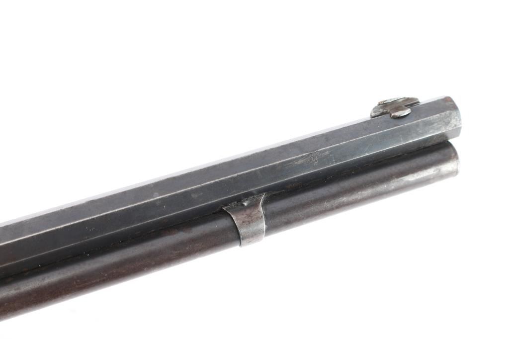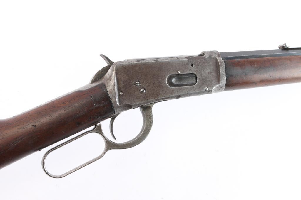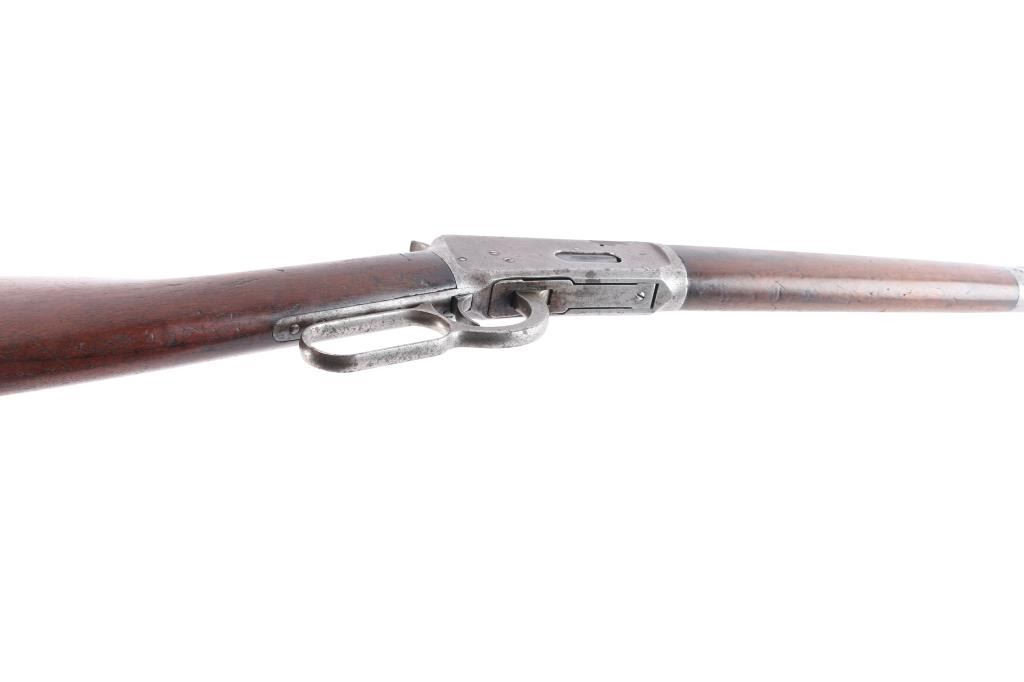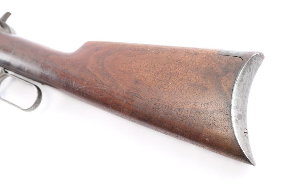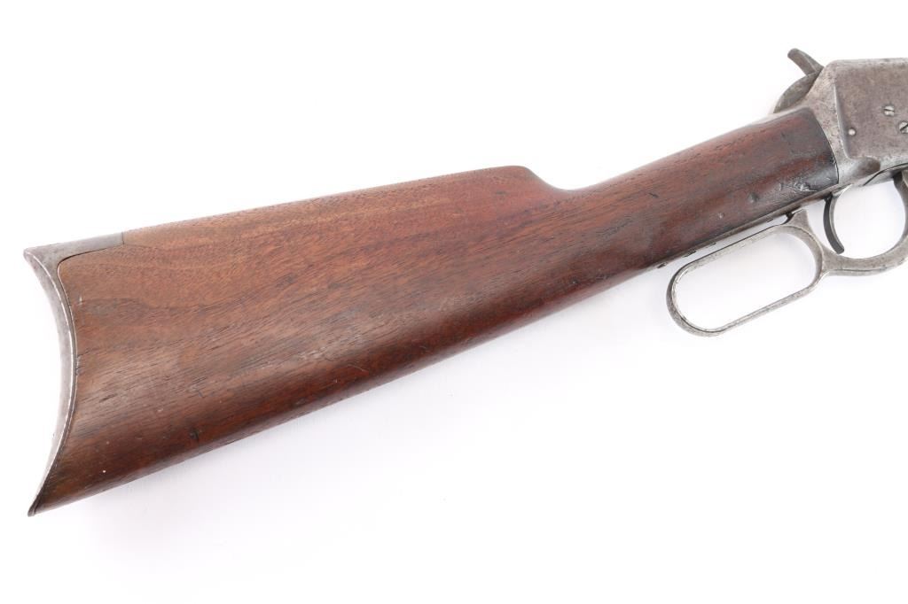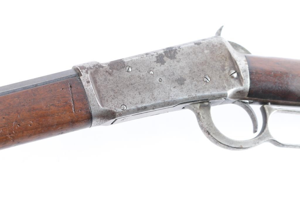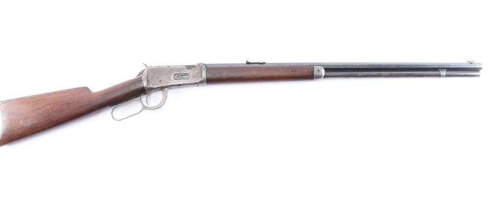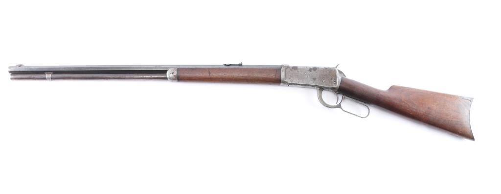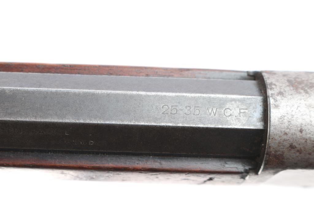 Vintage lever action repeating rifle chambered in .35-35 Winchester, manufactured in New Haven, CT circa 1895. Features a blued finish, the 26" octagon barrel, full-length tube magazine, dovetailed blade/bead front sight, two leaf, v-notch flip rear sight, The top leaf is broken and they are frozen in place, smooth trigger, knurled hammer spur, steel receiver, single magazine band, smooth walnut forend with metal cap, straight grip shoulder stock with smooth metal crescent buttplate. Bore is dark/rough with rifling present. Barrel & magazine tube surfaces show full coverage of a dull blue/light gray color, with edge losses, scattered tiny pits, receiver shows a molted dull gray patina with scattered light pitting and patches of dark brown surface rust. Markings are crisp. Edges of barrel flats fairly sharp. Wood is good/sound with many minor scratches/dings and a shallow gouge on the left forearm. Action works well.