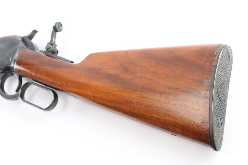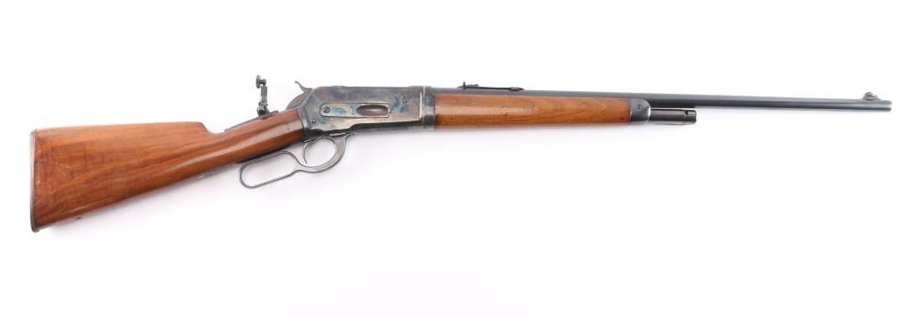 1886 Winchester special order take down rifle with 24" round barrel, 1/2 magazine, hard rubber shotgun butt plate in 33 caliber. Shows 95-98% of a restored blue and case hardened finish that was professionally done leaving good markings. The butt stock shows two swivel holes in the belly and one was plugged before refinish. The toe of butt plate is oversized and appears authentic but not to this later model. Action good, bore bright. Late Lyman style tang sight added. Manufactured 1920.
