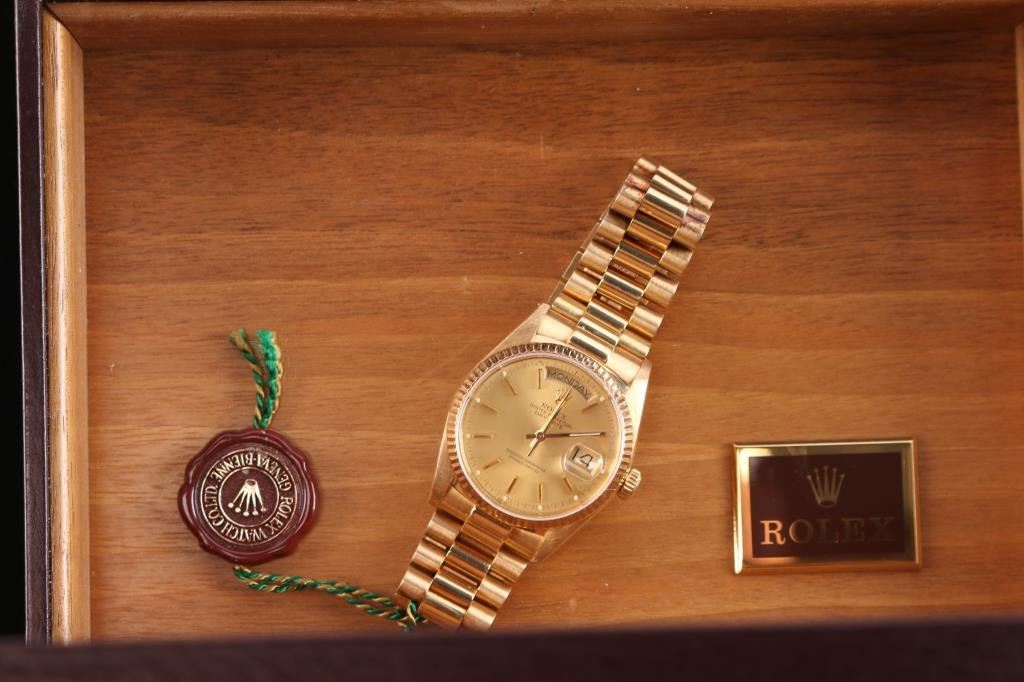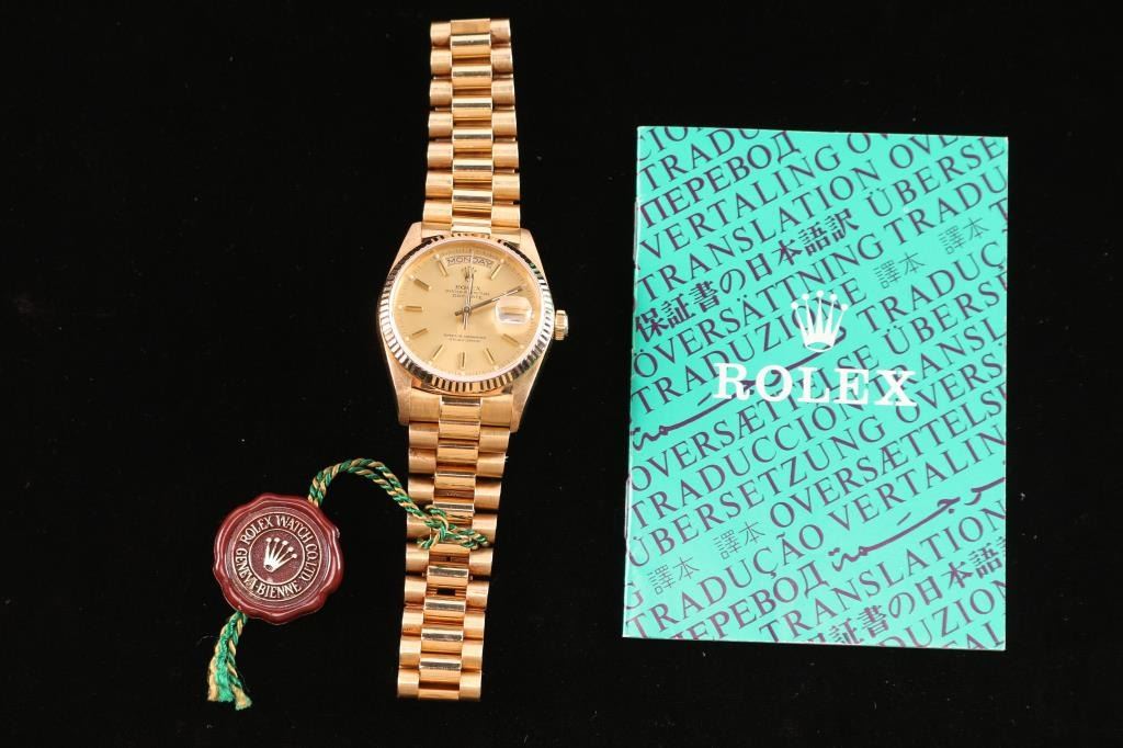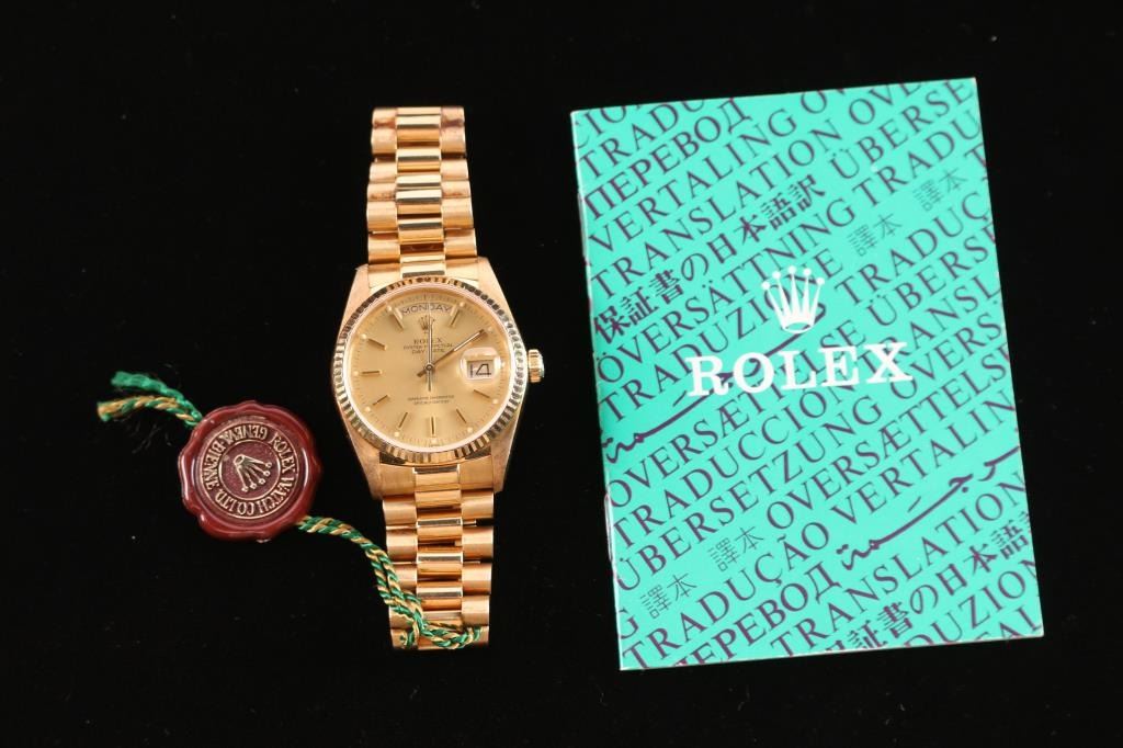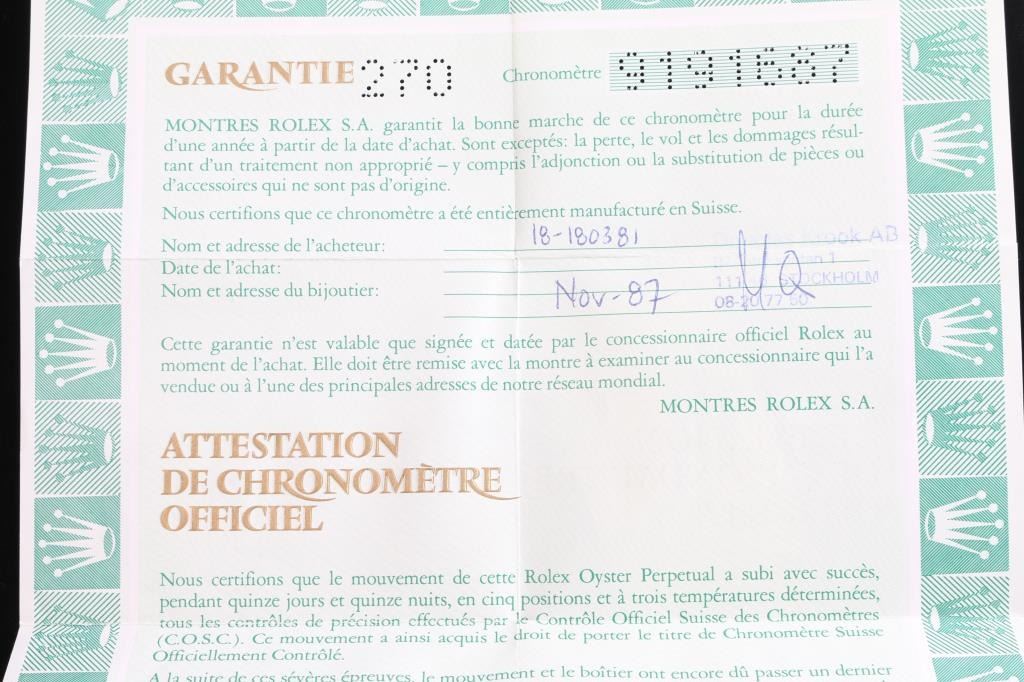 18Kt Yellow Gold Chronometer , 1987 Stockholm Purchased. Reference Number 18038, serial number 9191687 country code 270 includes box , hang tag, Rolex paperwork and warranty. Gold watch with sunburst dial pattern and champagne colored face and fluted bezel. Pre-owned - Good: This item has been gently used but is in good condition. It might have a few signs of wear, like light scratches or tarnishing.