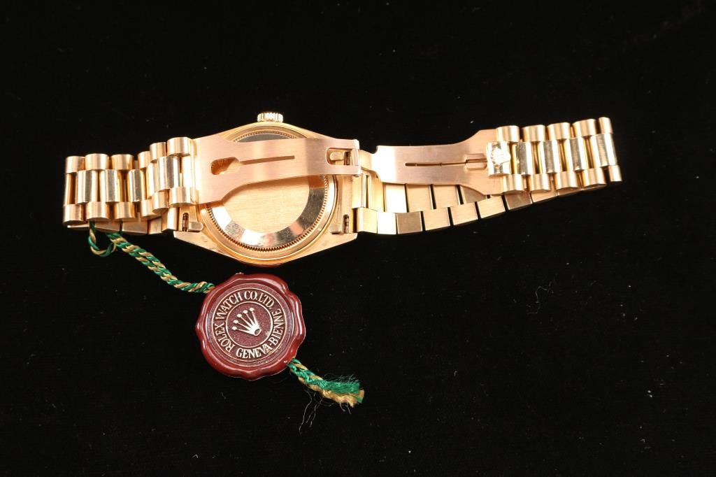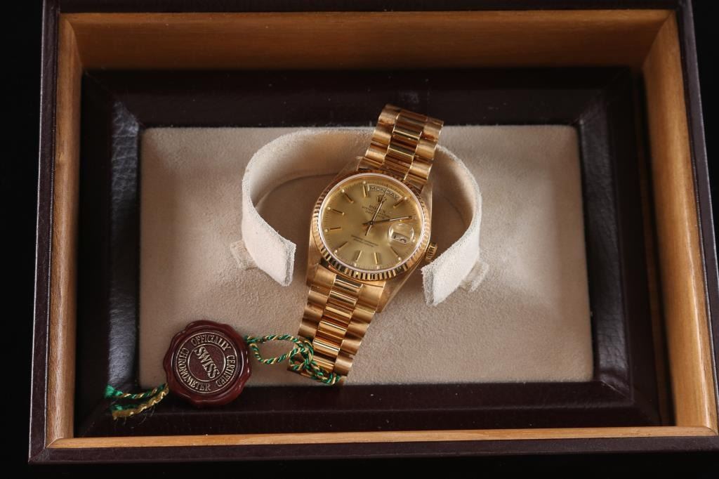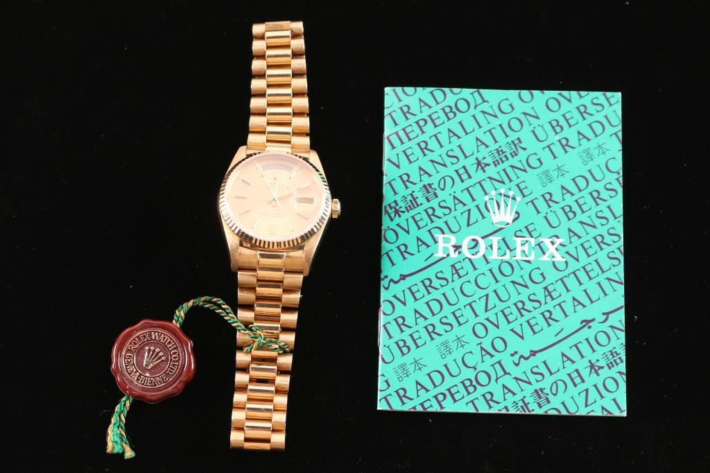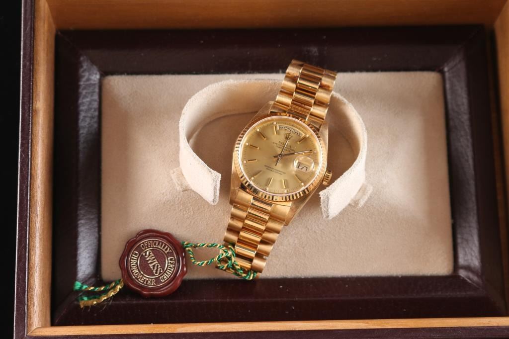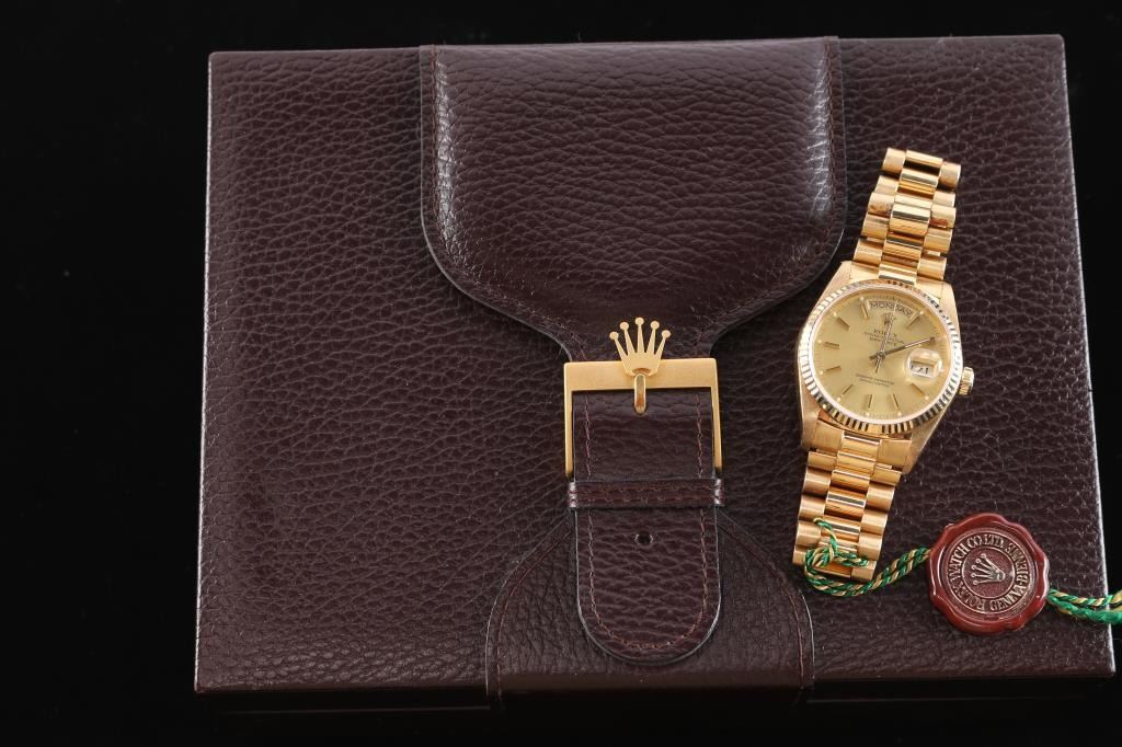18Kt Yellow Gold Chronometer , 1987 Stockholm Purchased. Reference Number 18038, serial number 9191687 country code 270 includes box , hang tag, Rolex paperwork and warranty. Gold watch with sunburst dial pattern and champagne colored face and fluted bezel. Pre-owned - Good: This item has been gently used but is in good condition. It might have a few signs of wear, like light scratches or tarnishing.