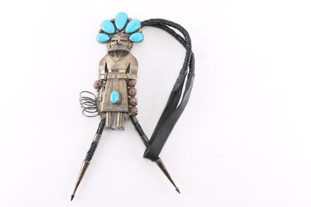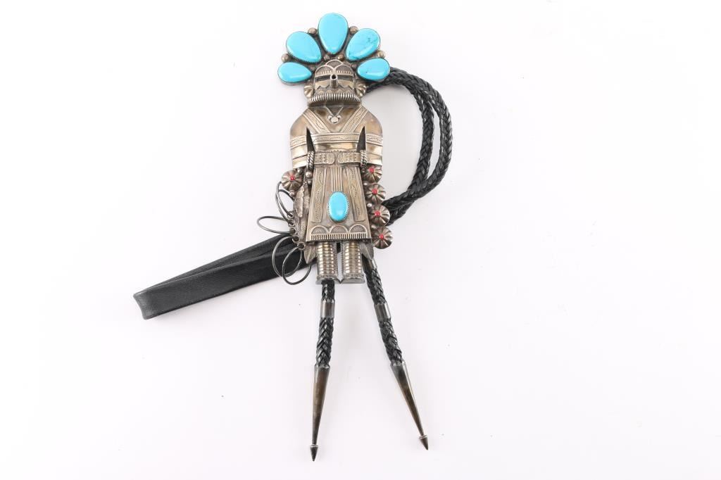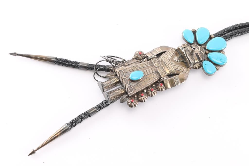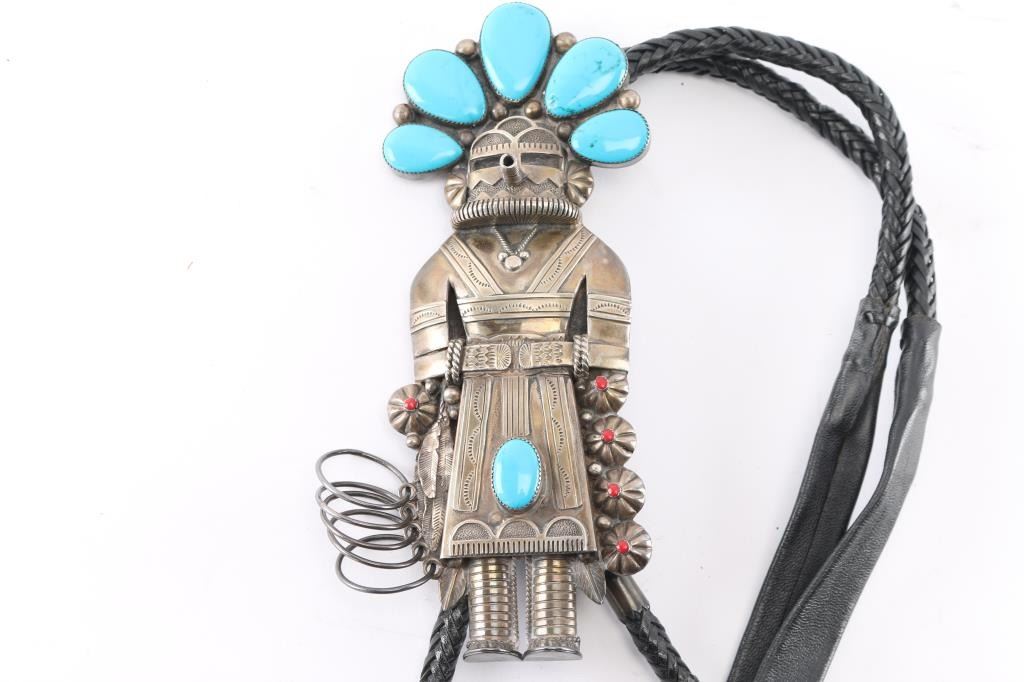Sterling silver kachina with 6 large blue turquoise stones and 5 dots of coral in concho design. Tips are sterling silver and cord is braided black leather with sterling accents. Original receipt from Biltmore Jewelers in Scottsdale AZ in 2011 is $1300.