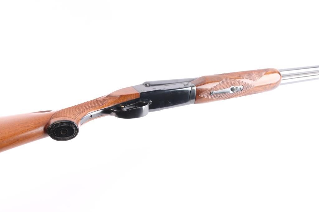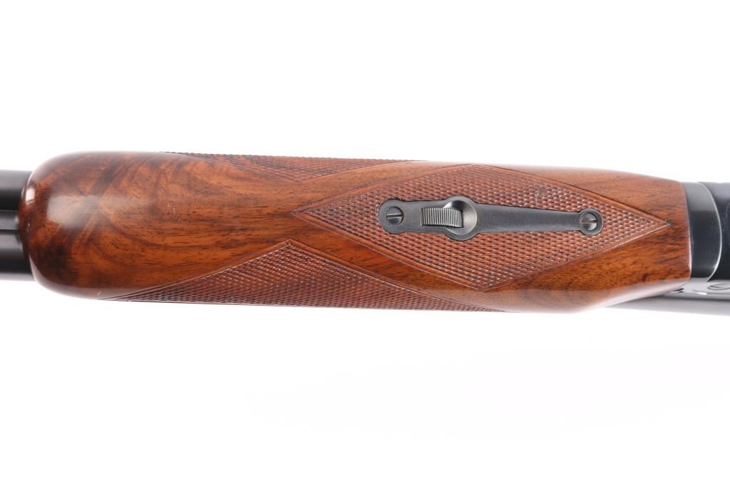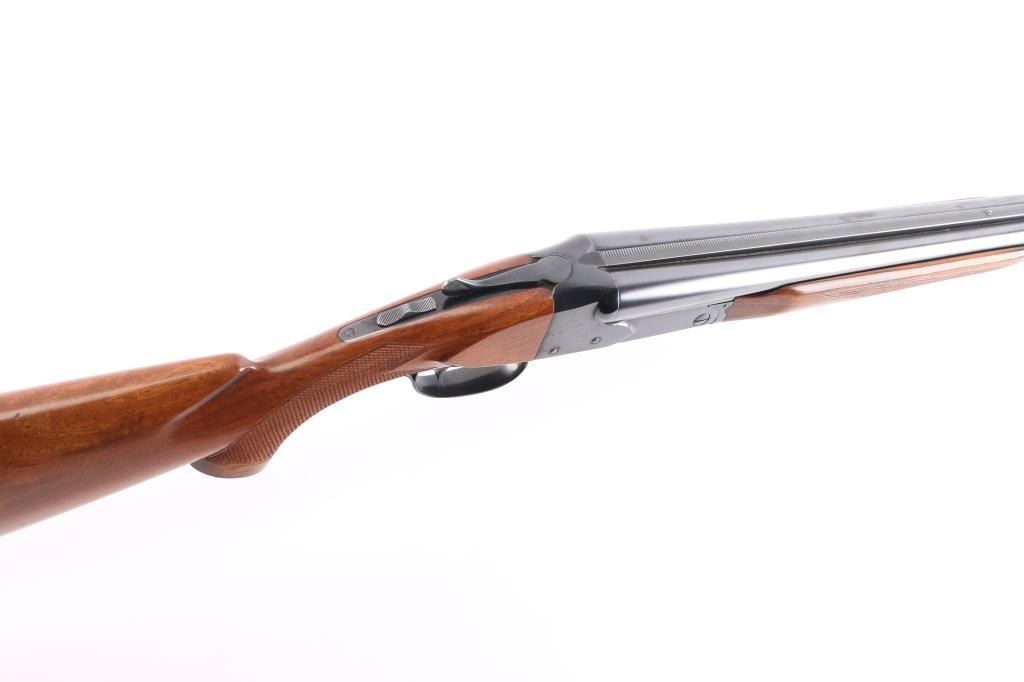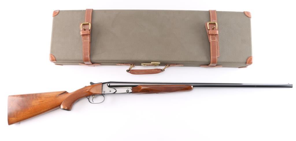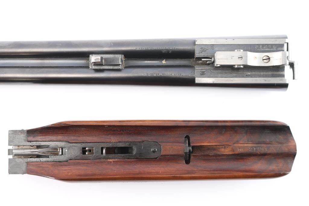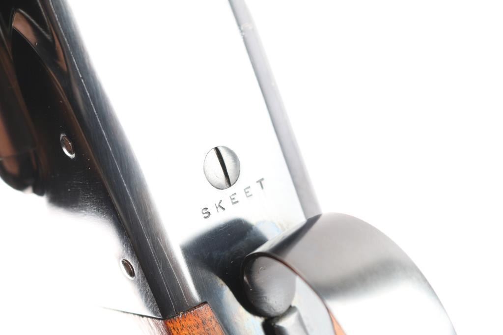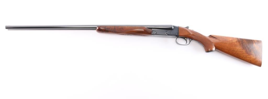 Features a blued refinish, 28" barrels with matted solid rib & fixed chokes marked WS-2 / WS-1, selective ejectors, red Bradley front sight, steel mid-bead, single trigger with push button barrel selector, non-automatic tang safety, knurled top lever, oil finished walnut beavertail forend with diamond pattern checkering and pistol grip shoulder stock with bakelite grip cap and checkered bare butt. Stock dimensions – drop at comb 1 9/16”, drop at heel 2 1/4”, length of pull 13 7/8” and cast-off approx. ¼”. Matching serial numbers are found on the receiver, barrels, forend and forend metal.