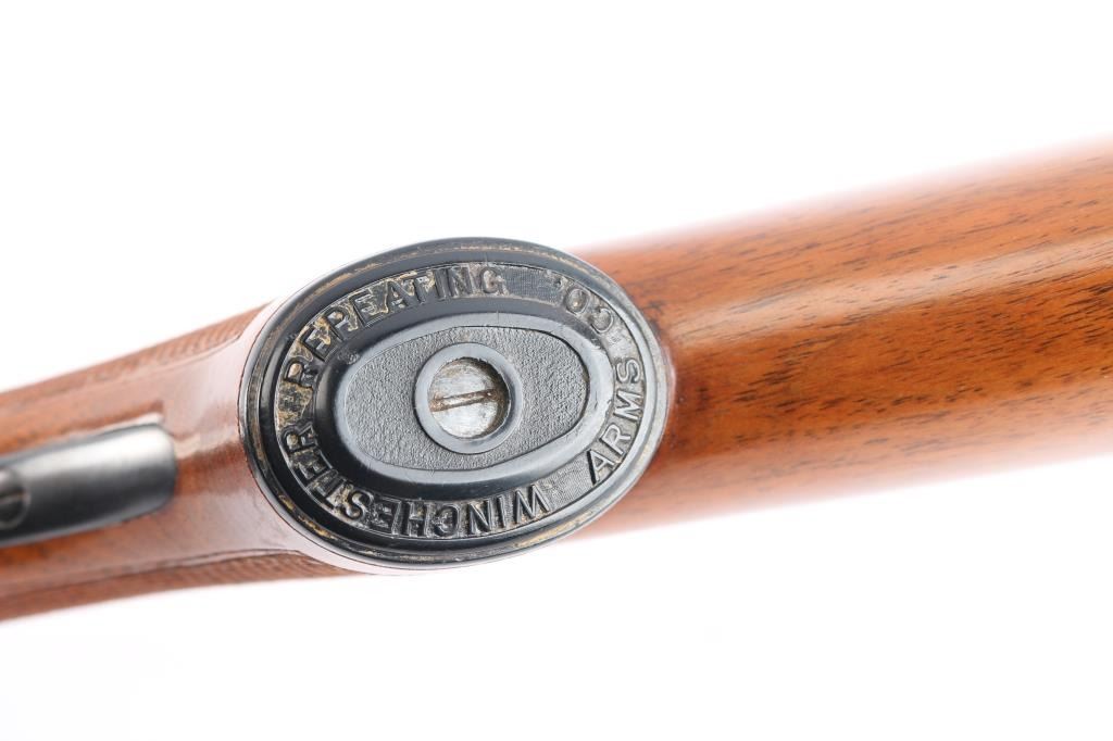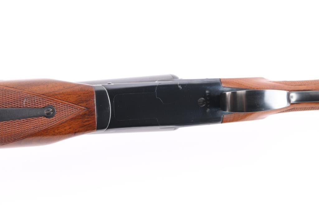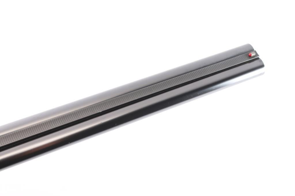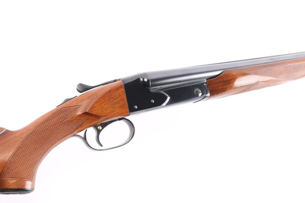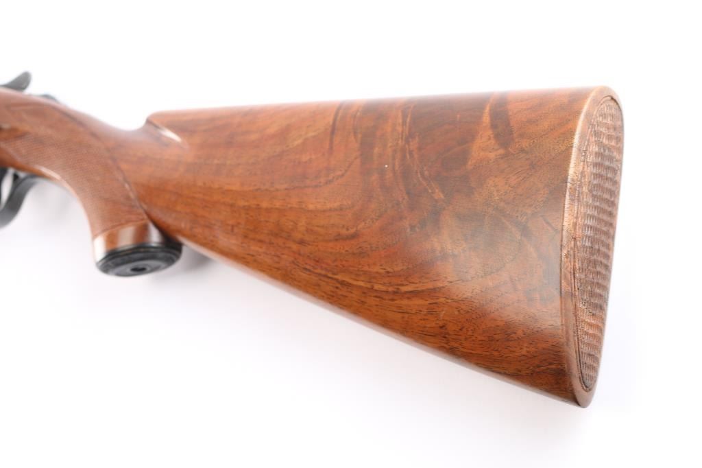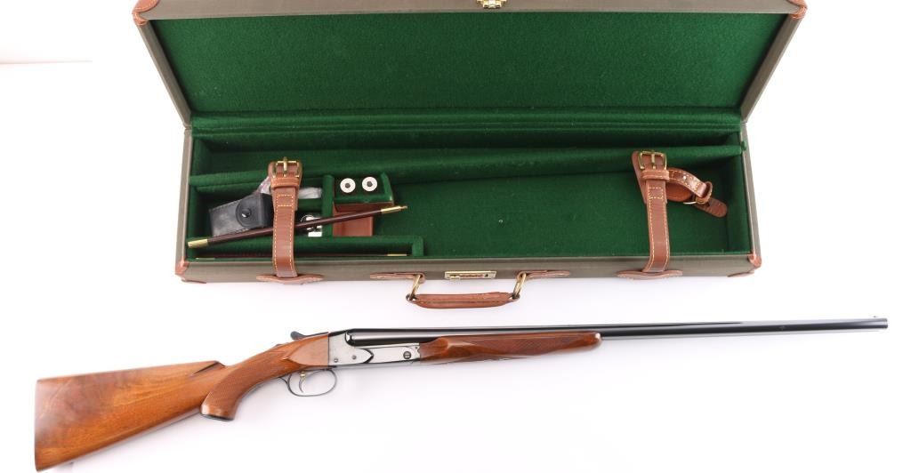Features a blued refinish, 28" barrels with matted solid rib & fixed chokes marked WS-2 / WS-1, selective ejectors, red Bradley front sight, steel mid-bead, single trigger with push button barrel selector, non-automatic tang safety, knurled top lever, oil finished walnut beavertail forend with diamond pattern checkering and pistol grip shoulder stock with bakelite grip cap and checkered bare butt. Stock dimensions – drop at comb 1 9/16”, drop at heel 2 1/4”, length of pull 13 7/8” and cast-off approx. ¼”. Matching serial numbers are found on the receiver, barrels, forend and forend metal.