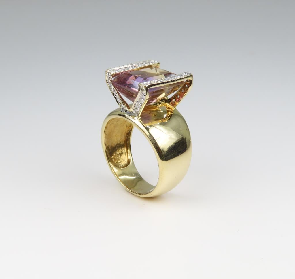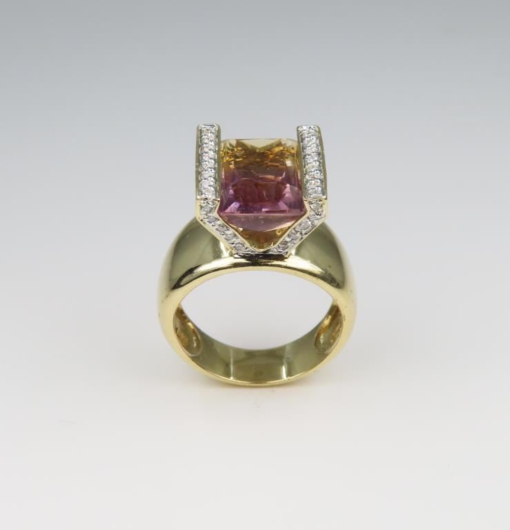 and Diamond Ring featuring an 8.00 carat emerald cut Purple/yellow Ametrine pave set with 36 round Diamonds set in a unique contemporary style 14 karat yellow gold setting, ring size 7. Retail $6,000-$8,000