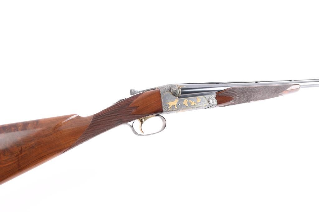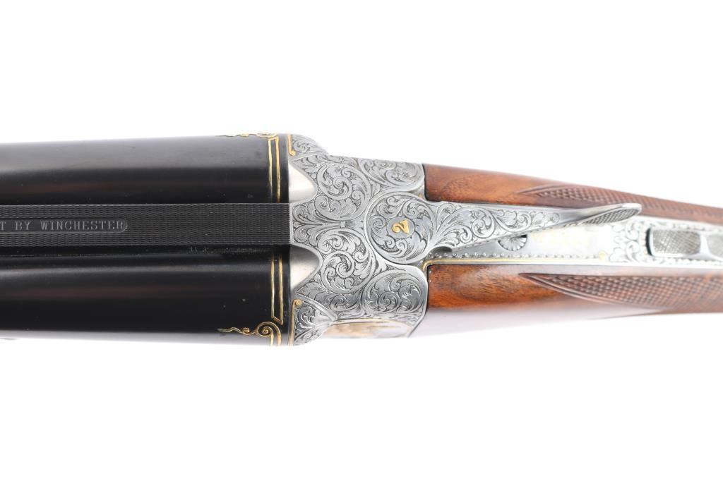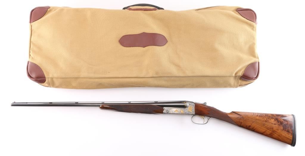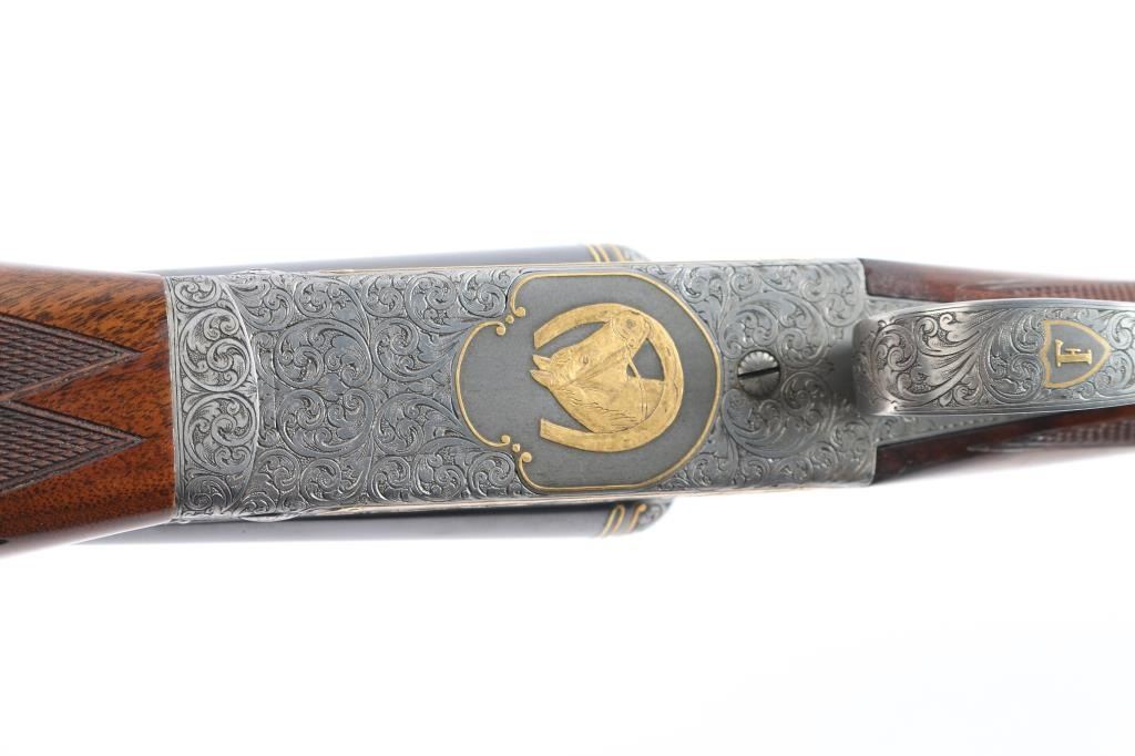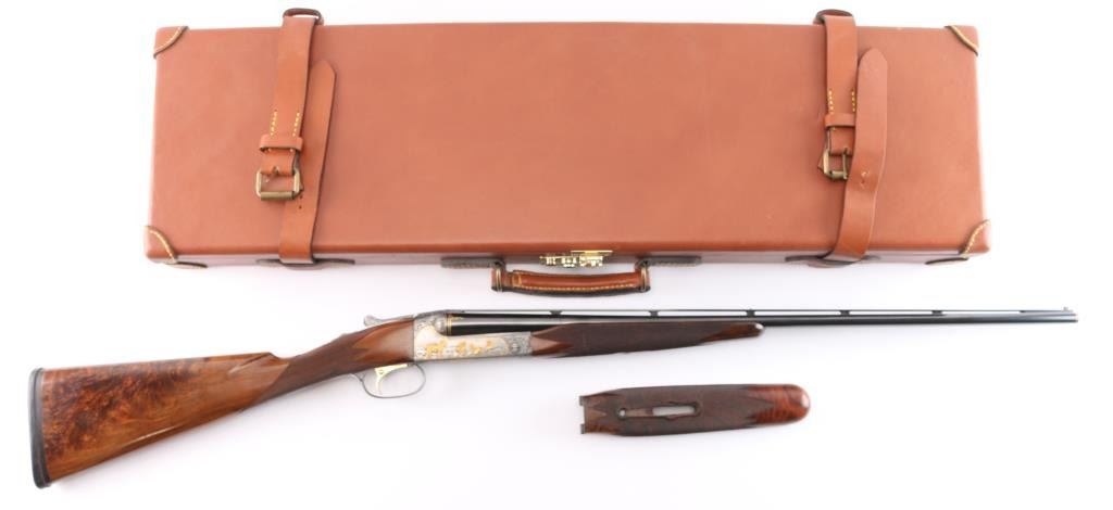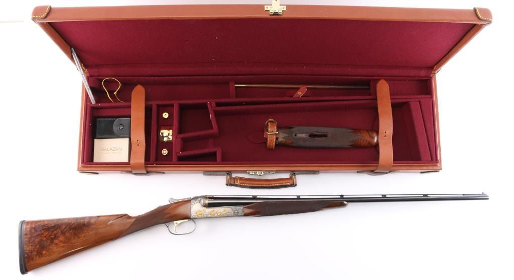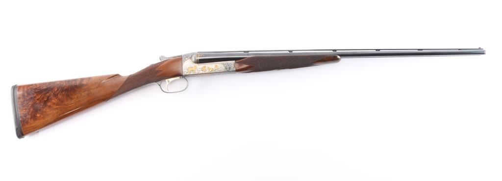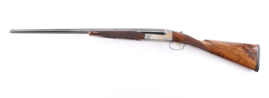 Stunning Angelo Bee engraved, gold inlaid & signed side-by-side double barrel boxlock shotgun chambered for up to 3" .410 bore shells. This shotgun is number 2 of a matched consecutive numbered set with #32676 a 28 Ga shotgun in this auction. Embellishments include gold bands at the muzzle, double gold bands w/ gold filigree design at the breech, gold bordered game scene on the right side of the receiver depicting a gold pointer flushing three gold grouse, gold bordered game scene on the left side of the receiver depicting three gold birds in flight, gold bordered gold horse head inside a gold horseshoe with shaded background on the trigger plate, gold “F” inside a gold outlined shield on the trigger guard, gold filled serial number, half-length gold bordering on the upper tang, gold “2” on the top lever and forend catch plate, gold filled [arrow]/”L” & [arrow]/”R” barrel selector markings, and acanthus scroll engraving comprising the balance of the receiver. The left side of the receiver is engraved “ABEE” with an engraved bee proceeding it. Configuration: Blued 26” barrels with ventilated sighting rib & fixed Mod / Mod chokes, jeweled barrel flats & water table both with lightening cuts on both, selective ejectors, red Bradley front sight, brass mid-bead, gold single trigger with push button barrel selector, non-automatic tang safety with gold filled “SAFE”, Frech greyed receiver with polished game scene backgrounds, knurled top lever, gloss finished fancy walnut beavertail forend with deluxe grade pattern checkering, and straight grip shoulder stock with black spacer and leather wrapped red recoil pad. Stock dimensions – drop at comb 1 5/8”, drop at heel 2 3/8 ”, length of pull 14 3/8” and neutral cast. Matching serial numbers are found on the receiver, barrel, forend, and forend metal. The barrel rib is marked “CUSTOM BUILT BY WINCHESTER”. The barrel flats are stamped with [Winchester proof], serial number and “410 BORE 3 IN. CHAM”. Includes an additional beavertail forend with matching serial number, deluxe grade pattern checkering, ebony reinforcements at the rear and no metal. Also Includes a leather wrapped Galazan partitioned trunk case with canvas cover, cleaning tools, and gold snap caps & oiler bottle. Shotgun retains approximately 99% finish overall showing some minor oxidation on the receiver, a dent in the gold wire inlay on the left barrel. The action is tight with the top lever standing far right of center, the bores are excellent / bright and the walnut stocks excellent with minor handling marks.