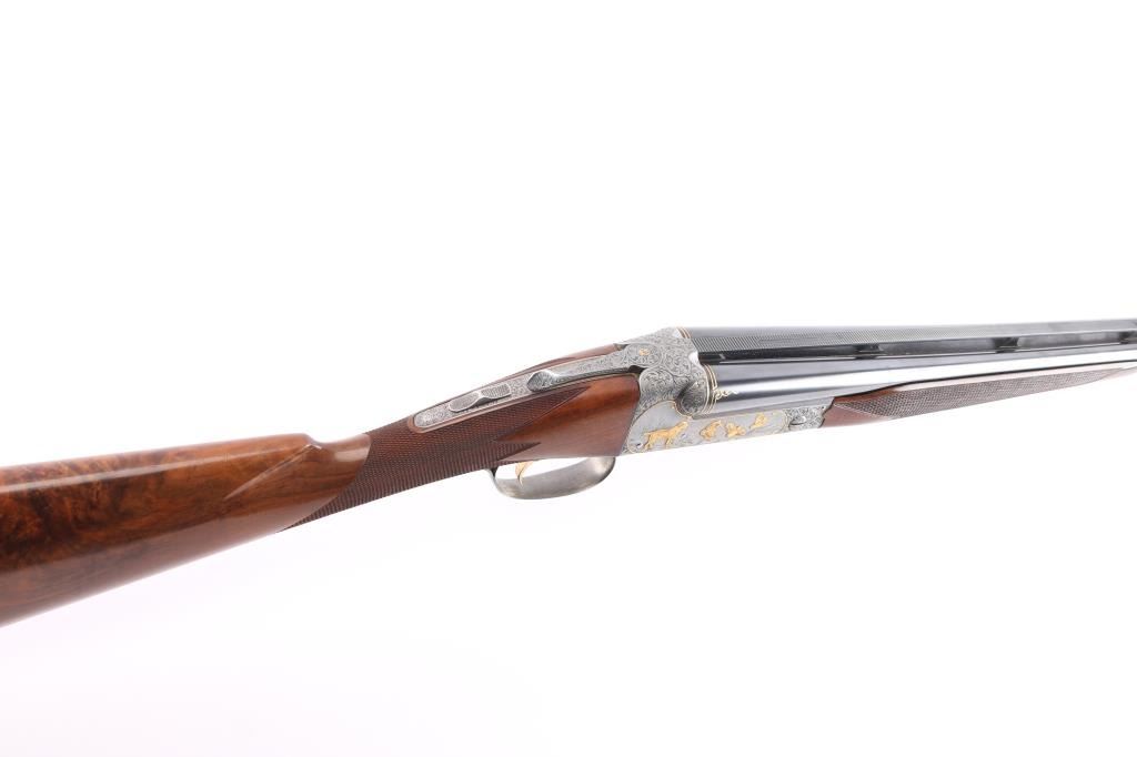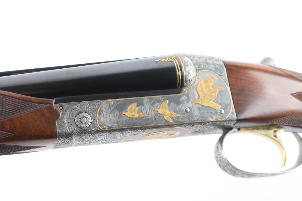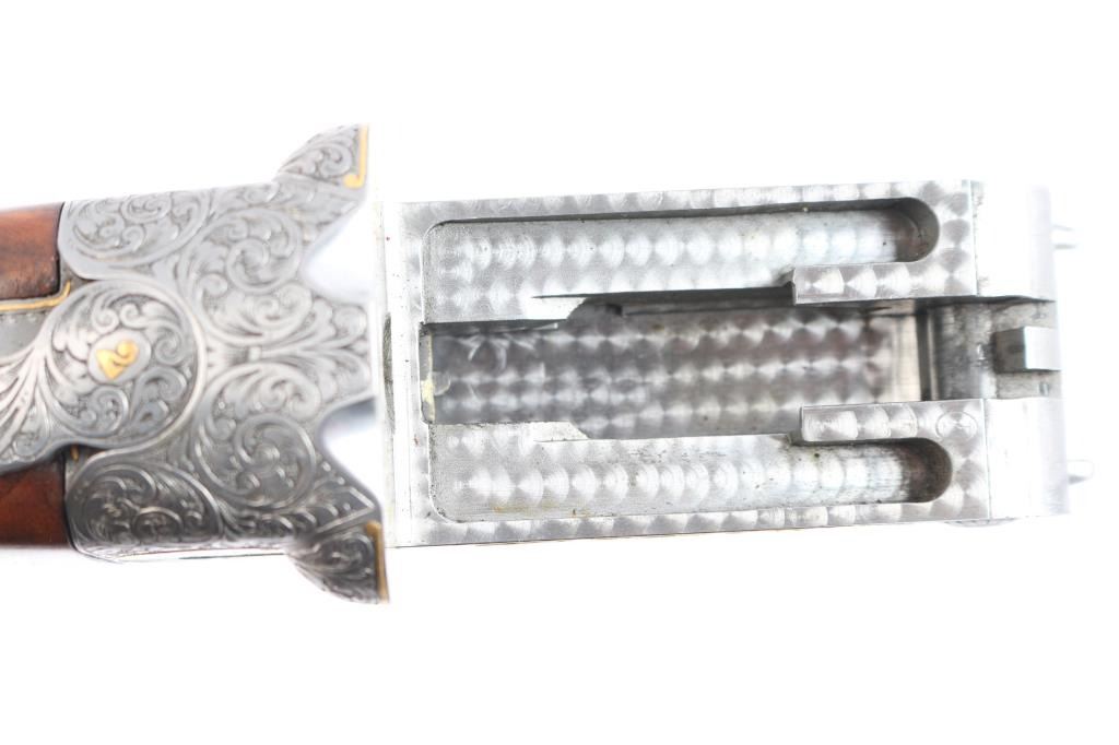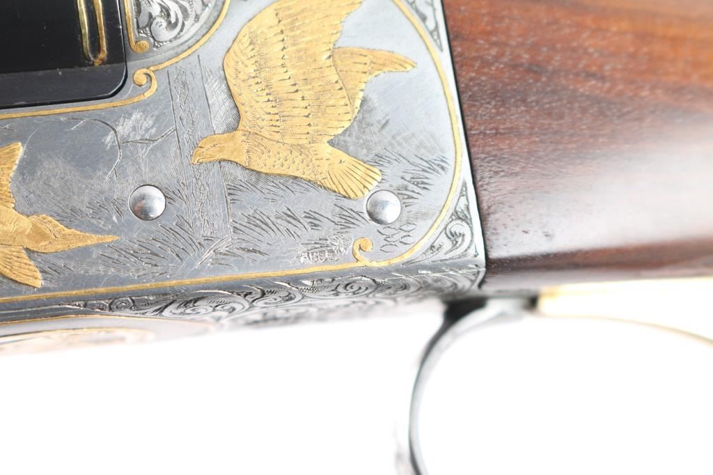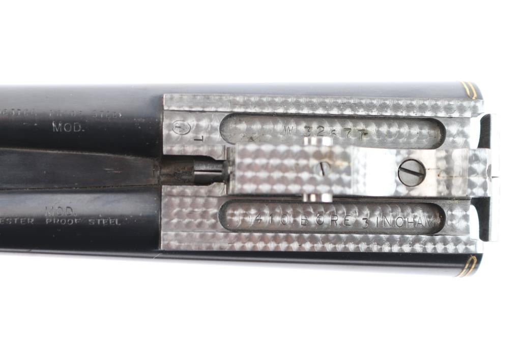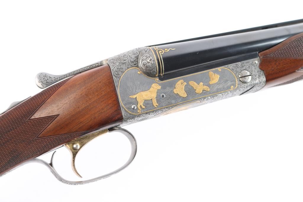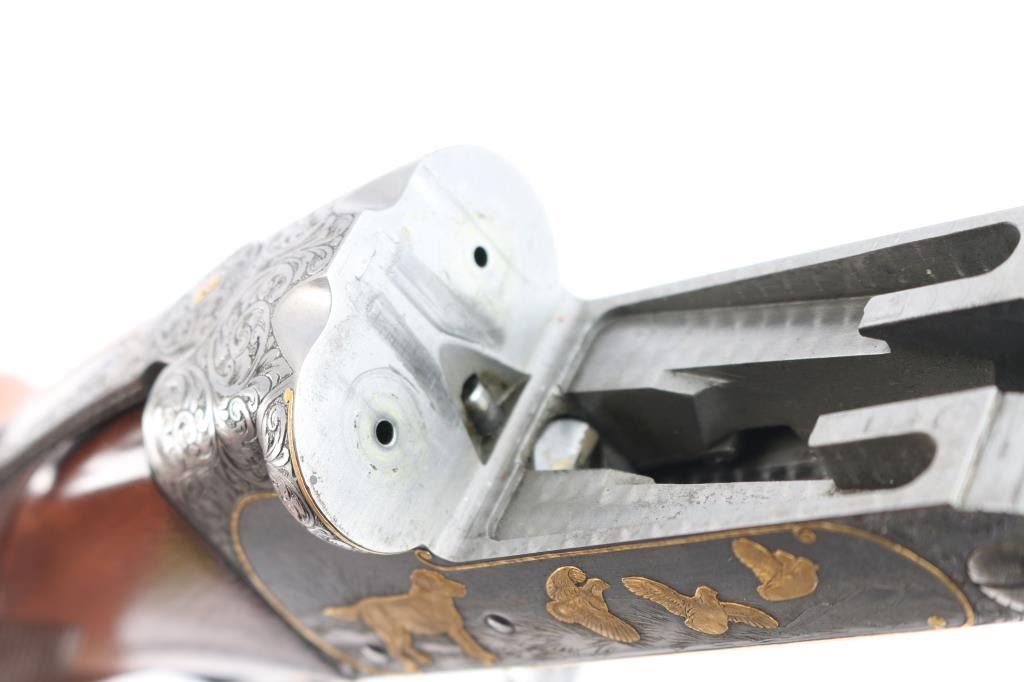 Stunning Angelo Bee engraved, gold inlaid & signed side-by-side double barrel boxlock shotgun chambered for up to 3" .410 bore shells. This shotgun is number 2 of a matched consecutive numbered set with #32676 a 28 Ga shotgun in this auction. Embellishments include gold bands at the muzzle, double gold bands w/ gold filigree design at the breech, gold bordered game scene on the right side of the receiver depicting a gold pointer flushing three gold grouse, gold bordered game scene on the left side of the receiver depicting three gold birds in flight, gold bordered gold horse head inside a gold horseshoe with shaded background on the trigger plate, gold “F” inside a gold outlined shield on the trigger guard, gold filled serial number, half-length gold bordering on the upper tang, gold “2” on the top lever and forend catch plate, gold filled [arrow]/”L” & [arrow]/”R” barrel selector markings, and acanthus scroll engraving comprising the balance of the receiver. The left side of the receiver is engraved “ABEE” with an engraved bee proceeding it. Configuration: Blued 26” barrels with ventilated sighting rib & fixed Mod / Mod chokes, jeweled barrel flats & water table both with lightening cuts on both, selective ejectors, red Bradley front sight, brass mid-bead, gold single trigger with push button barrel selector, non-automatic tang safety with gold filled “SAFE”, Frech greyed receiver with polished game scene backgrounds, knurled top lever, gloss finished fancy walnut beavertail forend with deluxe grade pattern checkering, and straight grip shoulder stock with black spacer and leather wrapped red recoil pad. Stock dimensions – drop at comb 1 5/8”, drop at heel 2 3/8 ”, length of pull 14 3/8” and neutral cast. Matching serial numbers are found on the receiver, barrel, forend, and forend metal. The barrel rib is marked “CUSTOM BUILT BY WINCHESTER”. The barrel flats are stamped with [Winchester proof], serial number and “410 BORE 3 IN. CHAM”. Includes an additional beavertail forend with matching serial number, deluxe grade pattern checkering, ebony reinforcements at the rear and no metal. Also Includes a leather wrapped Galazan partitioned trunk case with canvas cover, cleaning tools, and gold snap caps & oiler bottle. Shotgun retains approximately 99% finish overall showing some minor oxidation on the receiver, a dent in the gold wire inlay on the left barrel. The action is tight with the top lever standing far right of center, the bores are excellent / bright and the walnut stocks excellent with minor handling marks.