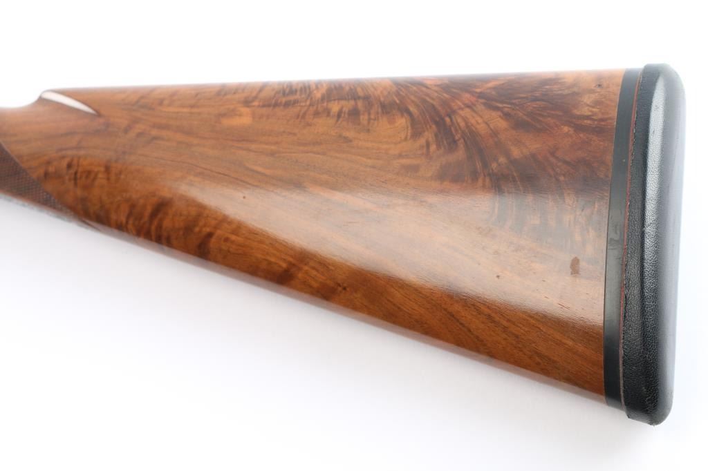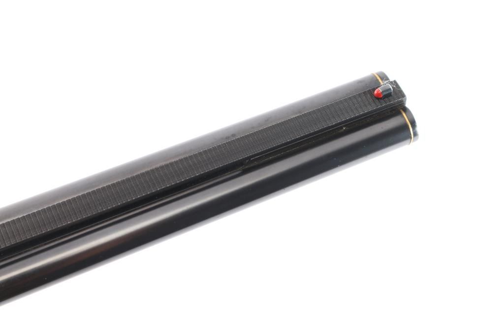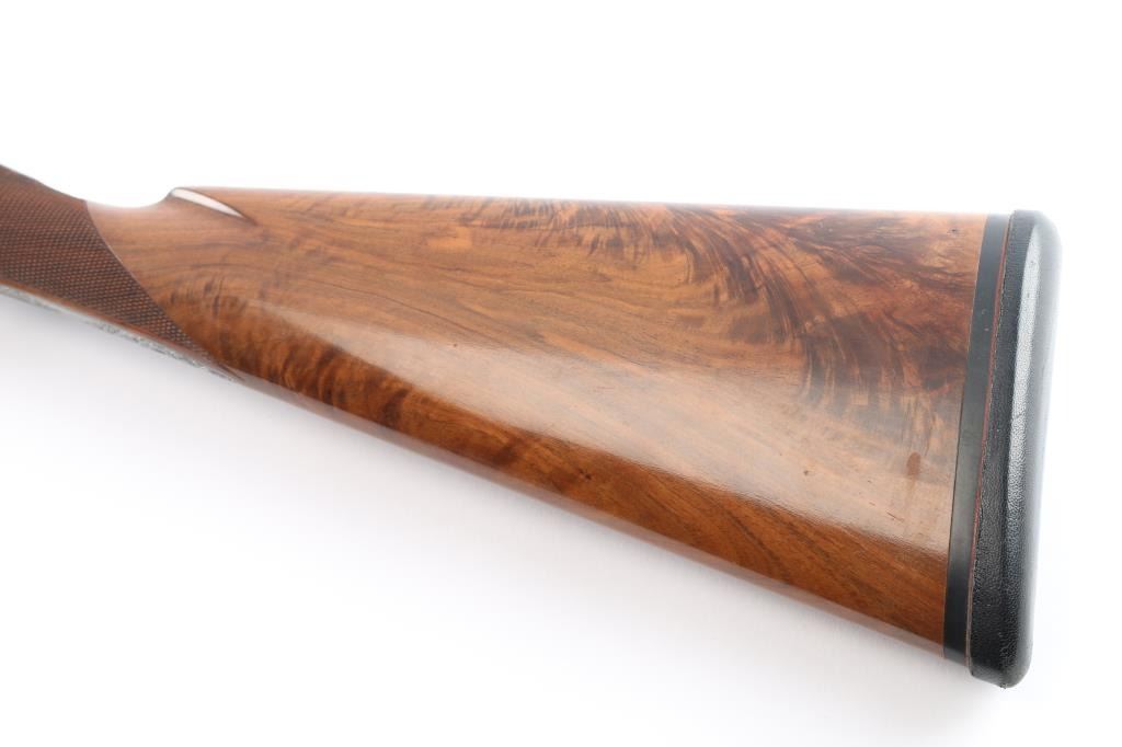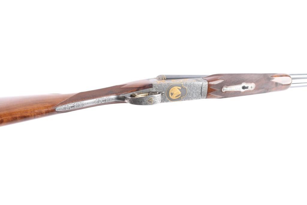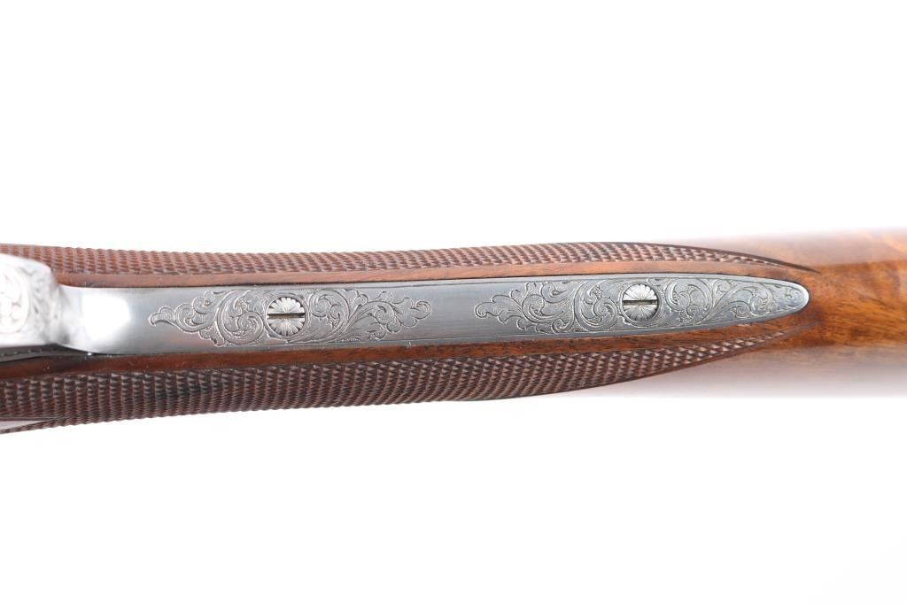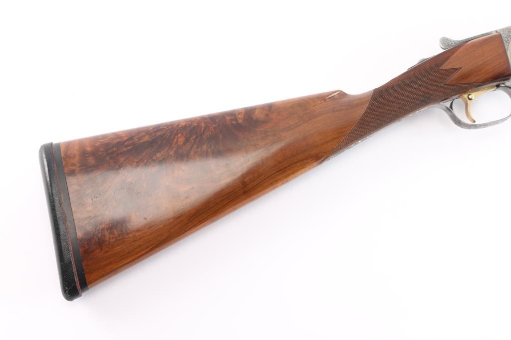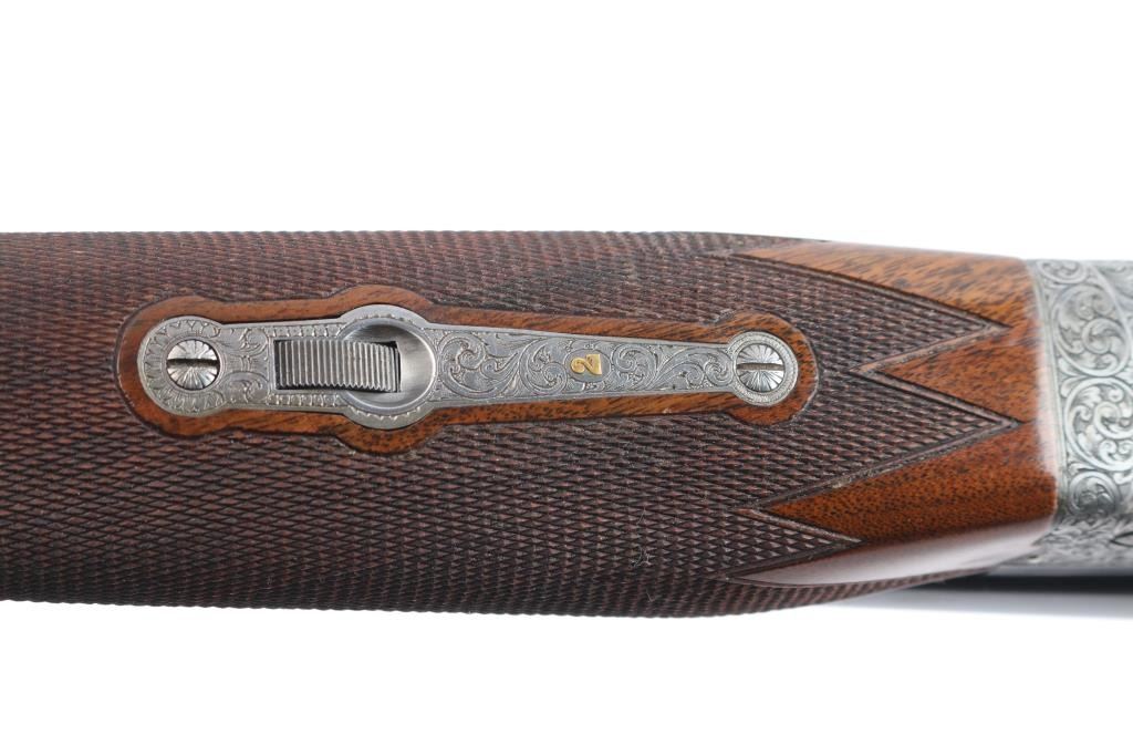 Stunning Angelo Bee engraved, gold inlaid & signed side-by-side double barrel boxlock shotgun chambered for up to 3" .410 bore shells. This shotgun is number 2 of a matched consecutive numbered set with #32676 a 28 Ga shotgun in this auction. Embellishments include gold bands at the muzzle, double gold bands w/ gold filigree design at the breech, gold bordered game scene on the right side of the receiver depicting a gold pointer flushing three gold grouse, gold bordered game scene on the left side of the receiver depicting three gold birds in flight, gold bordered gold horse head inside a gold horseshoe with shaded background on the trigger plate, gold “F” inside a gold outlined shield on the trigger guard, gold filled serial number, half-length gold bordering on the upper tang, gold “2” on the top lever and forend catch plate, gold filled [arrow]/”L” & [arrow]/”R” barrel selector markings, and acanthus scroll engraving comprising the balance of the receiver. The left side of the receiver is engraved “ABEE” with an engraved bee proceeding it. Configuration: Blued 26” barrels with ventilated sighting rib & fixed Mod / Mod chokes, jeweled barrel flats & water table both with lightening cuts on both, selective ejectors, red Bradley front sight, brass mid-bead, gold single trigger with push button barrel selector, non-automatic tang safety with gold filled “SAFE”, Frech greyed receiver with polished game scene backgrounds, knurled top lever, gloss finished fancy walnut beavertail forend with deluxe grade pattern checkering, and straight grip shoulder stock with black spacer and leather wrapped red recoil pad. Stock dimensions – drop at comb 1 5/8”, drop at heel 2 3/8 ”, length of pull 14 3/8” and neutral cast. Matching serial numbers are found on the receiver, barrel, forend, and forend metal. The barrel rib is marked “CUSTOM BUILT BY WINCHESTER”. The barrel flats are stamped with [Winchester proof], serial number and “410 BORE 3 IN. CHAM”. Includes an additional beavertail forend with matching serial number, deluxe grade pattern checkering, ebony reinforcements at the rear and no metal. Also Includes a leather wrapped Galazan partitioned trunk case with canvas cover, cleaning tools, and gold snap caps & oiler bottle. Shotgun retains approximately 99% finish overall showing some minor oxidation on the receiver, a dent in the gold wire inlay on the left barrel. The action is tight with the top lever standing far right of center, the bores are excellent / bright and the walnut stocks excellent with minor handling marks.