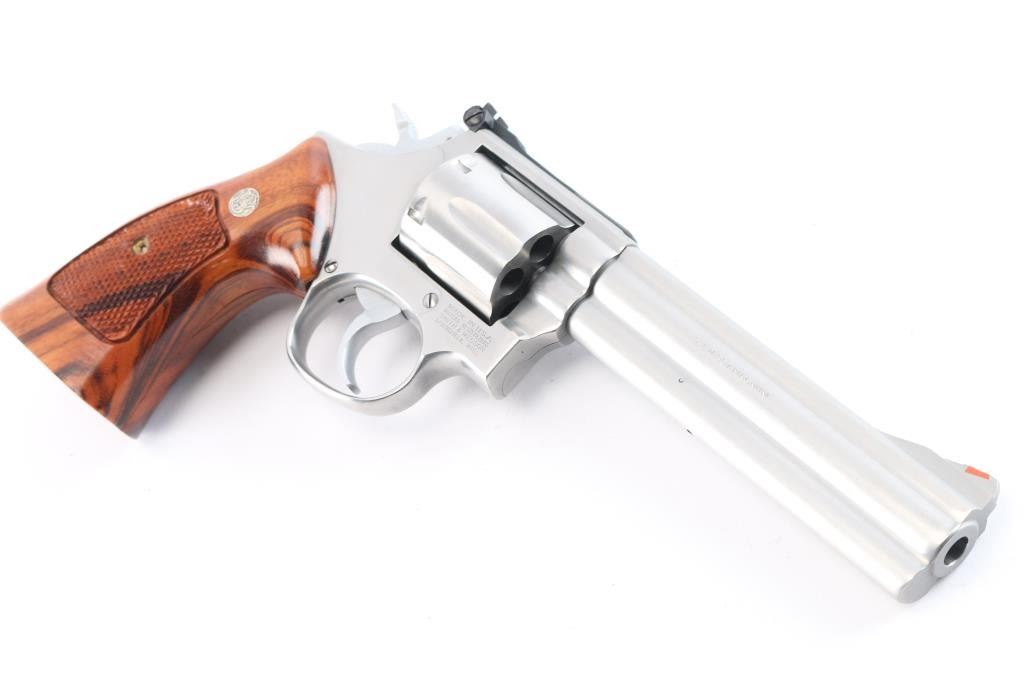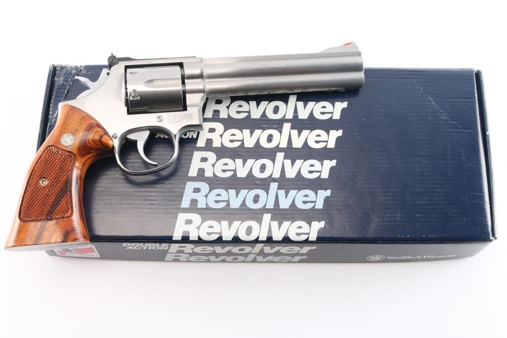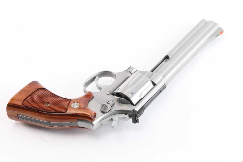 American made six shot revolver chambered for .357 Magnum ammunition. Built on the L target frame. It features stainless steel construction with a 6" barrel, fluted cylinder, full underlug, smooth trigger, serrated blade front sight with orange insert, adjustable rear white outline sight on serrated sighting rib, knurled hammer spur and cylinder release, smooth trigger. Magna checkered walnut target grips with S&W medallions. Metal finish is near excellent with a faint drag line on the cylinder. Bore is excellent/bright. Action is smooth with tight lock-up. Grips are excellent. Comes with original blue factory box with matching label, owners manual and cleaning gear