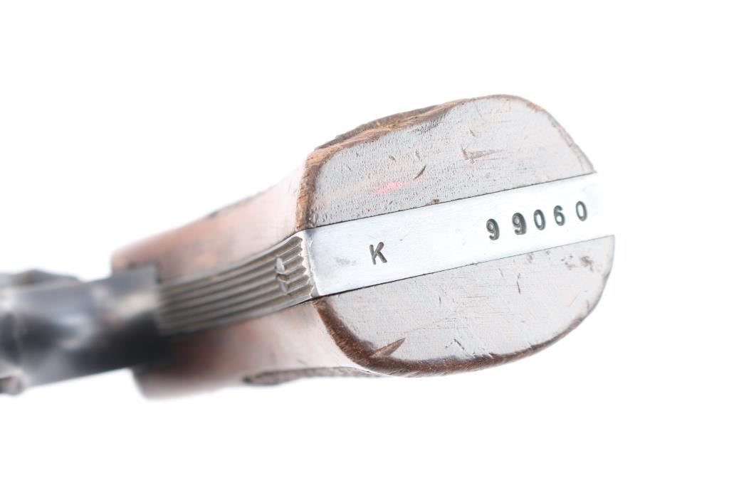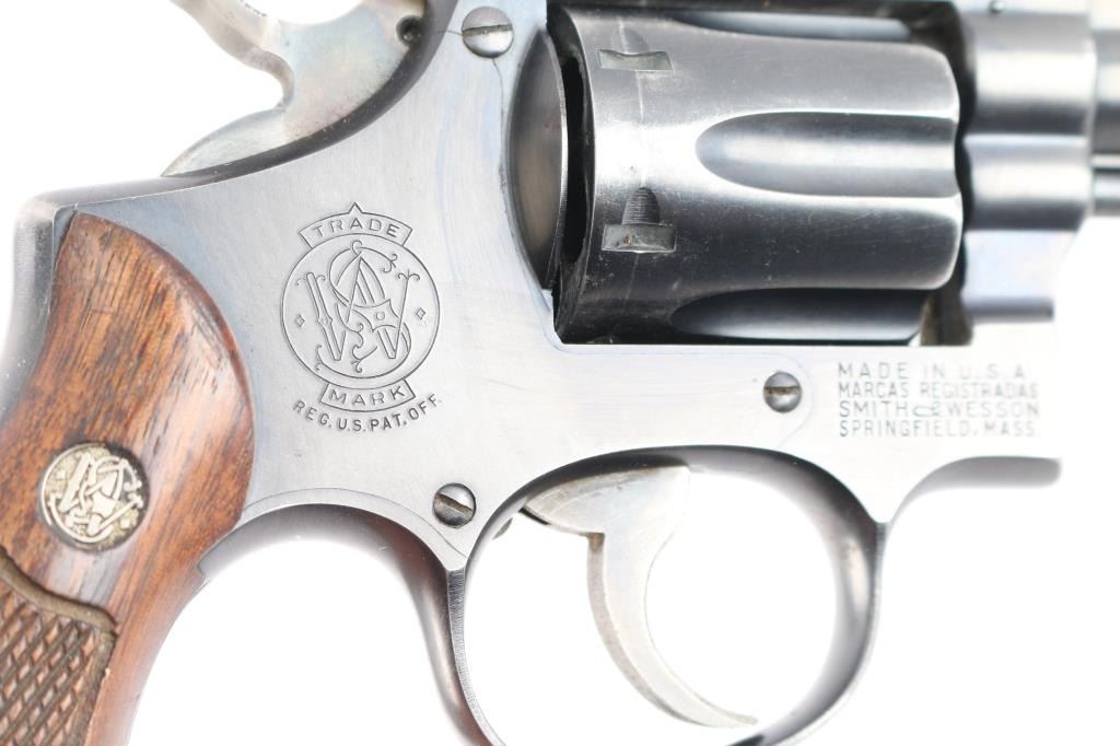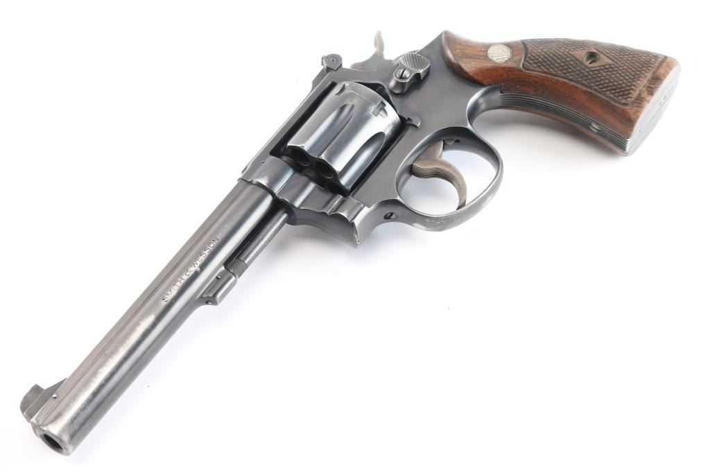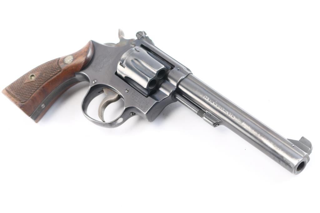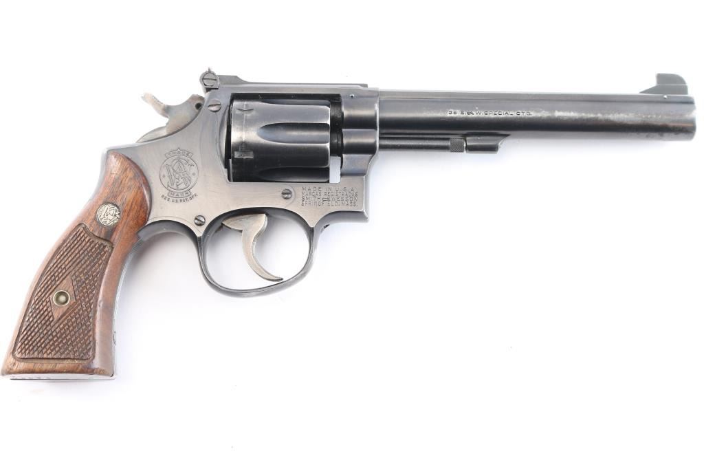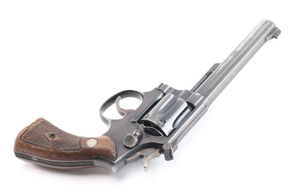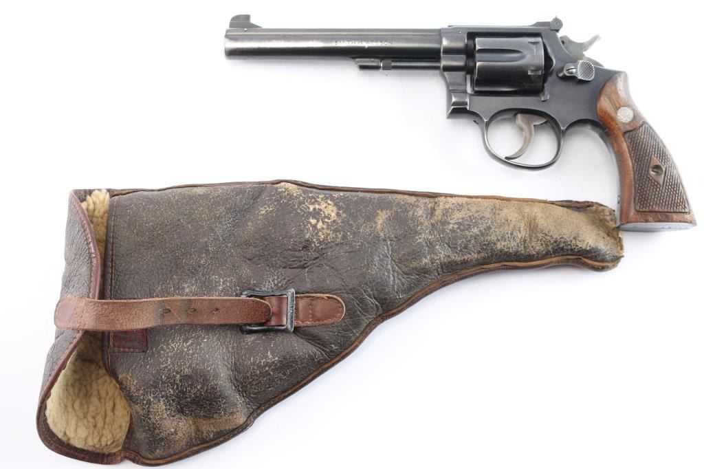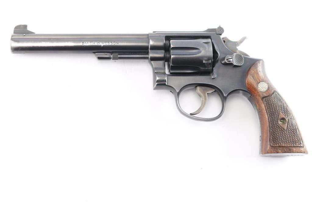 #K99060 ‘Pre-Model 14’ Medium frame double action revolver, manufactured 1950. Blued finish, 6” pinned barrel with serrated sighting rib, pinned & raised patridge front sight, adjustable rear sight, non-shrouded ejector rod, fluted six-shot cylinder, case hardened & serrated .265” trigger with adjustable stop, case hardened .375” hammer, five screw square butt K target frame with six grove grip straps and diamond checkered magna grips with silver S&W medallions. Matching serial numbers found on the frame, barrel, cylinder, extractor star, and right grip panel. Includes a vintage L.L. Bean leather holster with sheep skin lining. Revolver retains approximately 80% of its original finish showing holster wear and a small amount of light surface rust. The action is mechanically sound with tight lock up, the bore is excellent, and the matching wood grips are fair to good with wear & losses.
