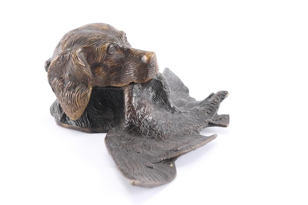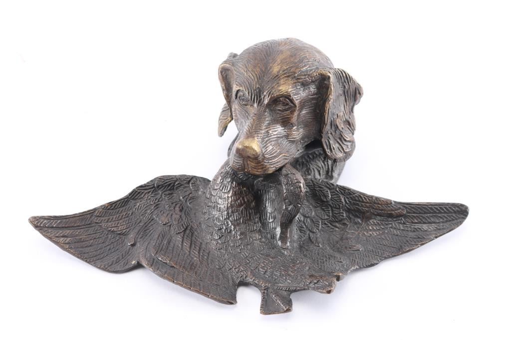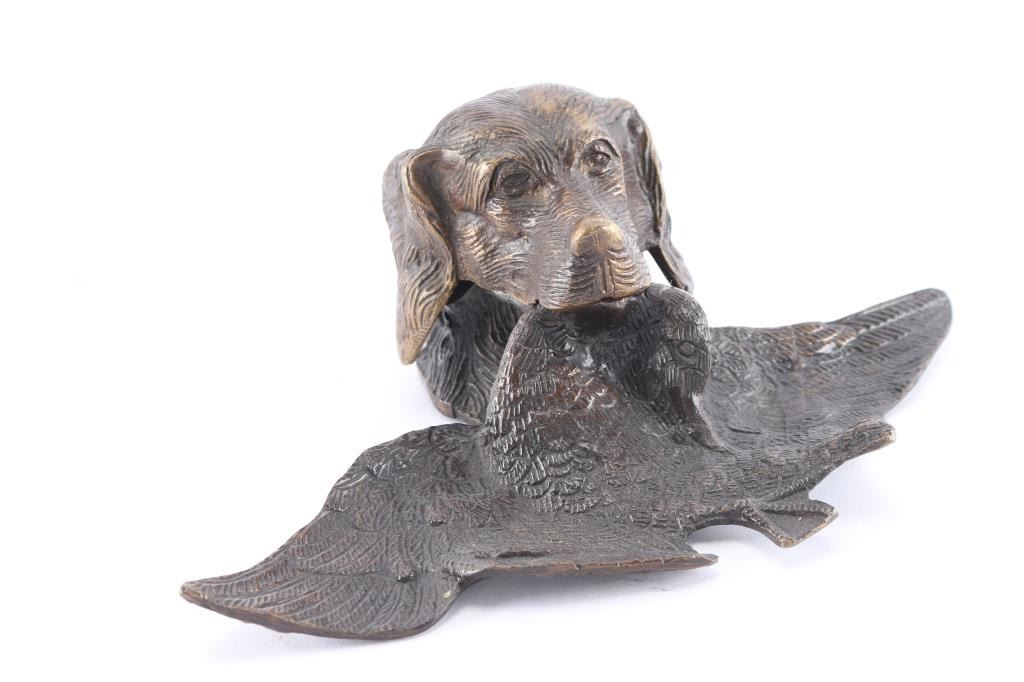 Nicely rendered Spaniel bird dog head with downed goose in mouth. Glass inkwell not original to piece. Measures 3 1/2" tall by 7" deep and 10 3/4" at widest.