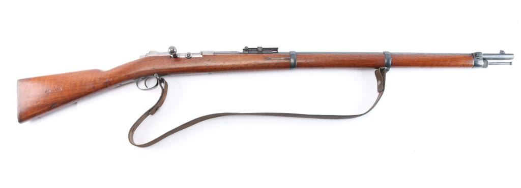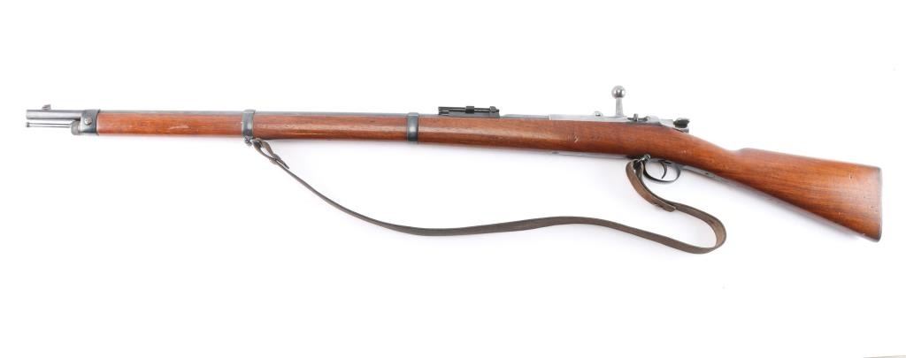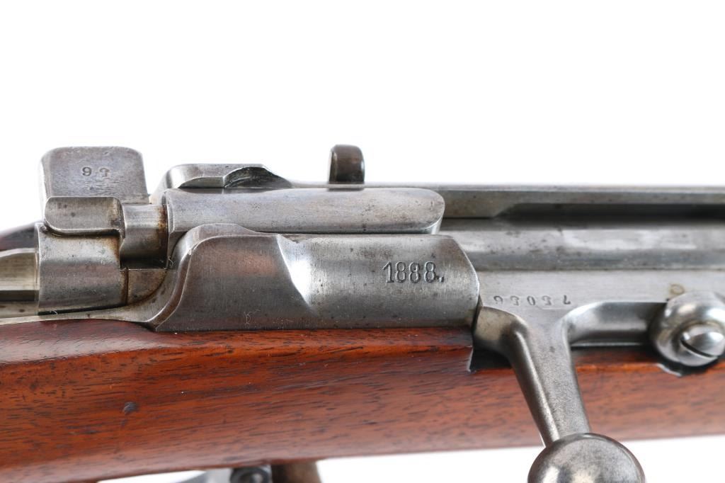 Antique German military bolt action repeating rifle chambered for 11x60mm cartridge. Manufactured at the Amberg arsenal, dated 1888. Features a 31.56 inch barrel and tubular magazine holding 8 rounds. Straight bolt handle and blued steel trigger guard. Bore is bright with strong crisp rifling, Receiver, bolt, and buttplate remain in the white with a clean unmarked appearance. Blued parts show even and strong bright bluing. Wood is very good with some of the usual military dings & dents, tight fit between wood and metal. No visible import marks. Has regimental mark on buttplate, "B.1 R.E.4. 26" suggests the 1st Company of the 4th Replacement Unit. It may have supplied men to the 26th Infantry Regiment,. All manufacturer and proof marks are strong and crisp; all observed numbers match including the small parts & screws. Stock has many imperial proofs. Comes with a vintage brown leather sling, no issued with this rifle.