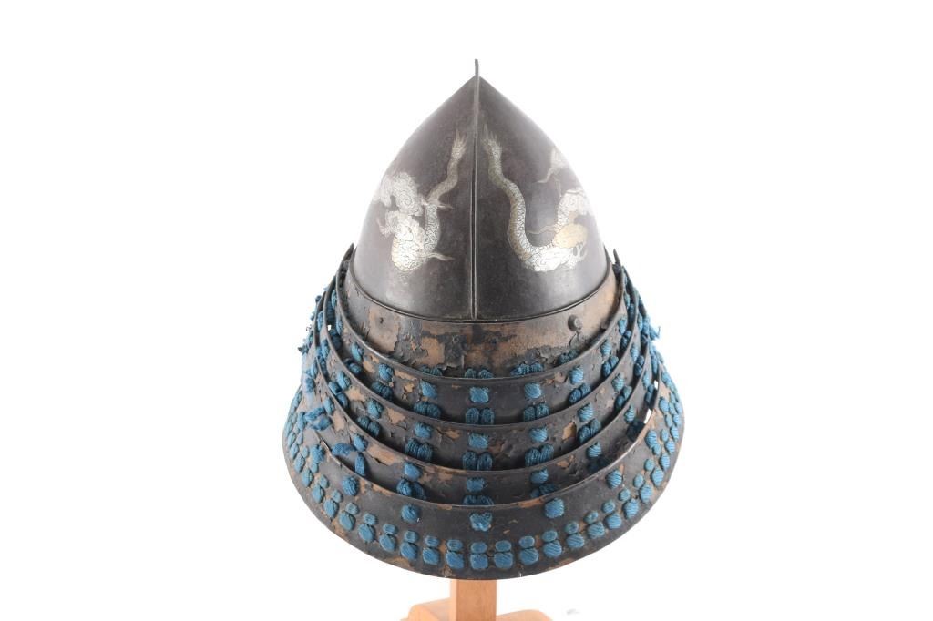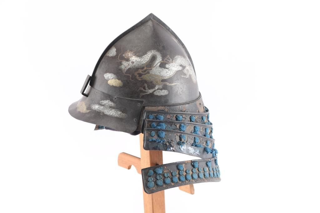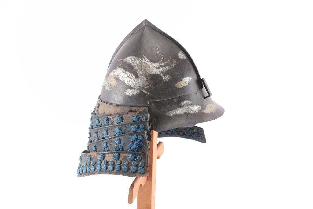 Early Edo period (1603-1868) inlaid iron Momonari (Pearh shaped) helmet (Kabuto) The Edo period, also known as the Tokugawa period, was a time of significant change and development in Japan, spanning from 1603 to 1868. Richly patinated russet iron bowl of Momonari form with central raised flange,inlaid in gilt and silver dragons and clouds. Created by two wrought-iron plates, riveted together. The dragon and cloud inlays are damascened (nunome zogan). The dragons contort themselves in a tormented environment of clouds and flames. Four-lame-black-lacquered iron neck guards strung with blue silk cord. the woven liner is present but has separated from the front interior of helmet. riveted iron visor, has a Haraidate fore crest holder for Maedate. The left lower neck guard has separated. Over very good condition for it's age. The detail to the dragons is superb. A true piece of art. Comes with wooden display stand.