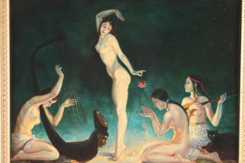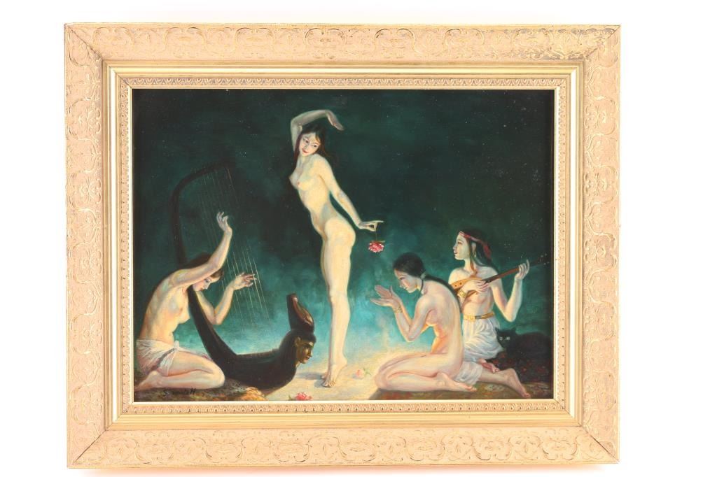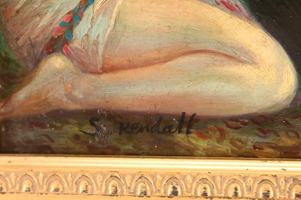 Signed S. Kendall (possibly Sargeant Kendall) in lower left corner. Depicts nude dancers. In gold frame, measures 20" by 15 1/2". Painting measures 15" x 11 1/2".