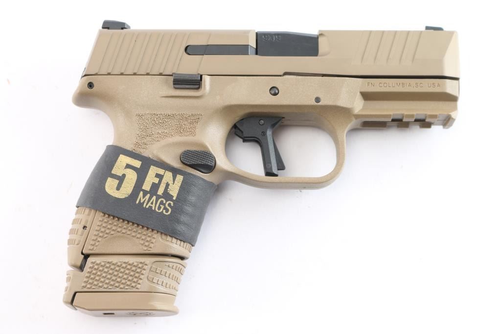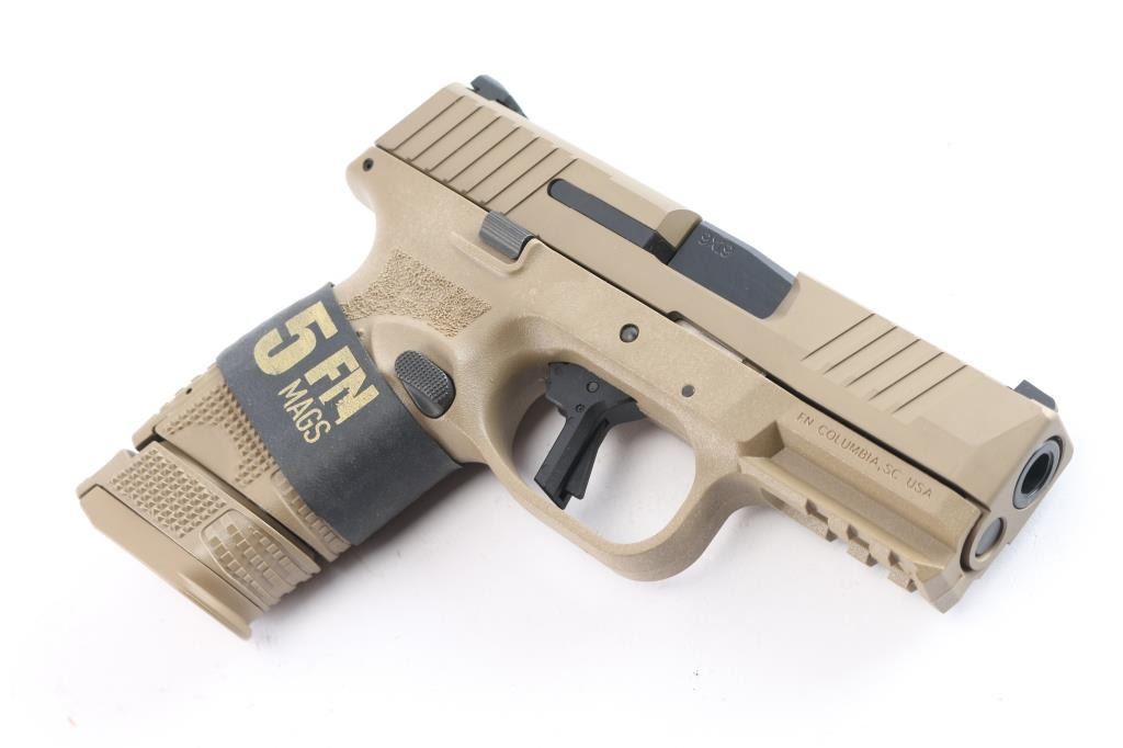 American made striker-fired semi-automatic compact pistol chambered in 9x19mm. Features a FDE finished stainless steel slide with fore and aft cocking serrations, black finished stainless steel 3.7" cold hammer forged barrel with recessed target crown, dovetail mounted steel sights with yellow dot front & black square notch rear, flat-face trigger with integrated safety, ambidextrous slide stop, ambidextrous push button magazine release, factory 12 round magazine with finger rest floorplate, and FDE polymer frame with integral accessory rail, checkered grip & interchangeable backstrap. Includes the original factory box with soft case, manual, lock, additional backstrap, an OEM 15 round magazine with grip extension and three OEM 24 round magazines. Pistol retains approximately 99% of its original finish showing minor wear on the barrel hood. The action is mechanically sound, the bore is excellent, and the polymer is excellent.