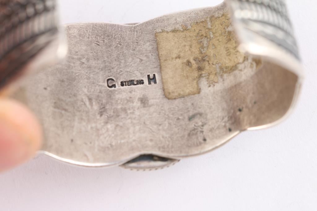 Maker marked "C. sterling H". Large center oval turquoise stone bookended by two smaller oval turquoise stones with two smaller coral stones on outside of chiseled and stamped design in sterling silver. Measures 7 1/2" with gap.
