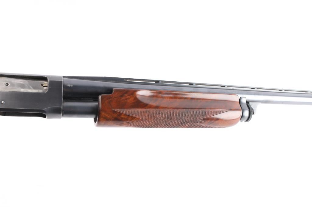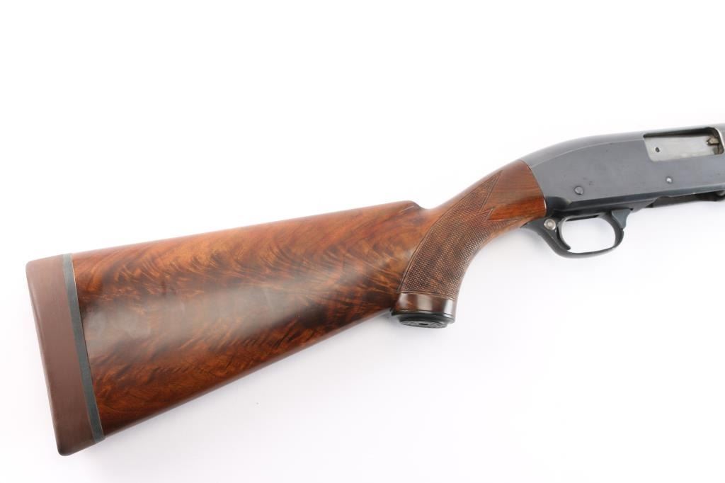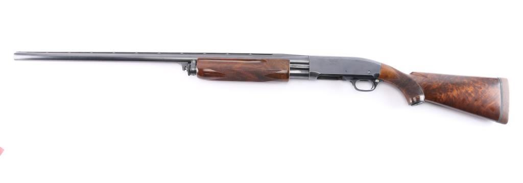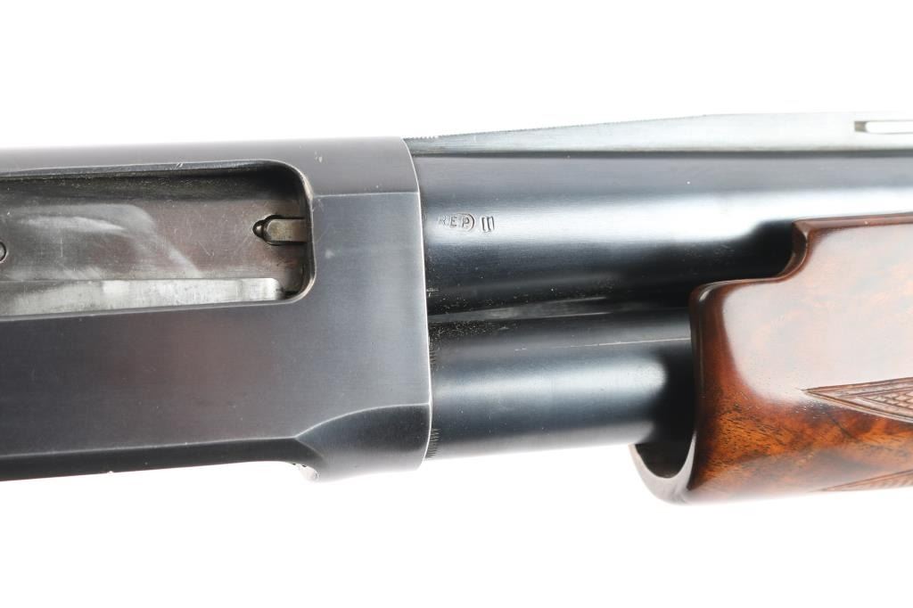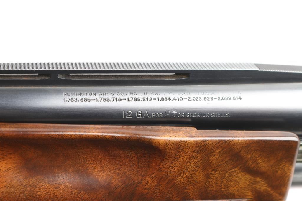 Rare Remington 31-TC (Trap, C grade wood). Production run from 1931 to 1949. 30" vent rib barrel with steel sighting bead and mid bead, 1/2 length tube magazine, blue finish, C-grade" American walnut "fancy" grain pattern stocks with checkered panels on grip and forearm, factory grip cap and solid rubber recoil pad, push button safety. 2 3/4" chamber, fixed full choke, LOP-14 1/4". Bore is excellent/bright, wood is excellent, action is smooth and the blue is about 85% with edge wear. minor scratches and friction wear on the tube and action bar. Manufactured 1948.