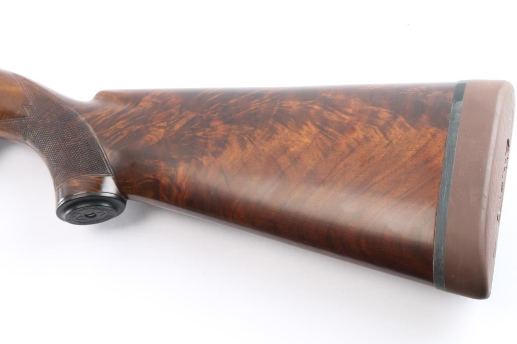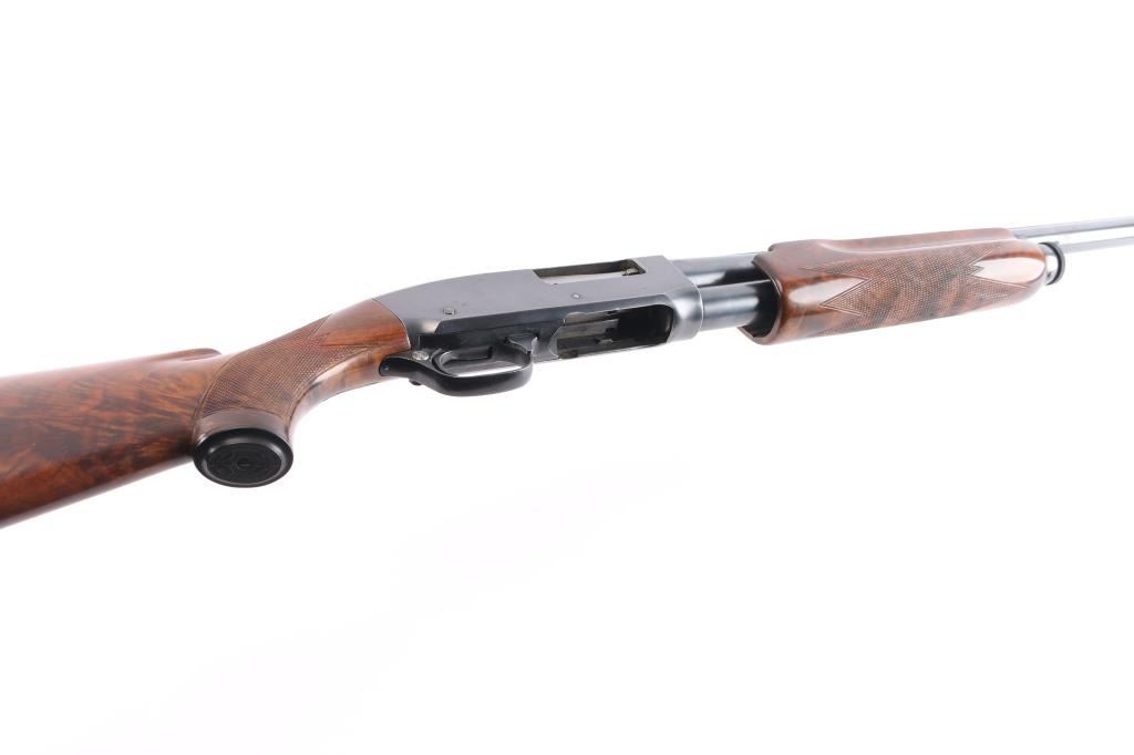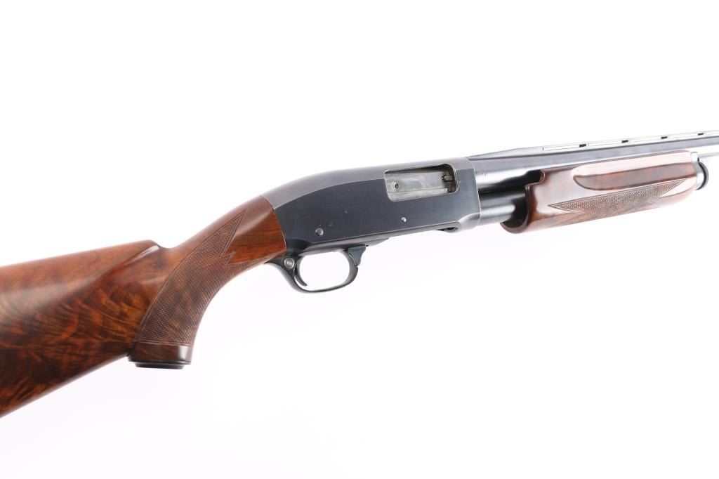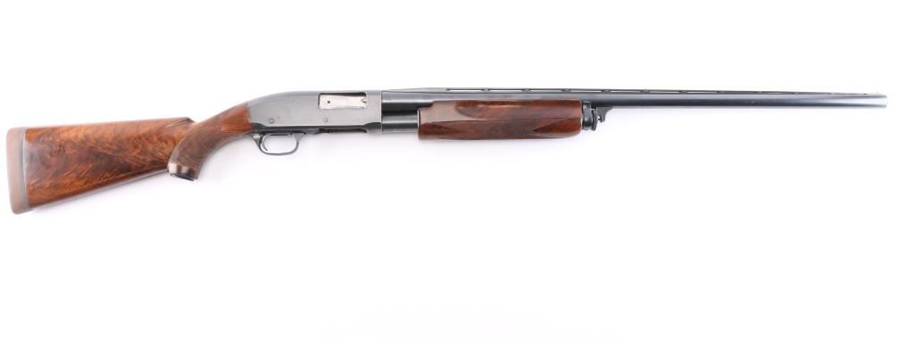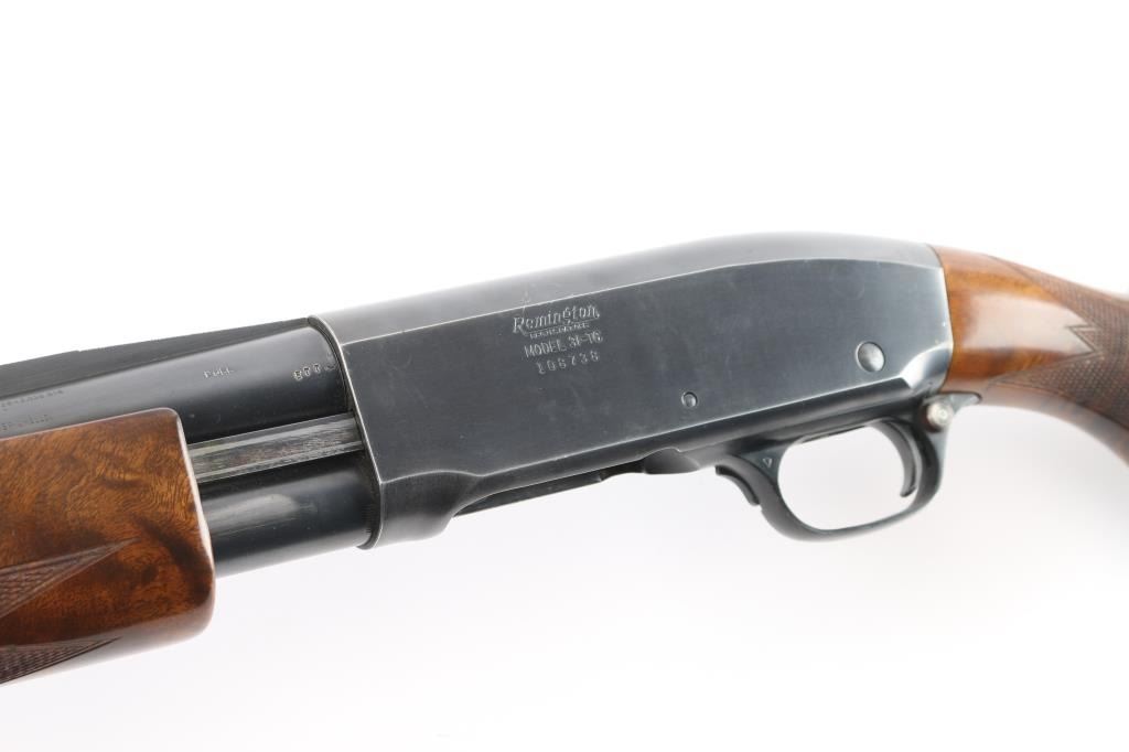 Rare Remington 31-TC (Trap, C grade wood). Production run from 1931 to 1949. 30" vent rib barrel with steel sighting bead and mid bead, 1/2 length tube magazine, blue finish, C-grade" American walnut "fancy" grain pattern stocks with checkered panels on grip and forearm, factory grip cap and solid rubber recoil pad, push button safety. 2 3/4" chamber, fixed full choke, LOP-14 1/4". Bore is excellent/bright, wood is excellent, action is smooth and the blue is about 85% with edge wear. minor scratches and friction wear on the tube and action bar. Manufactured 1948.
