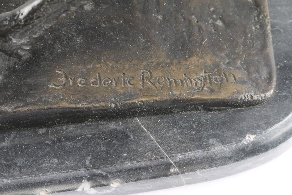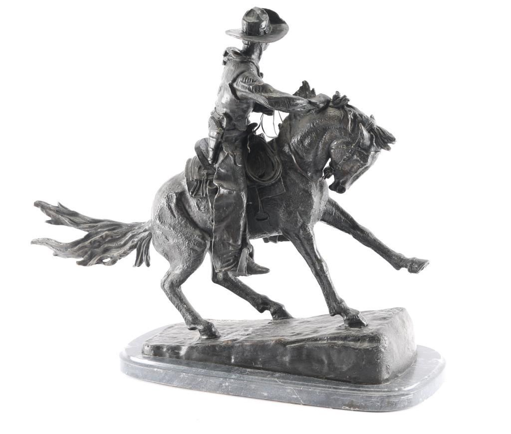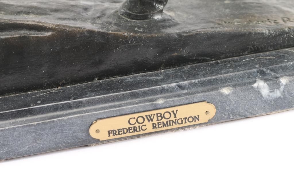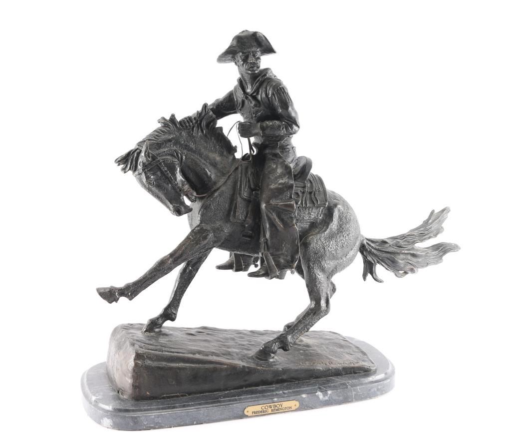 Nice Frederick Remington reproduction of cowboy in chaps on horse. On black marble base measuring 19" by 9 1/2". Measures 23" tall. CANNOT BE SHIPPED; LOCAL PICKUP ONLY.
