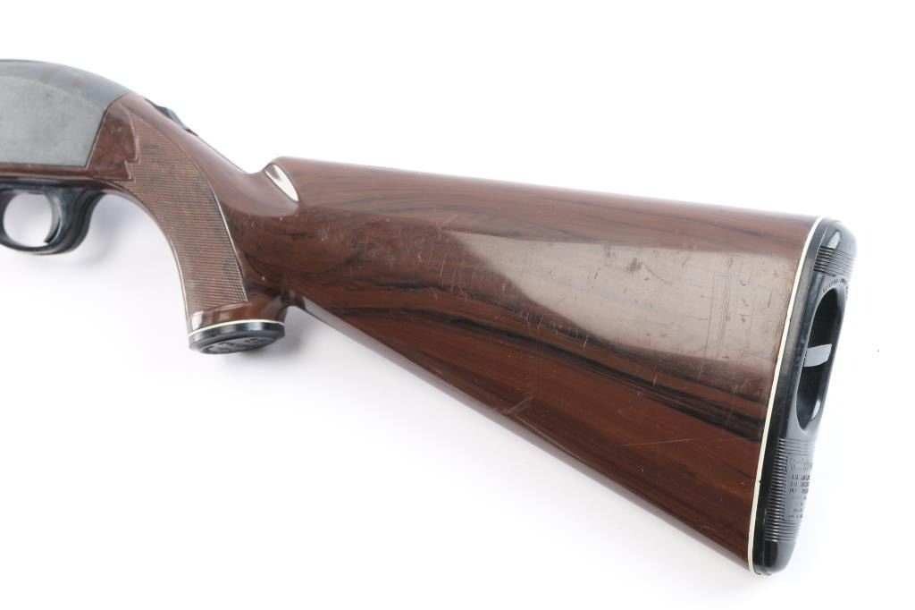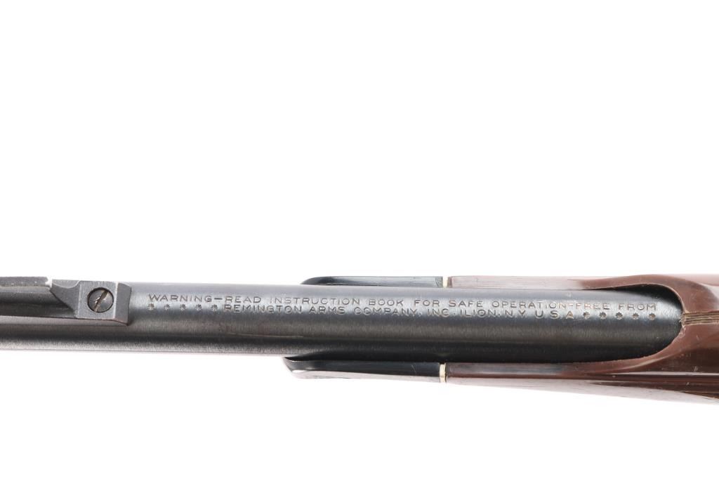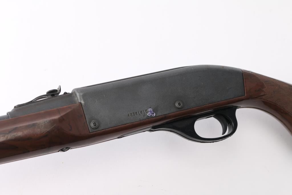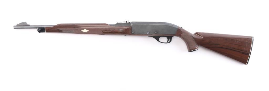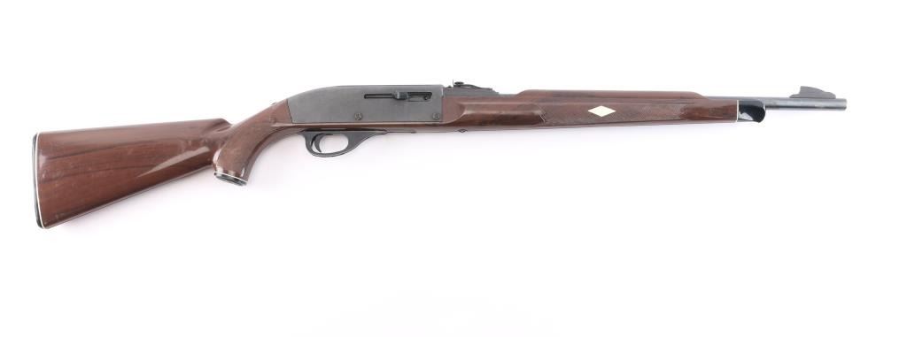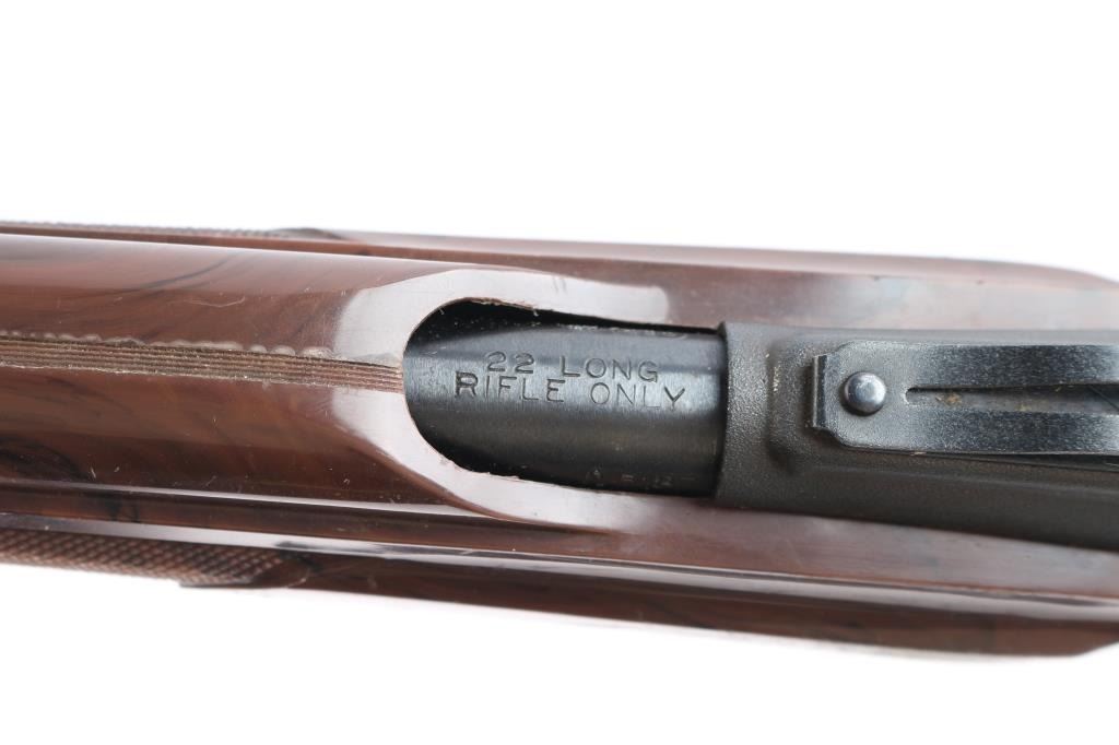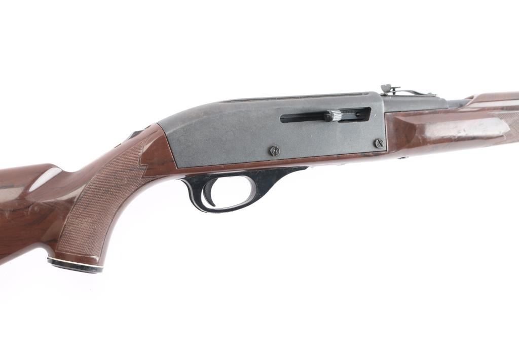 Semiautomatic rimfire rifle. Barrel code dated 1988. Features blued barrel, parkerized receiver , "Mohawk Brown" polymer stock, 19.5" blue barrel, parkerized receiver, large blade front sight, adjustable rear sight, sliding tang safety, tube magazine in butt, grooved trigger, plastic trigger guard and integral scope base machined into receiver. Bore is pristine. Retains about 90% finish on metal, with minor scratches/scuffs. Polymer is overall very good/sound with minor scratches. There is a small solder repair next to the serial number. Manufactured 1976.