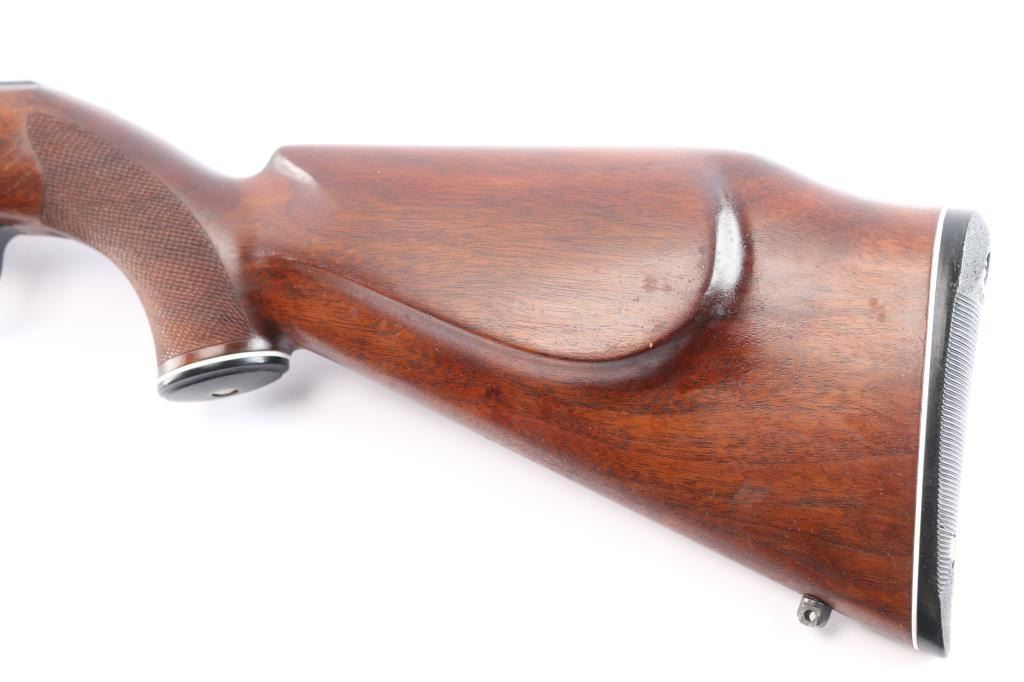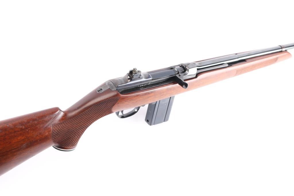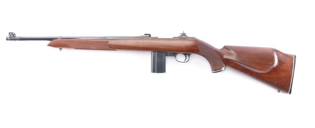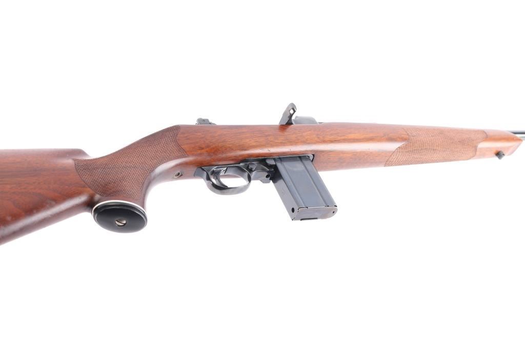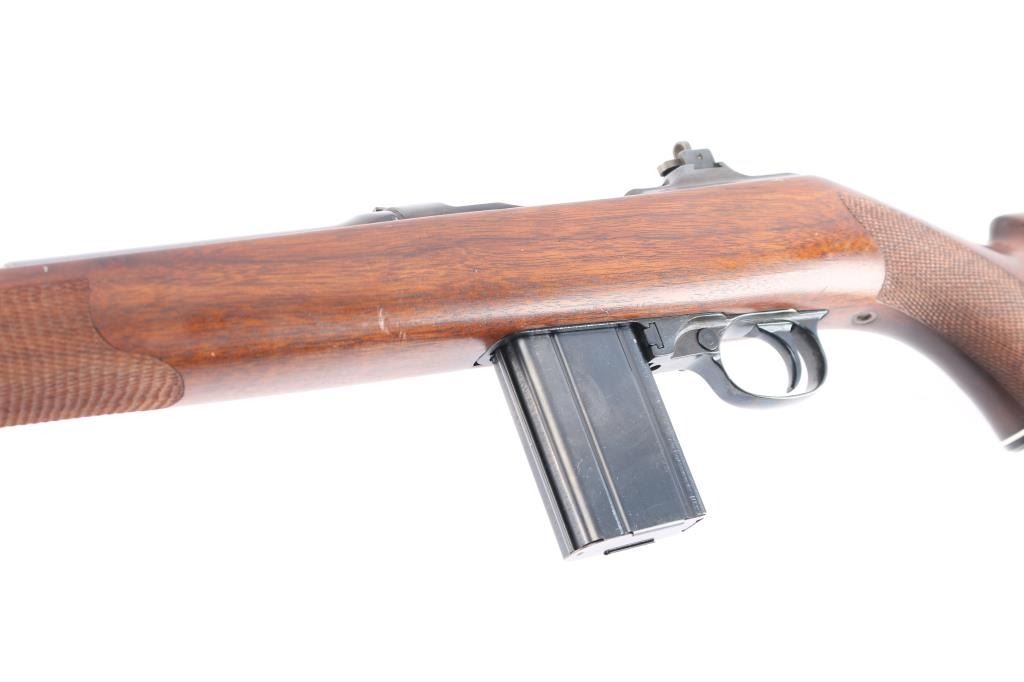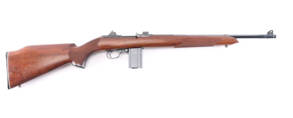 Sporterized U.S. military semi-automatic service rifle chambered in .30 Carbine, circa 1942. Features a bright reblued finish, 18" Underwood barrel, winged blade front sight, flip-up dual aperture rear sight, push button safety, 15 round magazine, smooth trigger, flat bolt, no handguard and a fancy Fajen checkered one-piece walnut pistol grip shoulder stock with cheek rest, black grip cap & Fajen buttplate with white spacers, sling swivel studs. Rifle retains approximately 97% of it's blued refinish showing some light wear. Action is smooth, bore is excellent, and wood stock is very good with sharp checkering,