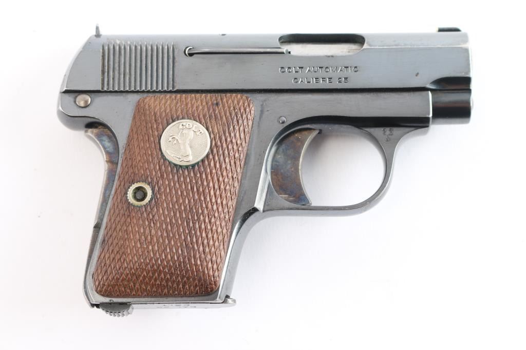 Semi-Automatic. Single-Action. Striker-fired, hammerless, compact. 6-rd capacity. Manufactured 1920. Browning design. Produced 1908-1948. 2' barrel with professionally installed blade/white bead front and u-notch rear sights. Blued metal finish with case-hardened trigger, safety lever, and grip safety. Checkered wood grips with silver color Colt medallions. Bore is excellent/bright. Slide action is smooth/tight. Original blue finish is at least 96% with slight edge wear, case colors are excellent. Grips are excellent. All Markings are crisp/clear. Comes with the original 6-rd magazine marked "Cal .25 Colt", very good condition. Come with a nice brown suede Bianchi clip-on holster.