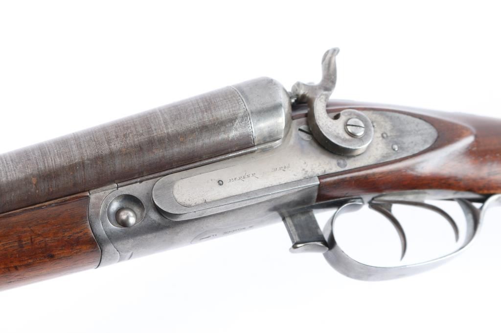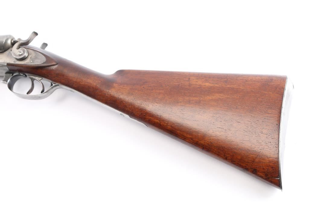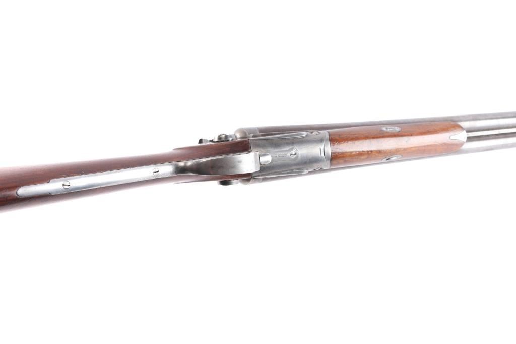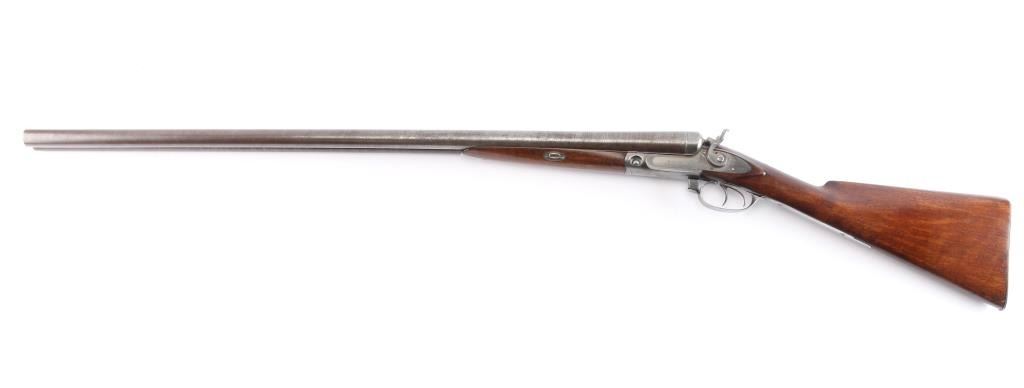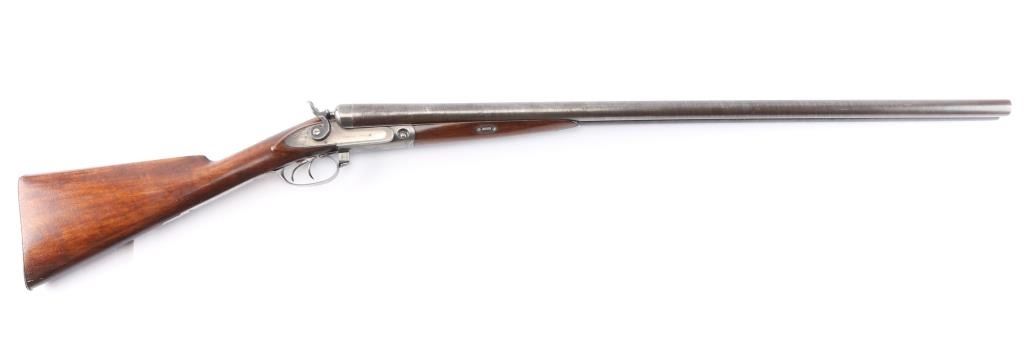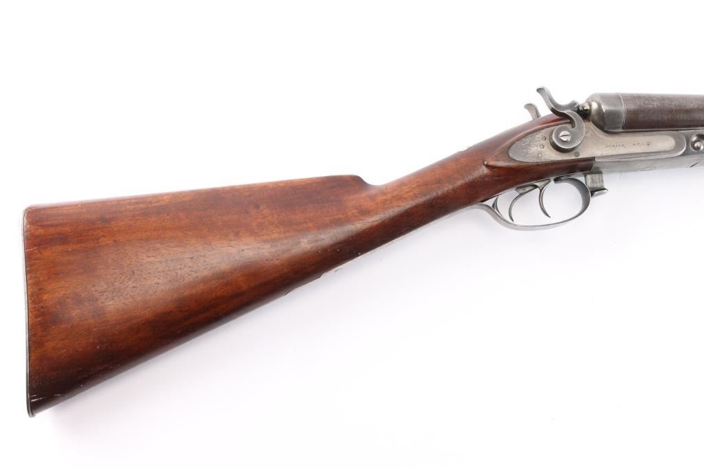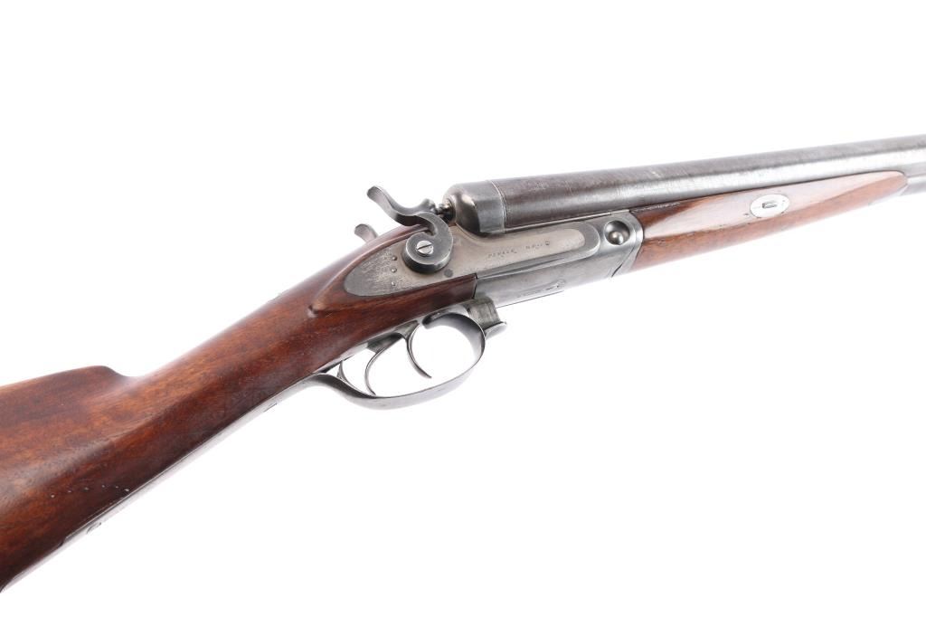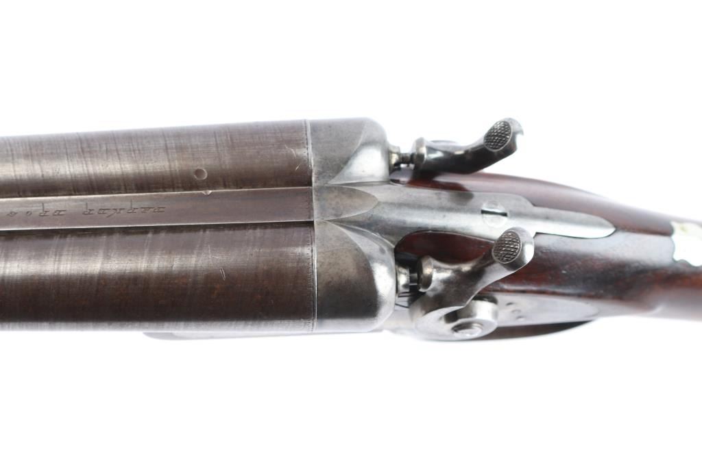 Antique Side x Side double barrel shotgun manufactured 1877. Features 32" damascus barrels, case color action, side locks with exposed hammers, steel bead front sight, double triggers, one piece extractor, push button forward of triggerguard opens action, slender, smooth wood forend, wedge & tenon used to mount forend, wood shoulder stock, straight grip, smooth steel buttplate. German silver initial shield on the top of wrist. LOP 14-1/4" to front trigger, Drop at Comb is 2-3/8", Drop at Hell 2 7/8". Bores are very good condition. Barrel has faded to a brown/gray finish. Action is bright finish with traces of case color. Locks are marked "Parker Bros", rib marked "Parker Bros Maker, Meriden, Conn, Plain Twist". Patent dates Nov 16, 1866, Mar 28, 1875 on upper trigger tang. Serial matched on water table, inside forearm metal and barrel lug. Wood is very good condition, good fit to metal, no observed cracks, has been varnished.. Lockup is tight when action is closed.